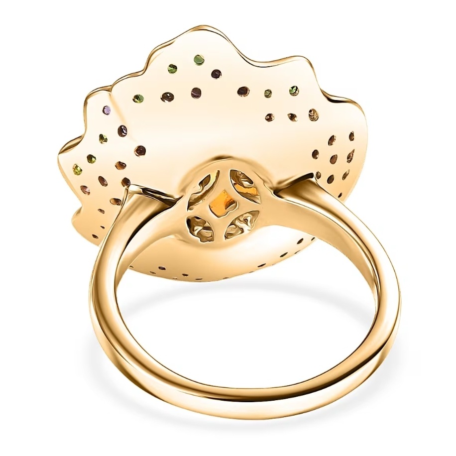 The setting is finished in 18K yellow gold vermeil over sterling silver, adding warmth that ties the colors together. Black rhodium is used around the accent stones to deepen contrast and separate each color section, helping the individual stones stand out within the overall design.