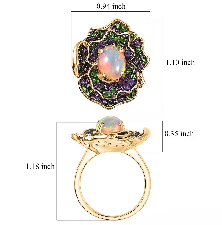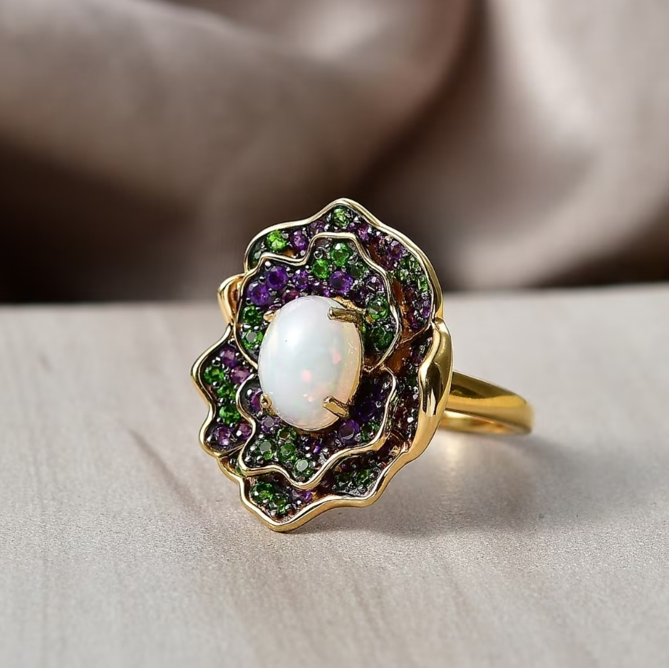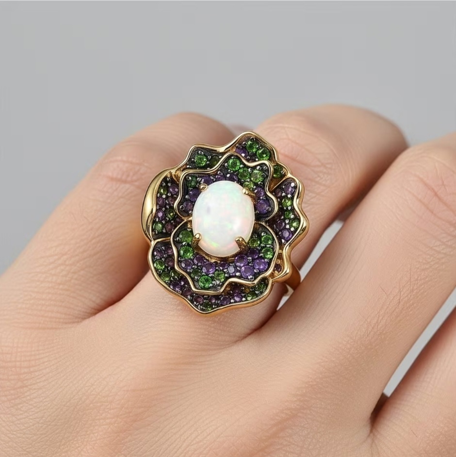 Surrounding the opal, alternating sections of chrome diopside and amethyst form petal-like layers. The deep green diopside adds richness and contrast, while the amethyst introduces a saturated purple tone that balances the composition. The arrangement creates a clear floral outline without feeling overly soft, keeping the design defined and intentional.
