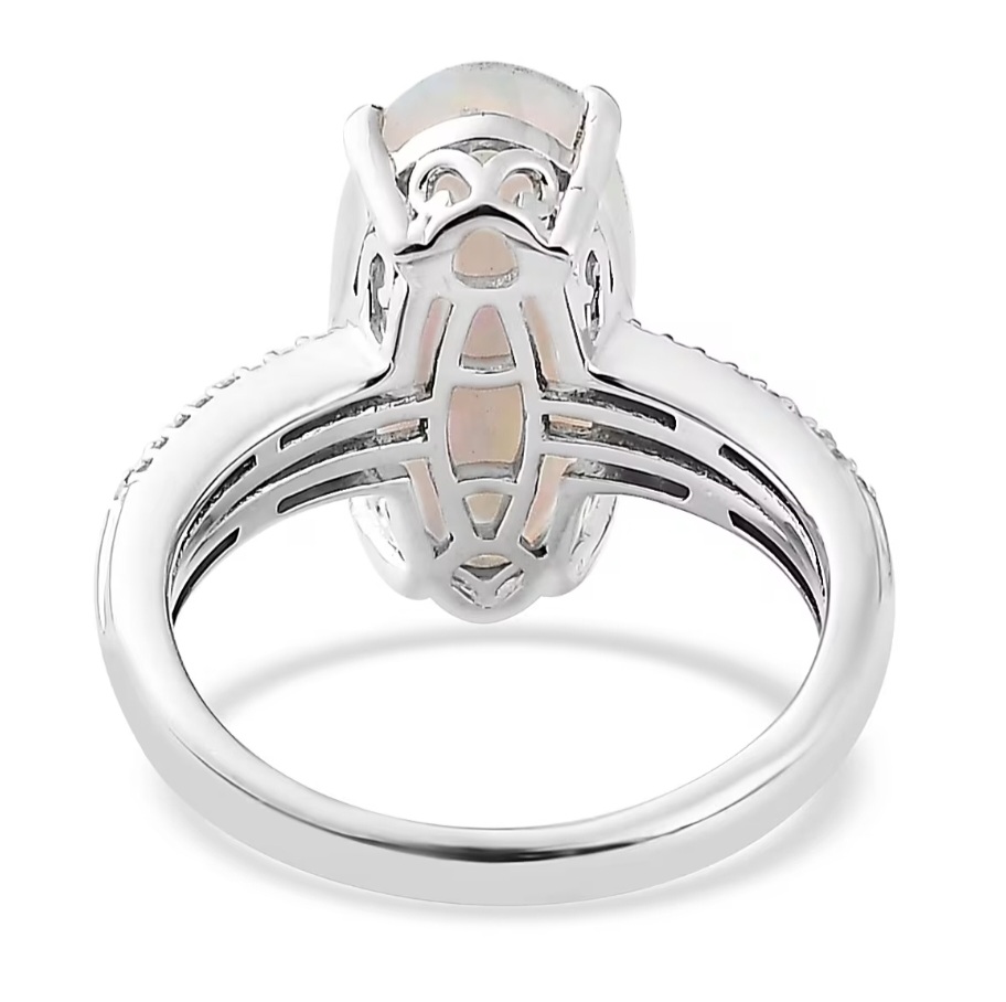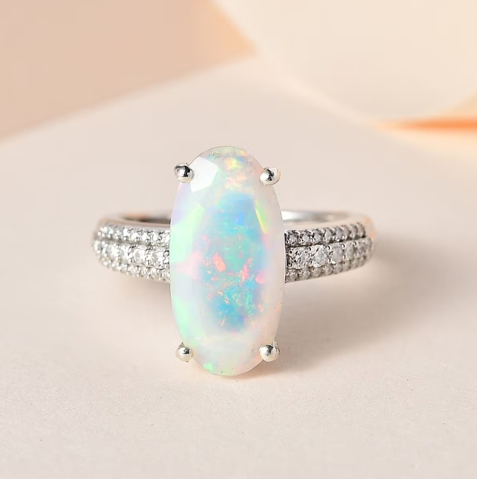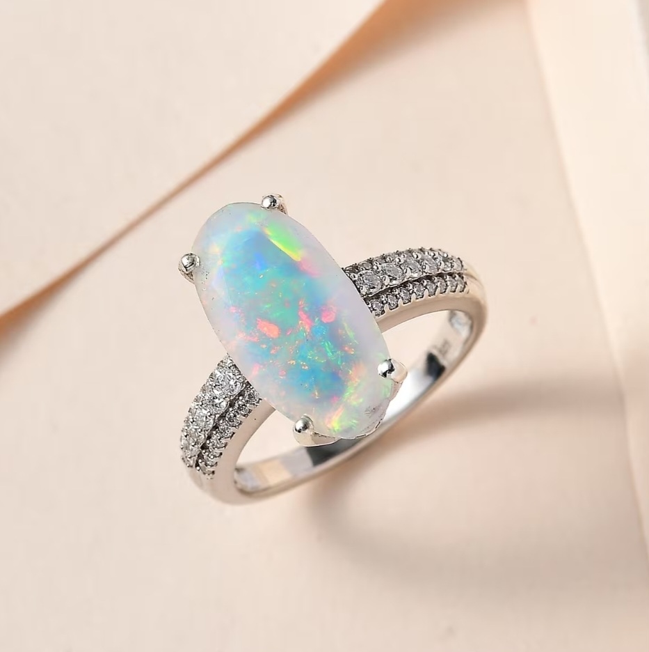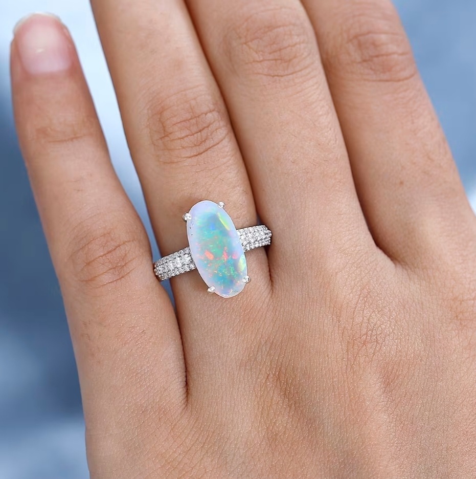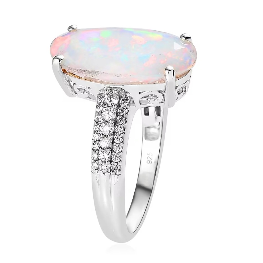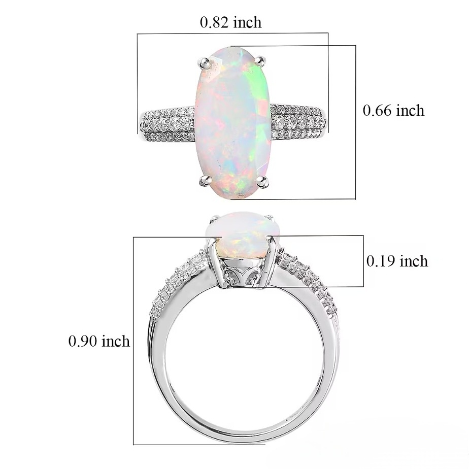 This design centers a faceted 16×8mm Ethiopian Welo Opal, alive with rainbow flashes that shift and burn with every movement. Moissanite accents frame the shoulders, amplifying brilliance against the clean, mirror-bright rhodium finish.