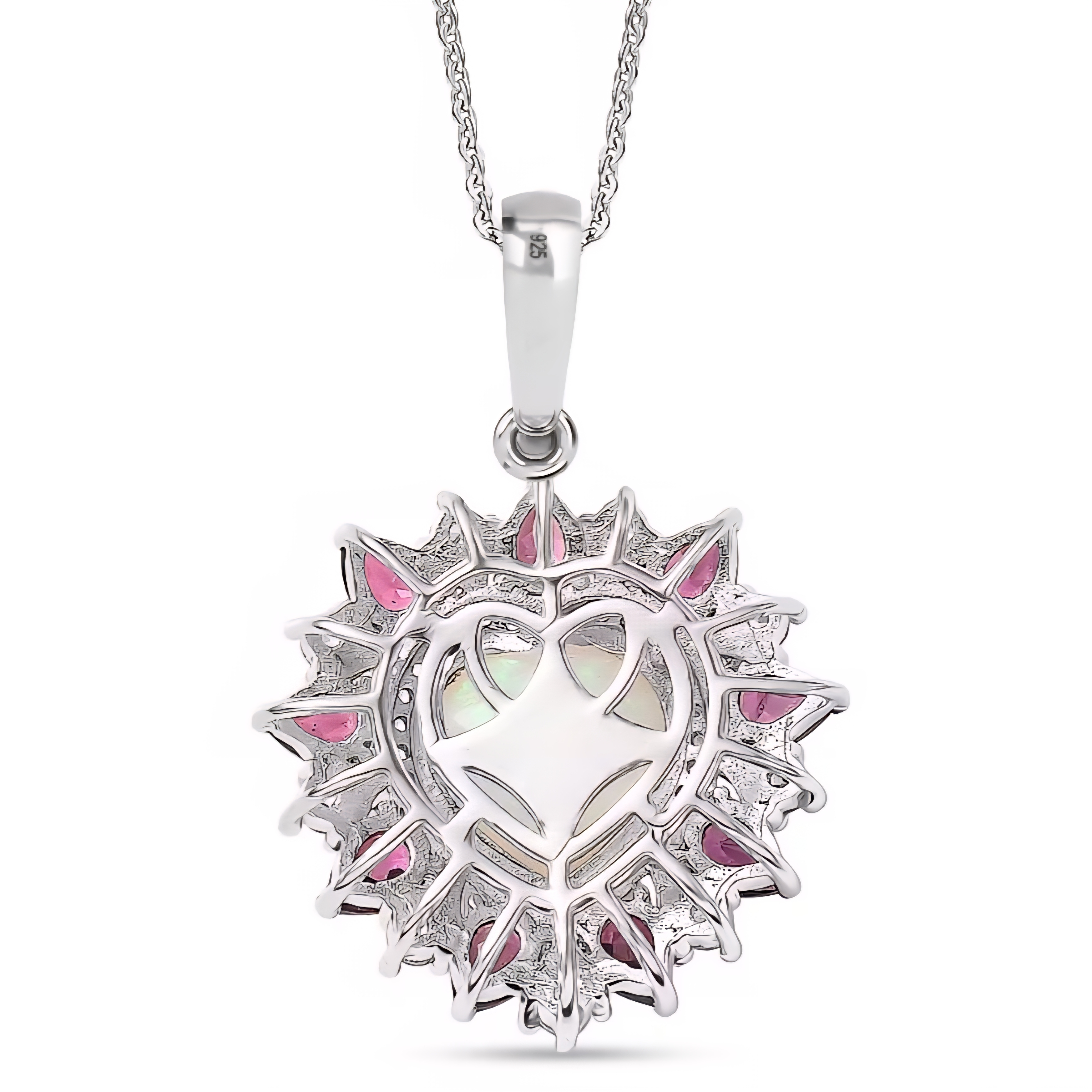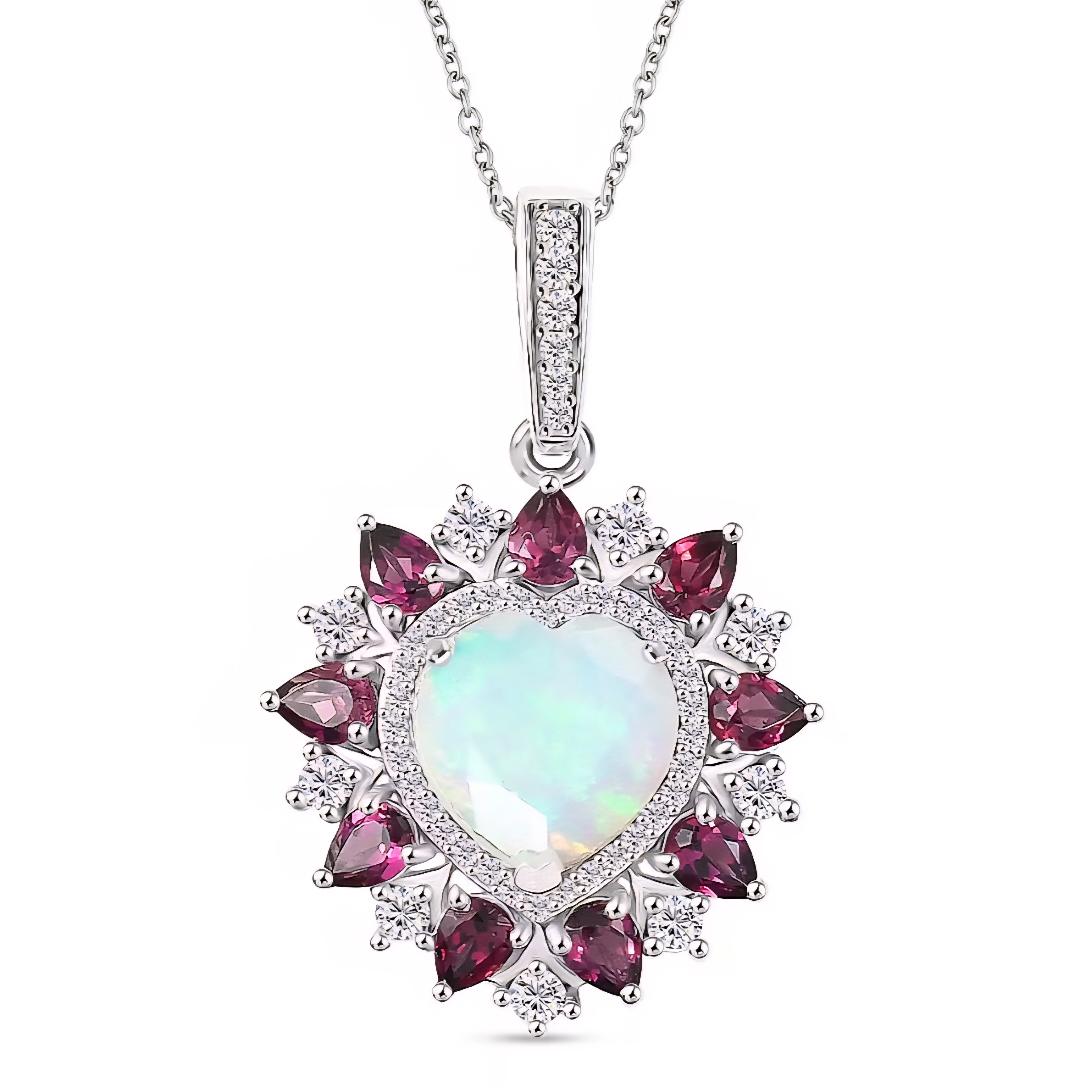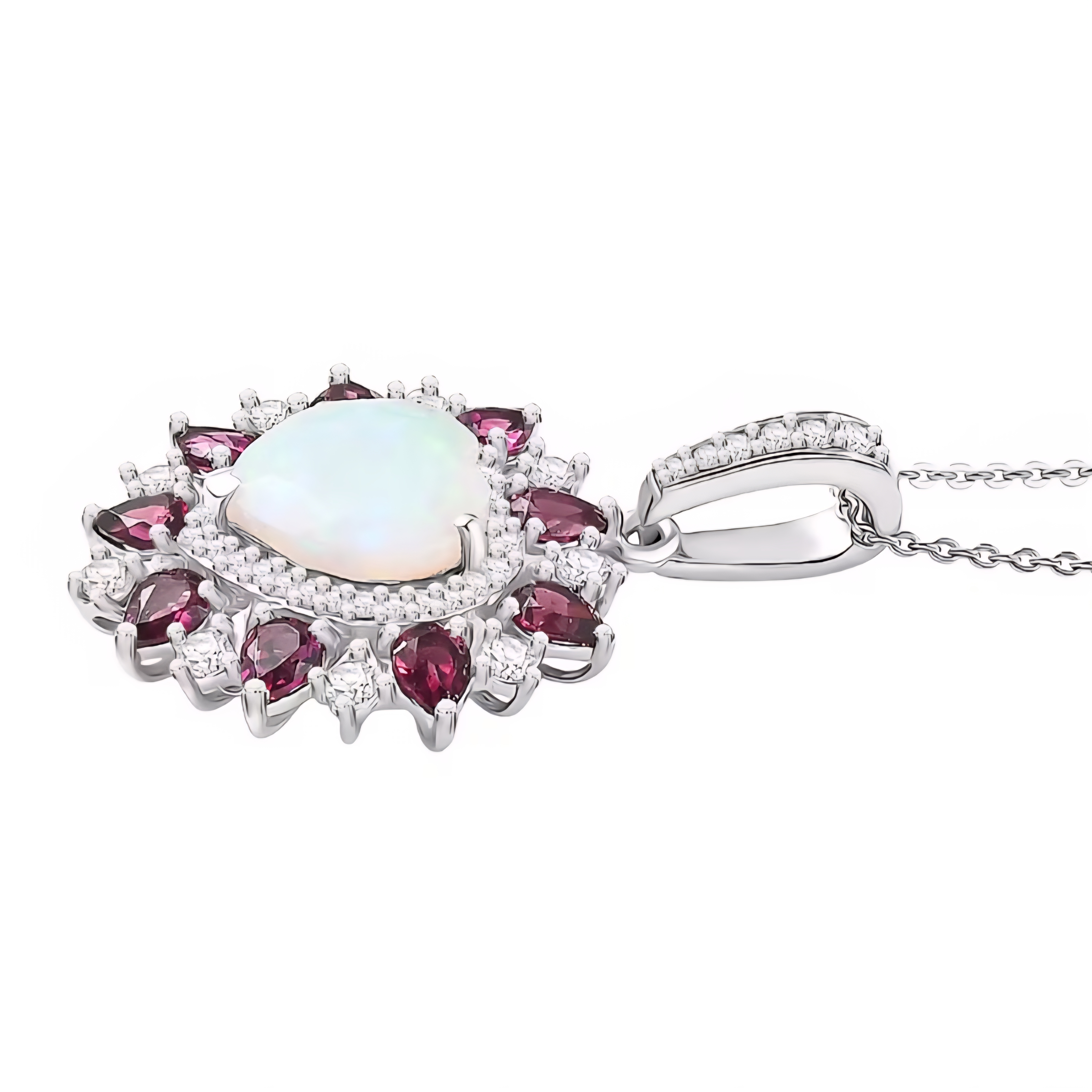 Surrounding the center is a radiant frame of pear shaped rhodolite garnets totaling 1.76 carats. Their rich purple red color forms a striking starburst around the opal, adding depth and bold contrast. Between the garnets, brilliant white zircon accents provide crisp sparkle that highlights the overall design and enhances the pendant’s brightness.