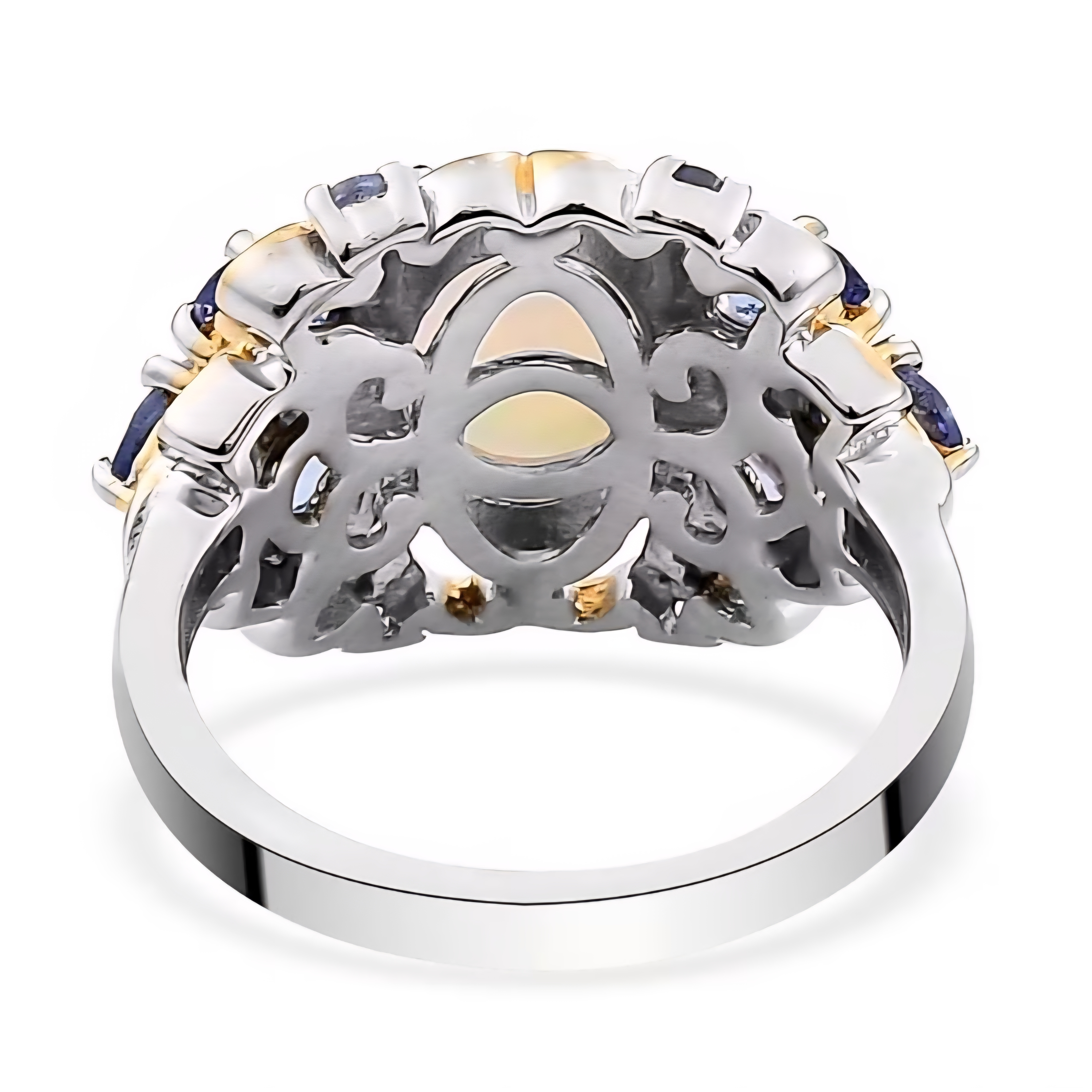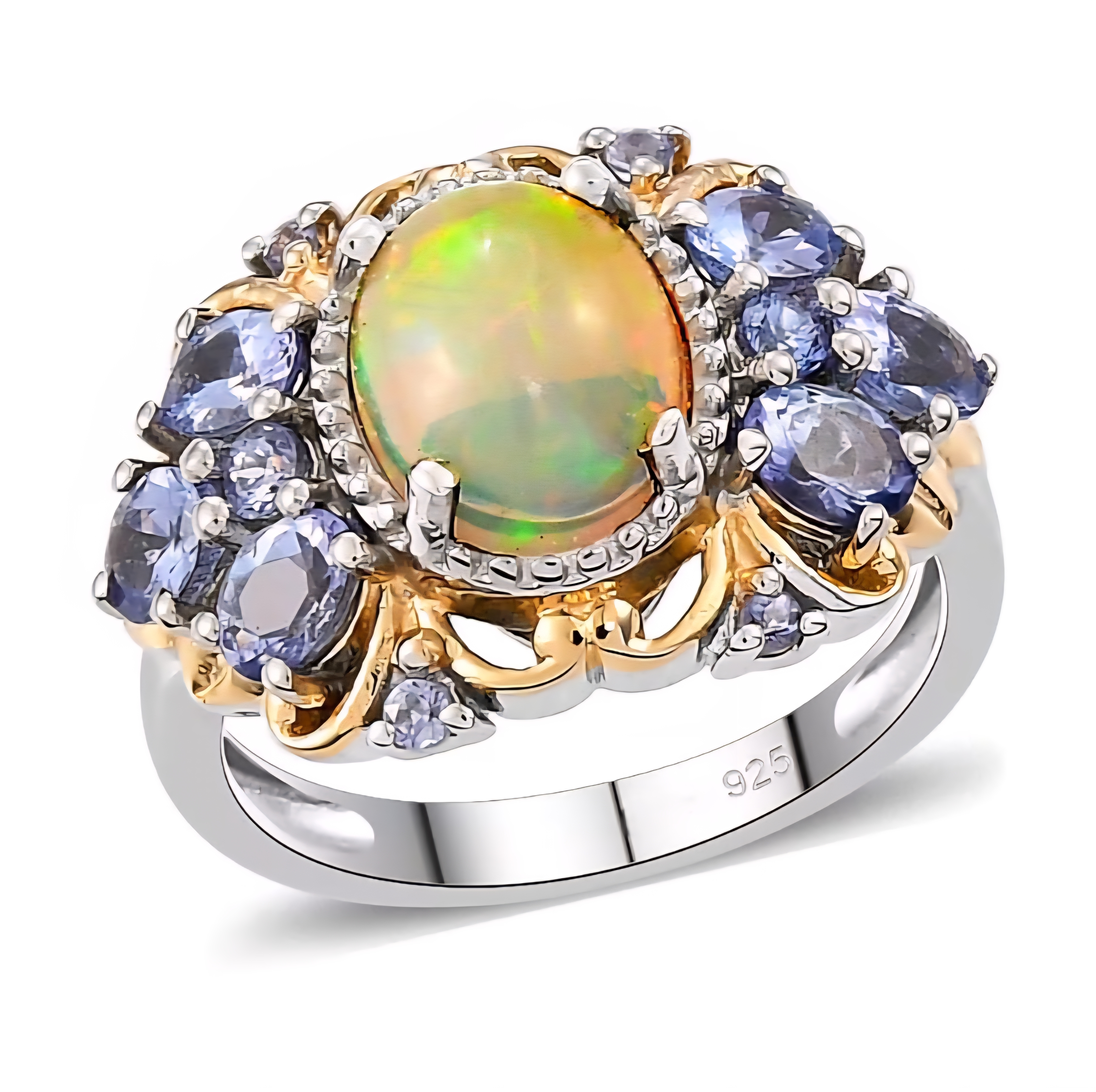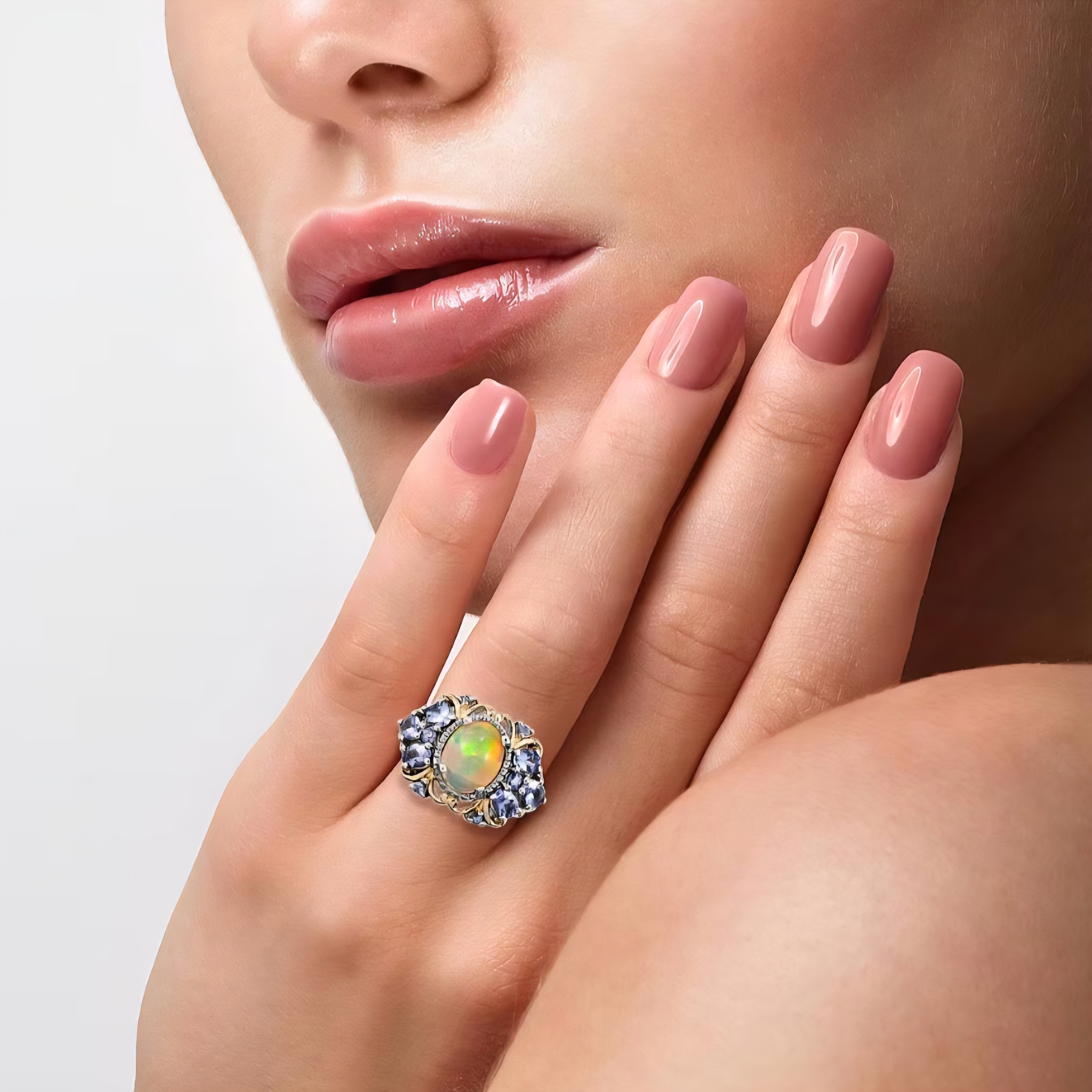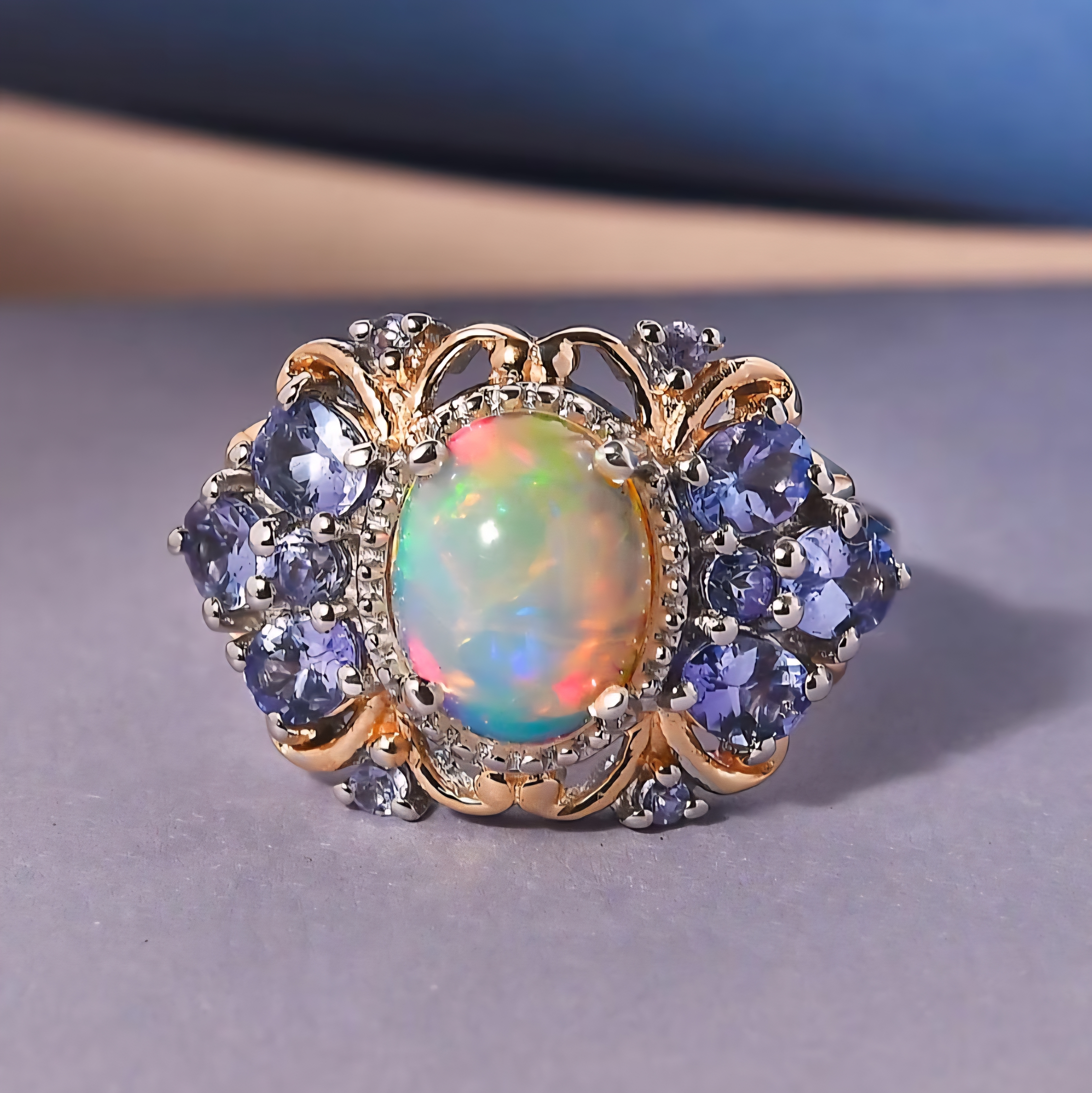 A rare color fusion of fire and ice — Ethiopian Welo opal radiates shifting rainbows of light, framed by rich violet-blue tanzanite in a regal, art-inspired halo. The intricate design adds dimension and grace, while yellow-gold detailing brings out the warmth in the opal’s play-of-color. Hand-crafted in solid 925 sterling silver and finished with dual 18K yellow gold and rhodium plating for depth, brilliance, and contrast.