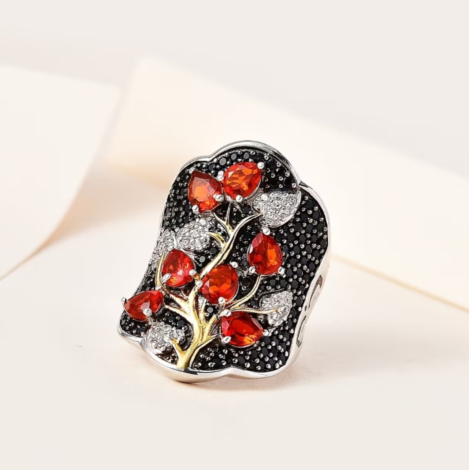 A daring fusion of fire and shadow, this Fire Opal and Black Spinel Cluster Ring commands attention with unapologetic contrast and sculptural depth. The centerpiece — a radiant array of Mexican Fire Opals in rich ember-red and golden orange — ignites with inner warmth, their pear cuts arranged like flickering flames. Encircling them, sleek black spinel stones add an edge of modern sophistication, while white zircon accents punctuate the design with crisp sparkle and light balance. The setting’s two-tone finish — black rhodium layered with 18K yellow gold — enhances every contour, making this piece both an artistic statement and a masterclass in precision craftsmanship.