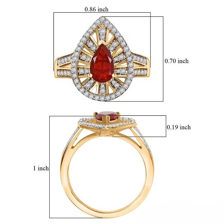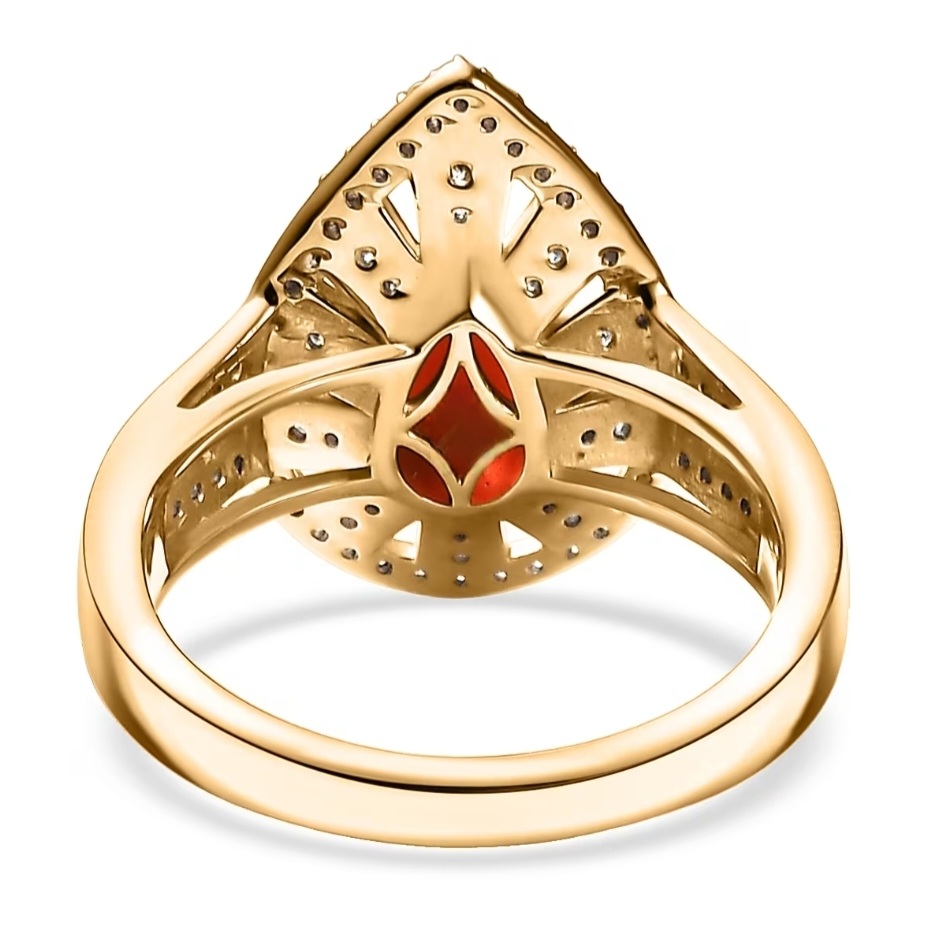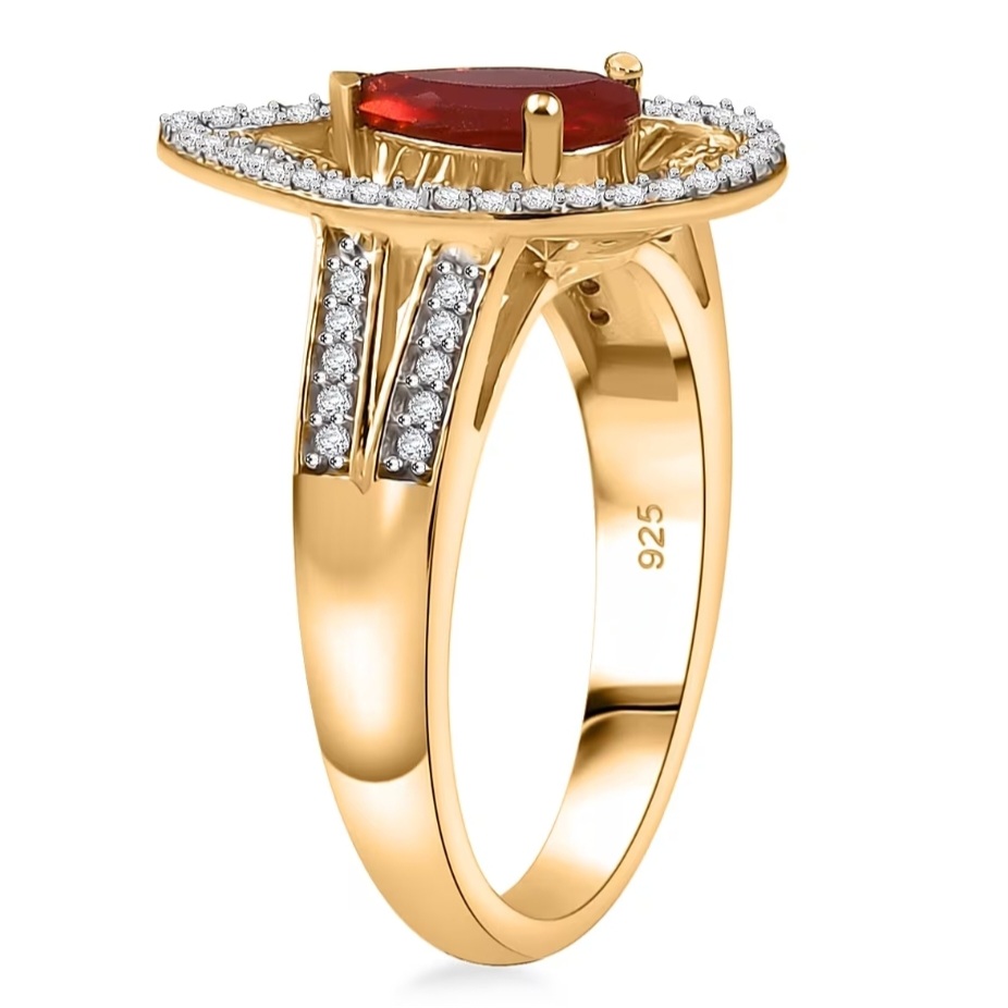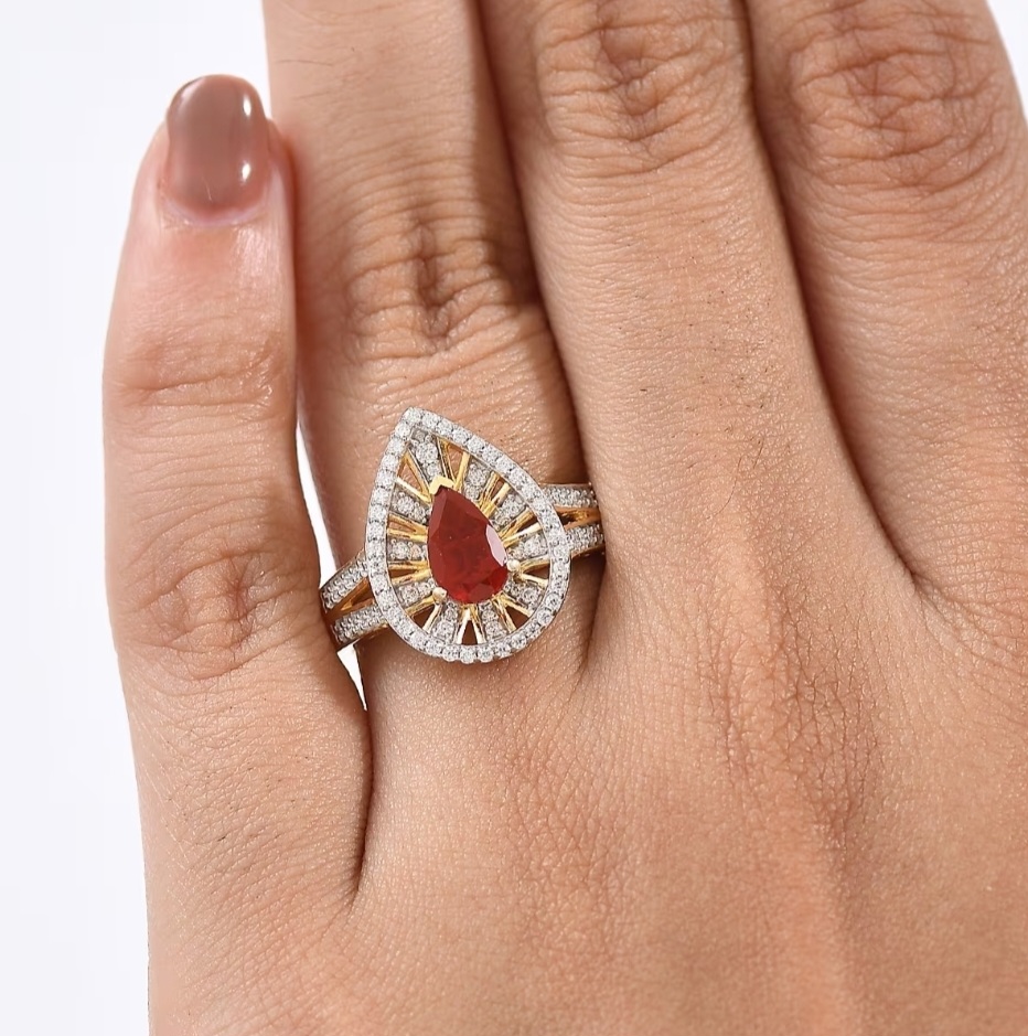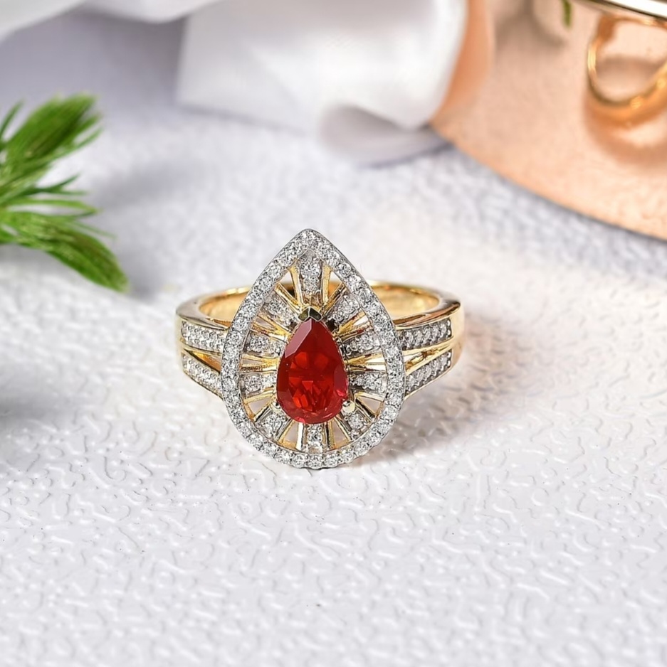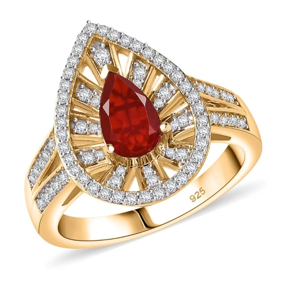 A blaze of color meets refined geometry in this Fire Opal halo ring. The Mexican Fire Opal flashes with deep red-orange brilliance, perfectly balanced within a radiating sunburst of moissanite that amplifies its inner glow. Framed in 18k yellow gold over sterling silver, the split-shank design draws the eye toward the pear center while maintaining symmetry and presence. Each moissanite is precision-set in rhodium-tipped prongs to enhance clarity and fire — a modern expression of bold color and impeccable structure that feels unmistakably elevated.