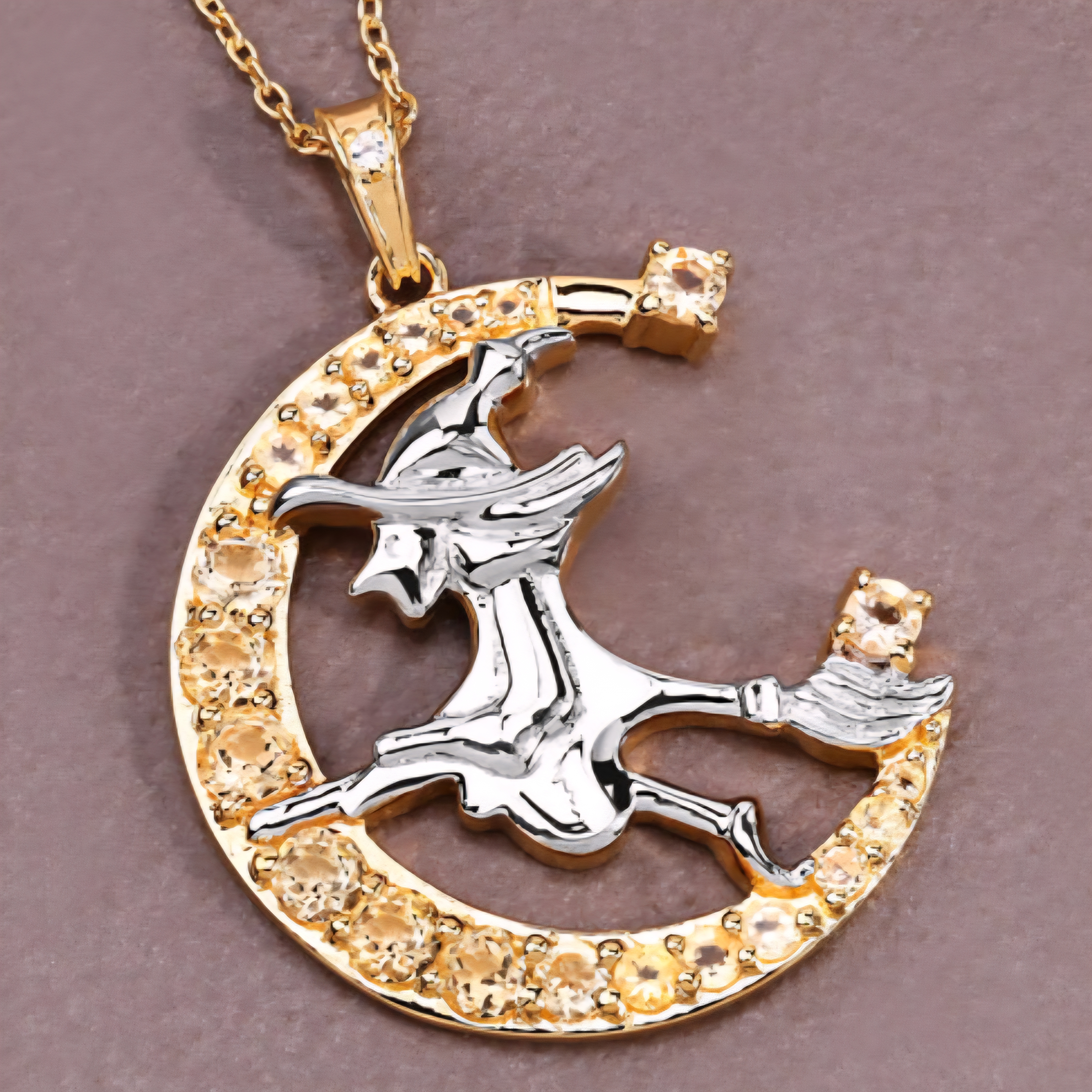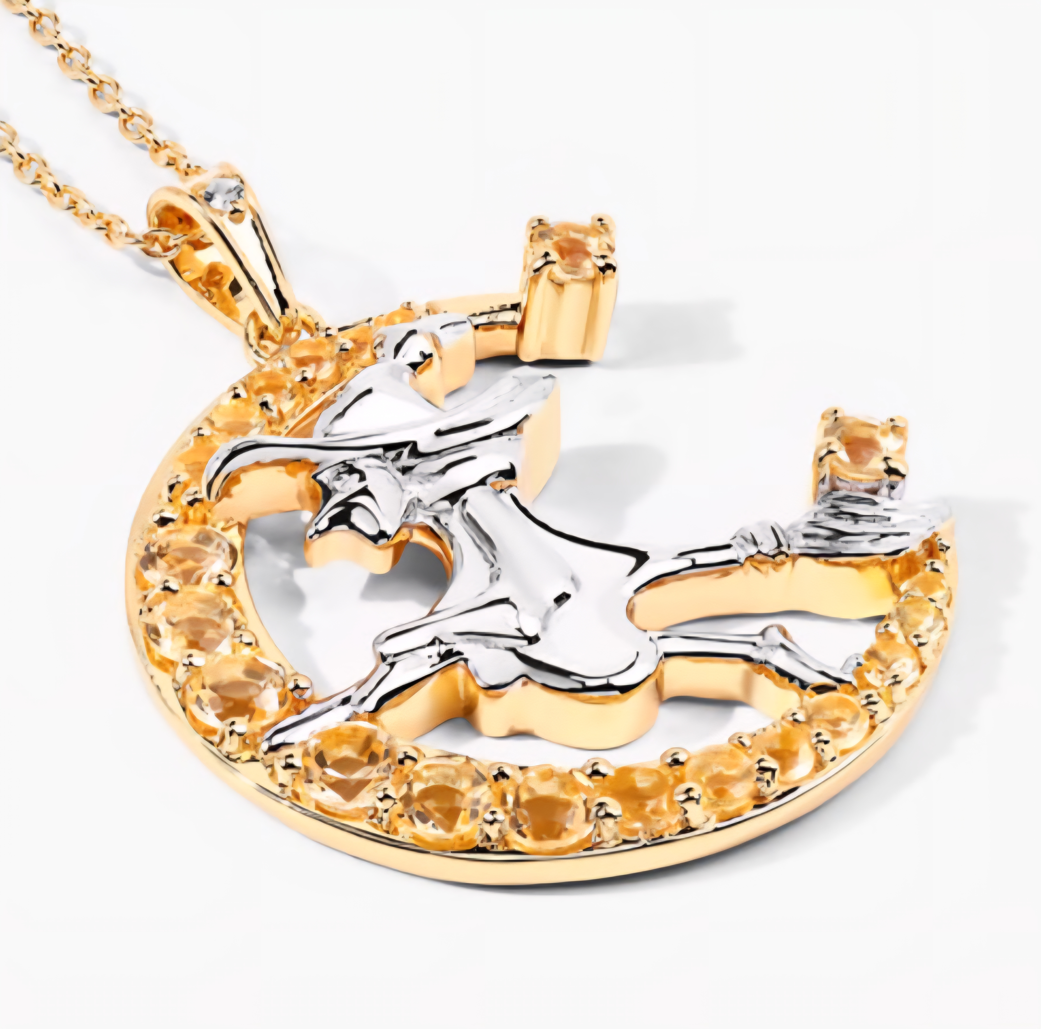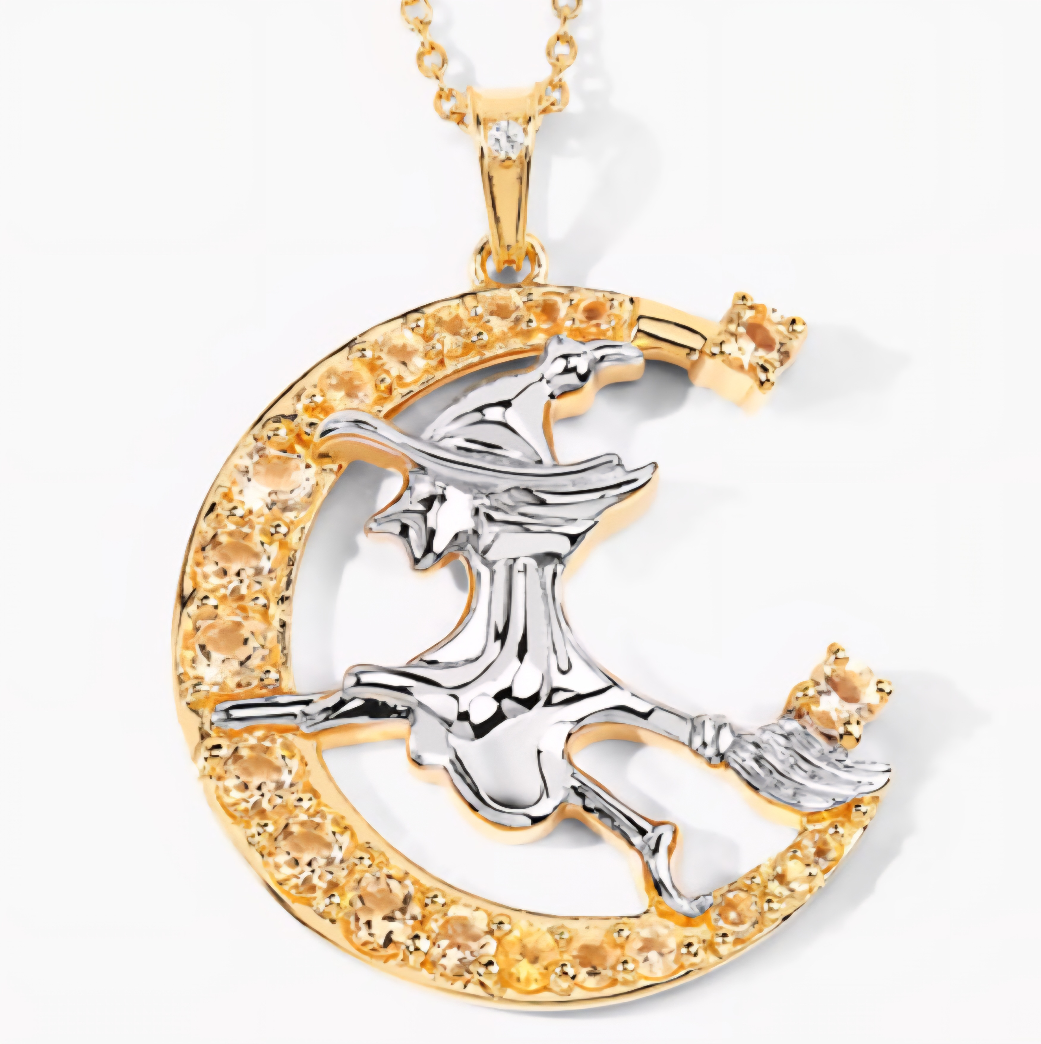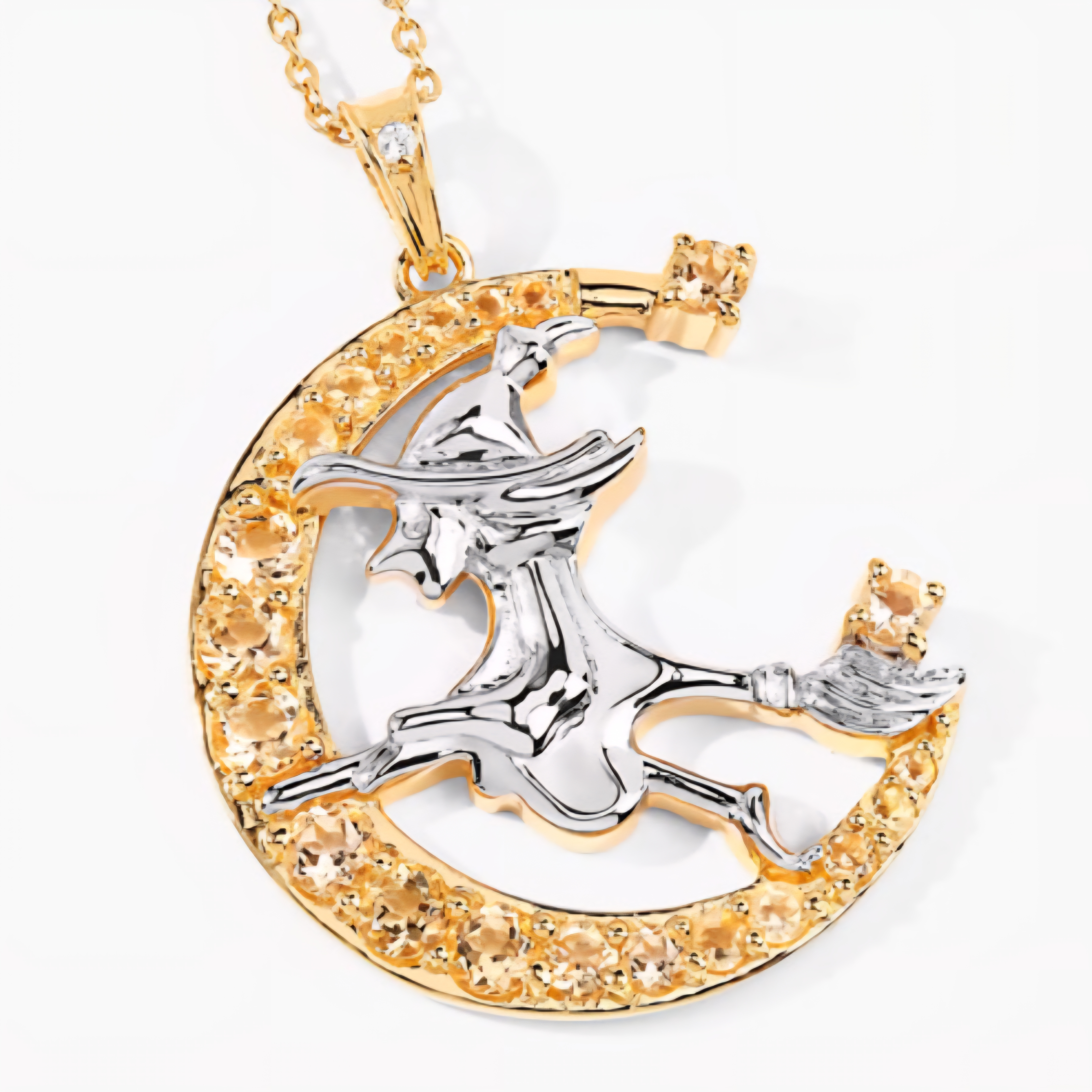 A little sunlight, a little spellcraft — this witch glows with golden energy. Set in solid sterling silver and finished in radiant 18K yellow gold and rhodium, this pendant captures a silver witch soaring across a crescent moon ablaze with honey-colored citrines. A white topaz spark crowns the bale, adding a starlit touch. The contrast between warm gold and cool rhodium gives this piece a two-tone brilliance that feels like a sunset in motion — bold, confident, and alive with charm. This isn’t costume jewelry. It’s statement witch energy.