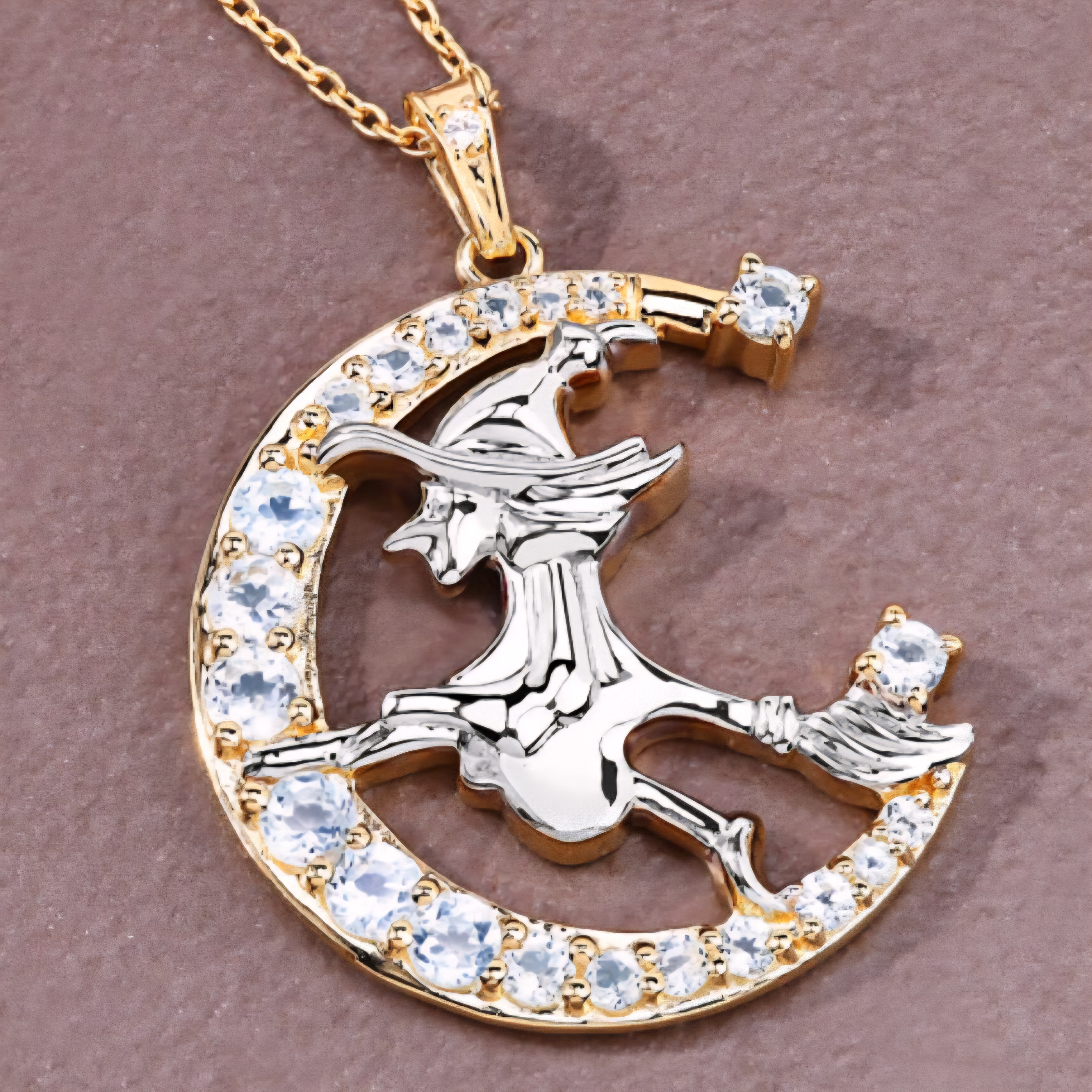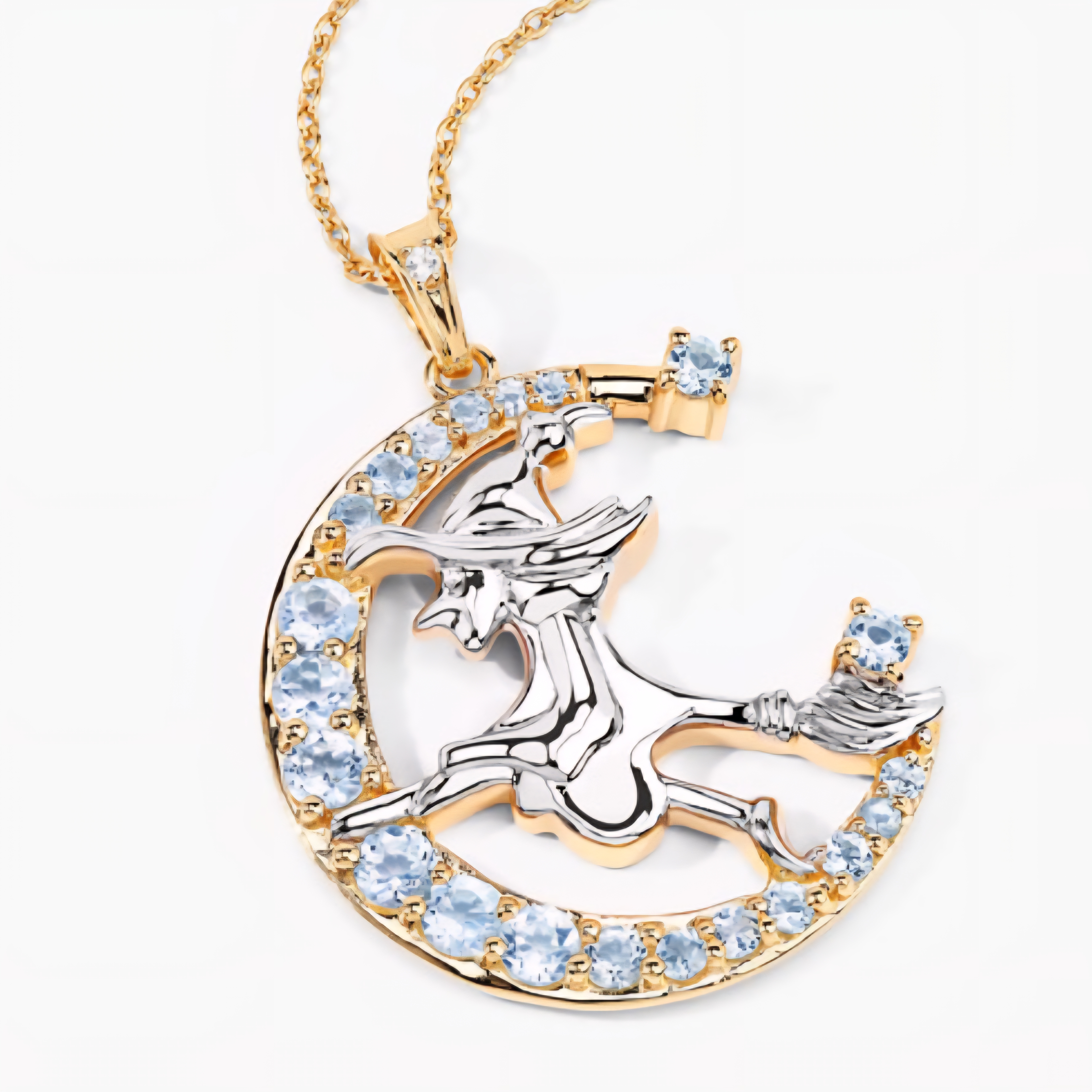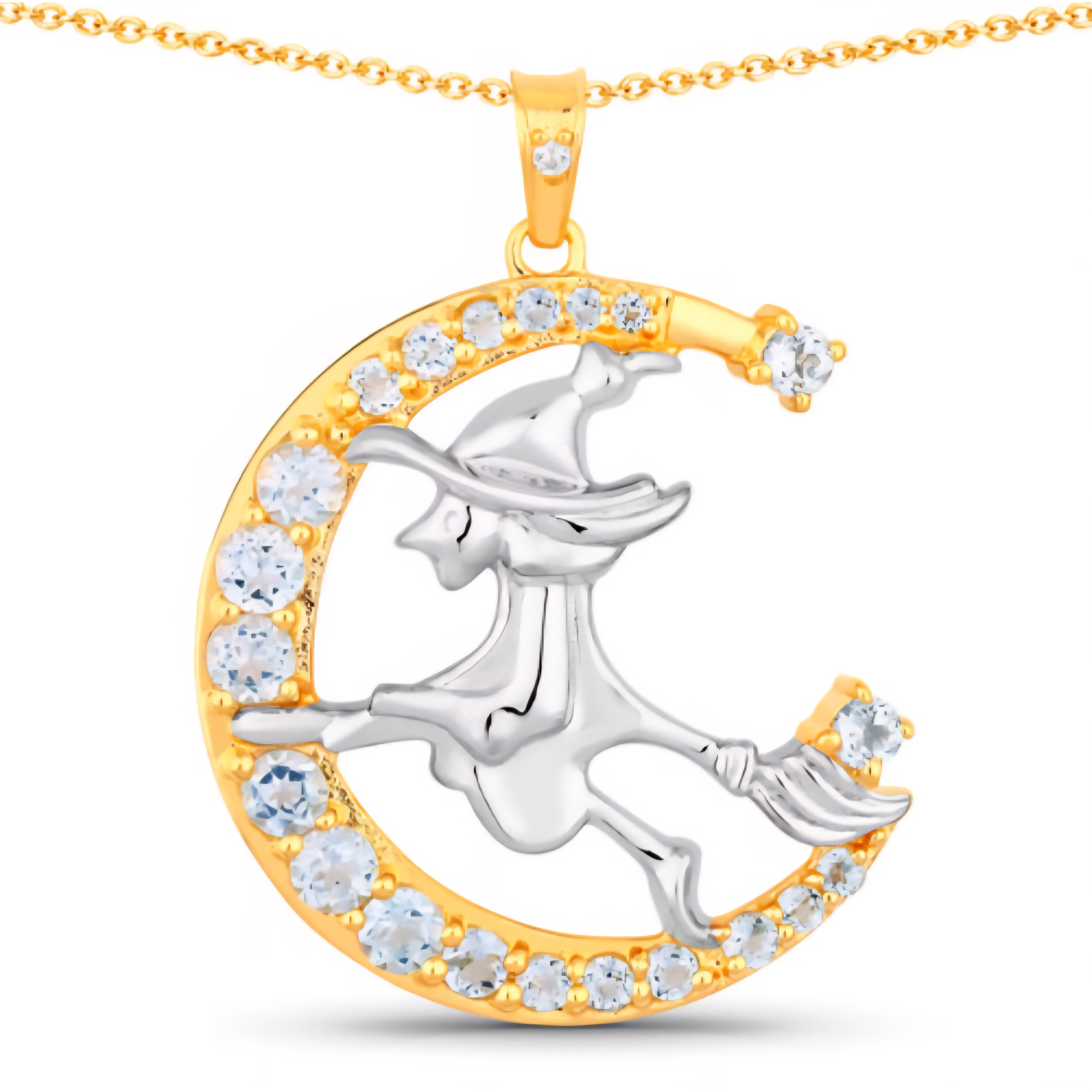 Cool as midnight air, sharp as moonlight. This pendant captures a witch mid-flight across a golden crescent moon, glowing with icy blue topaz and sparkling white topaz accents. The two-tone design — 18K yellow gold layered over sterling silver with rhodium highlights — gives it that luxe, spellbinding contrast that catches every flicker of light. It’s bold, bright, and just the right mix of mystical and modern. Wear it for the energy, the magic, or just because it looks that good.