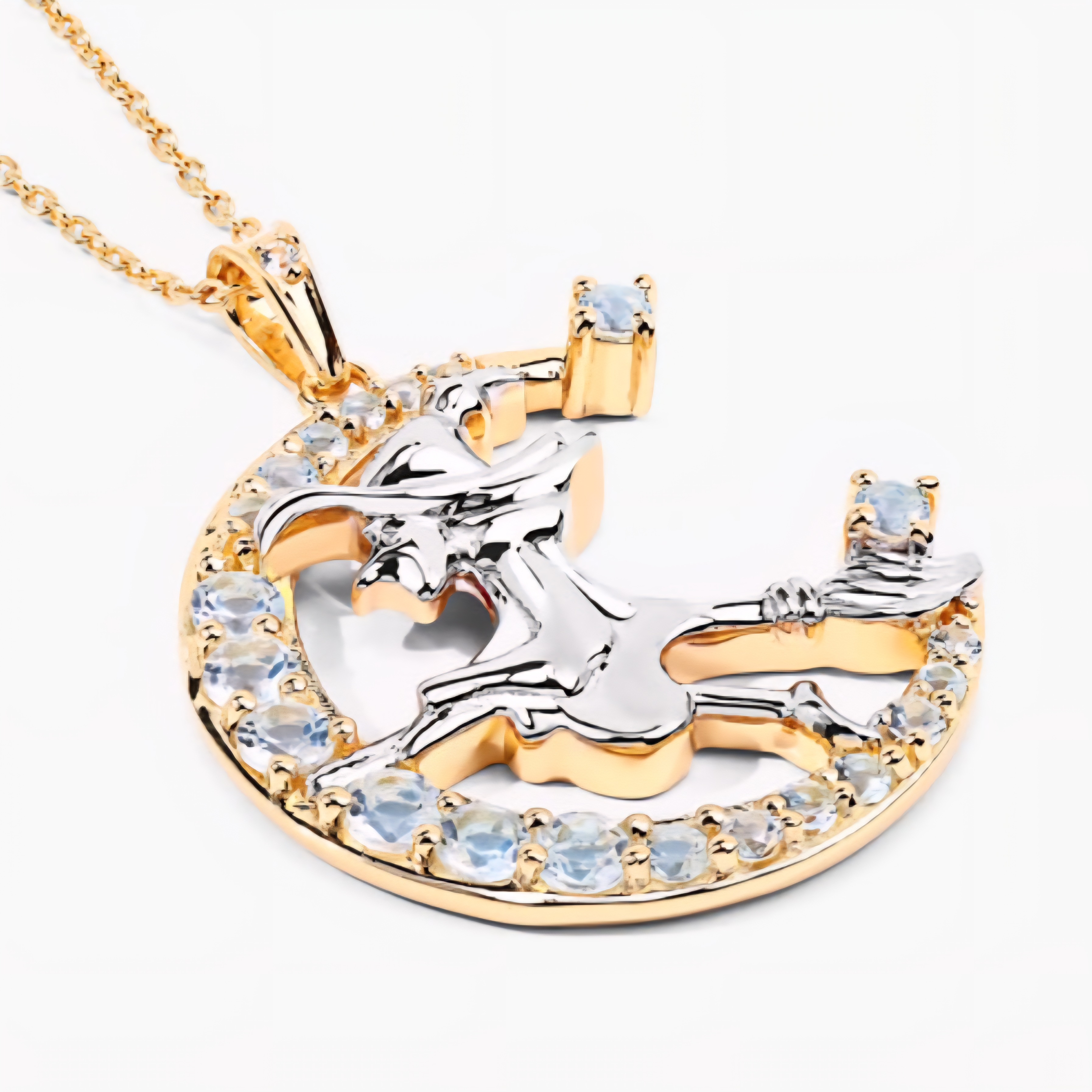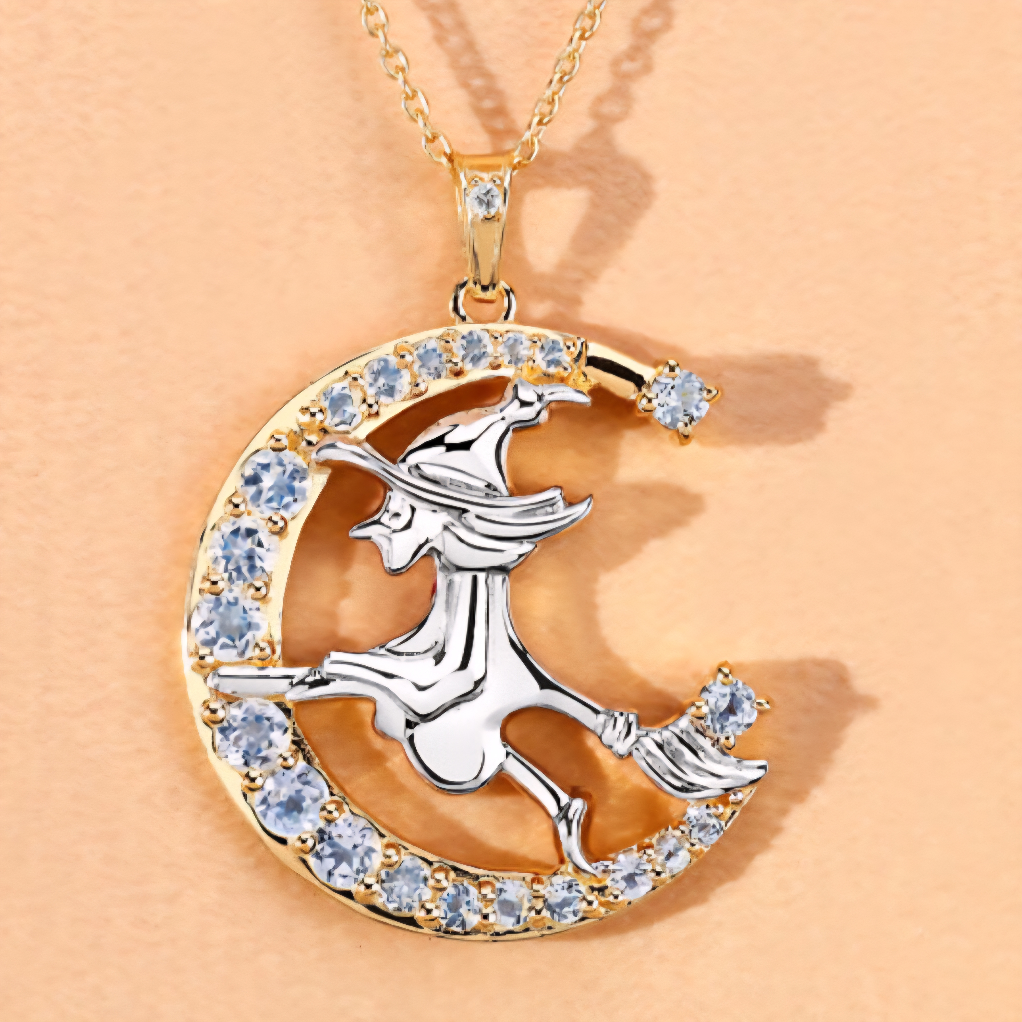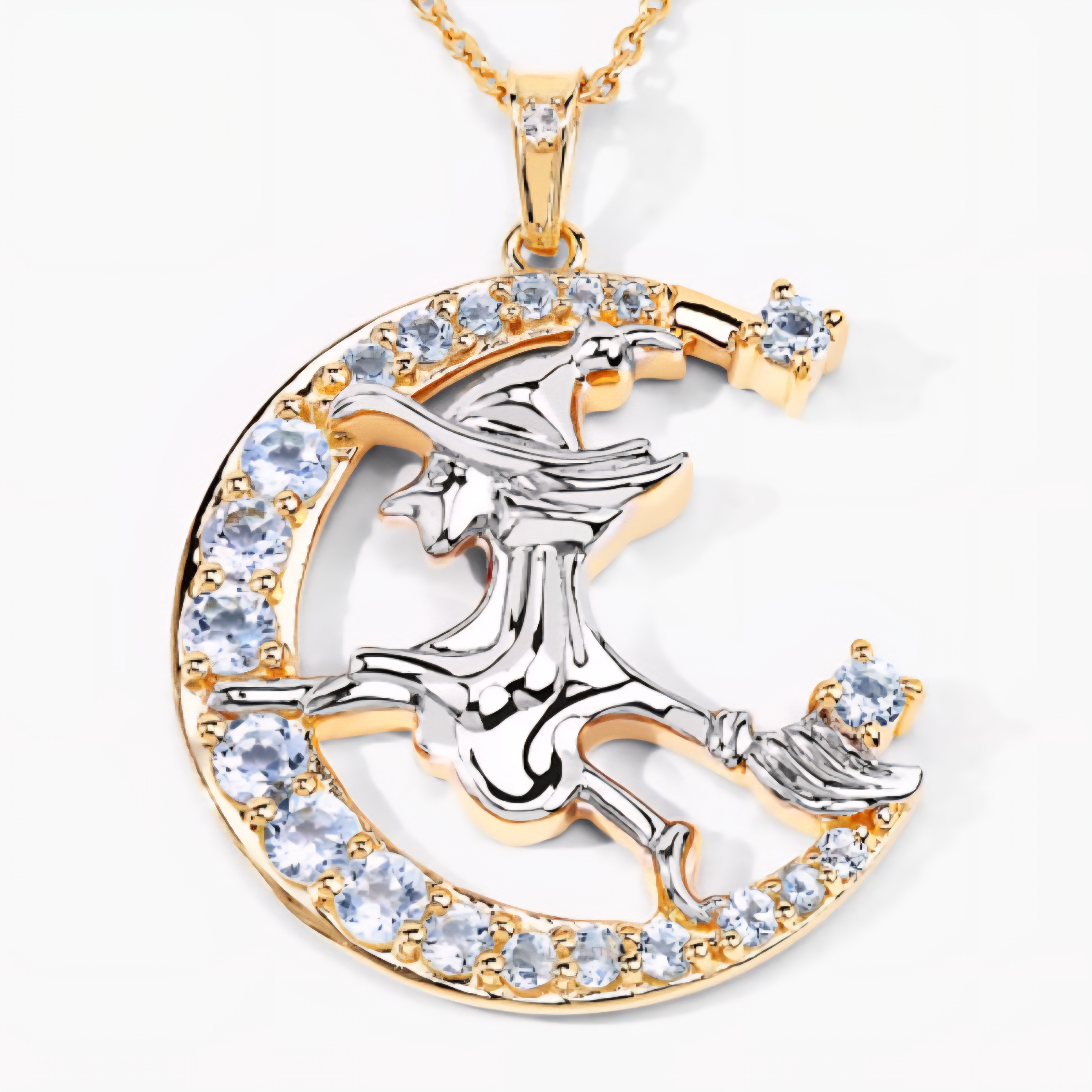 Cool as midnight air, sharp as moonlight. This pendant captures a witch mid-flight across a golden crescent moon, glowing with icy blue topaz and sparkling white topaz accents. The two-tone design — 18K yellow gold layered over sterling silver with rhodium highlights — gives it that luxe, spellbinding contrast that catches every flicker of light. It’s bold, bright, and just the right mix of mystical and modern. Wear it for the energy, the magic, or just because it looks that good.