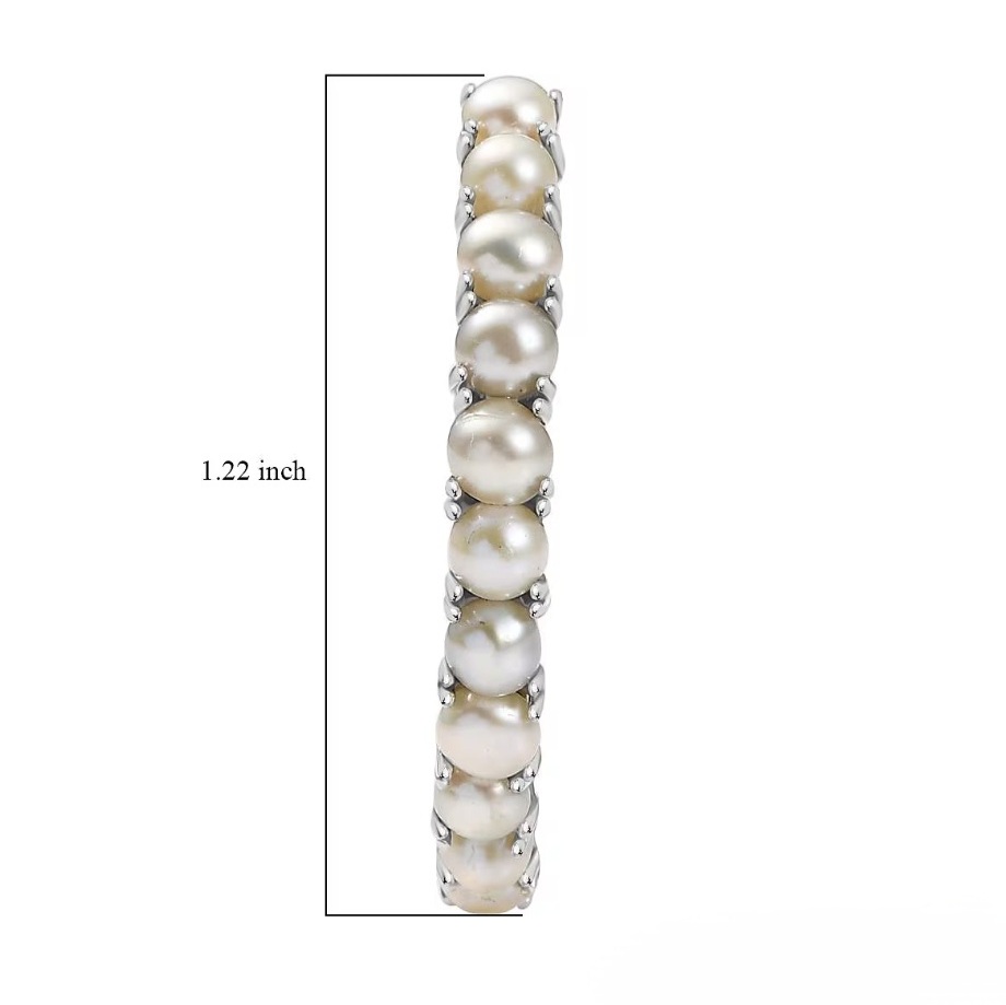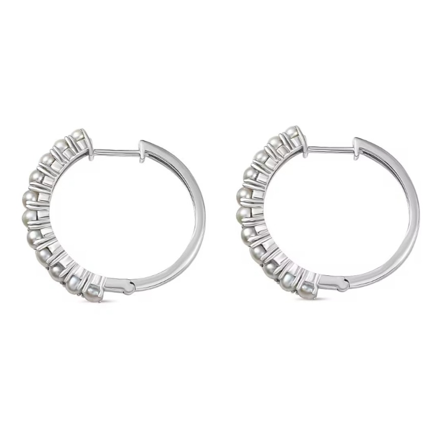 Smooth arcs of solid sterling silver form the foundation for these timeless freshwater pearl hoops. Each luminous white pearl is individually prong-set along the outer edge, creating a seamless circle of soft radiance and refined texture. The rhodium-plated finish enhances brilliance while ensuring lasting polish and wear. A modern take on classic pearl elegance—balanced, versatile, and endlessly wearable.