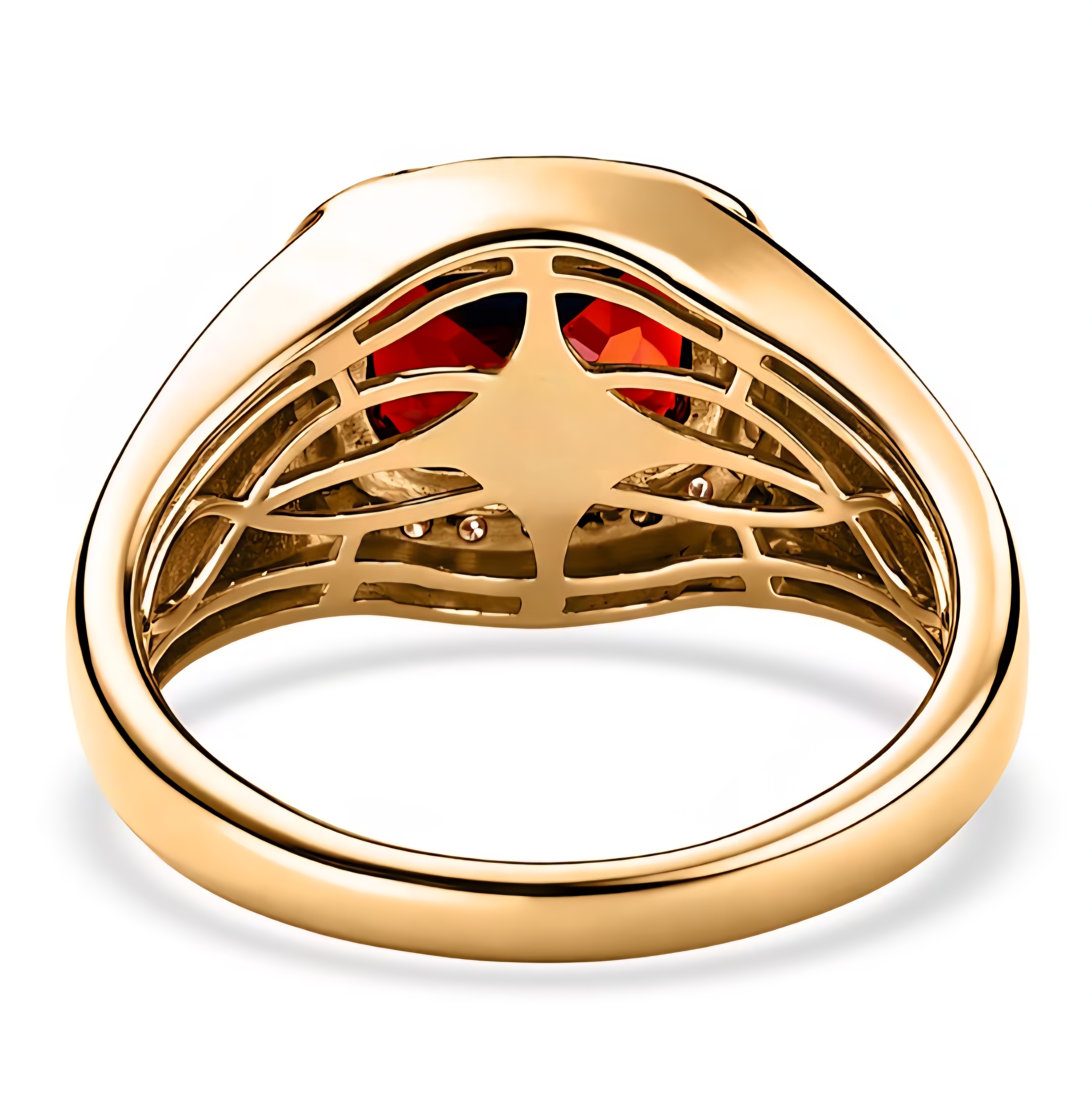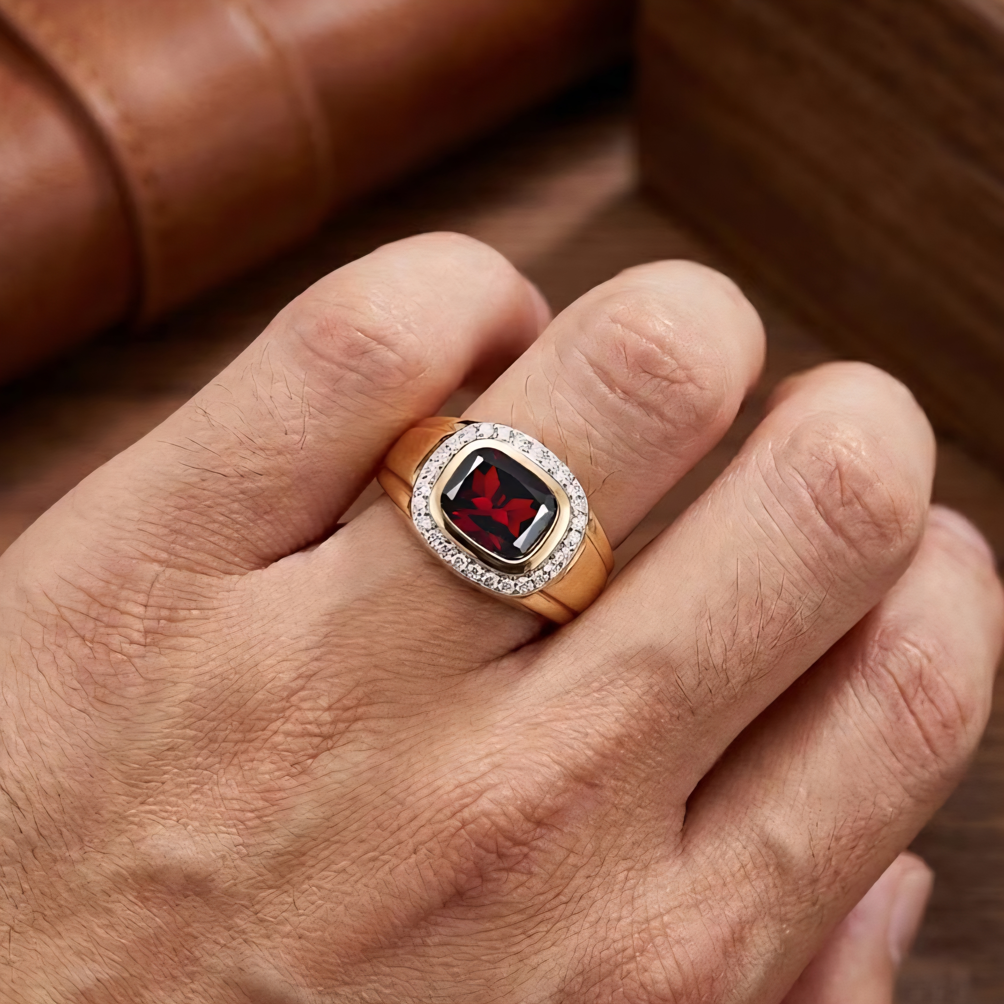 This gent’s ring is built around one of the richest color reds in the gemstone world. The center stone is a bold cushion cut garnet with deep wine red color and serious presence on the hand. It’s framed in a bright halo of colorless moissanite, giving the ring clean, diamond style fire while keeping the garnet as the main event.