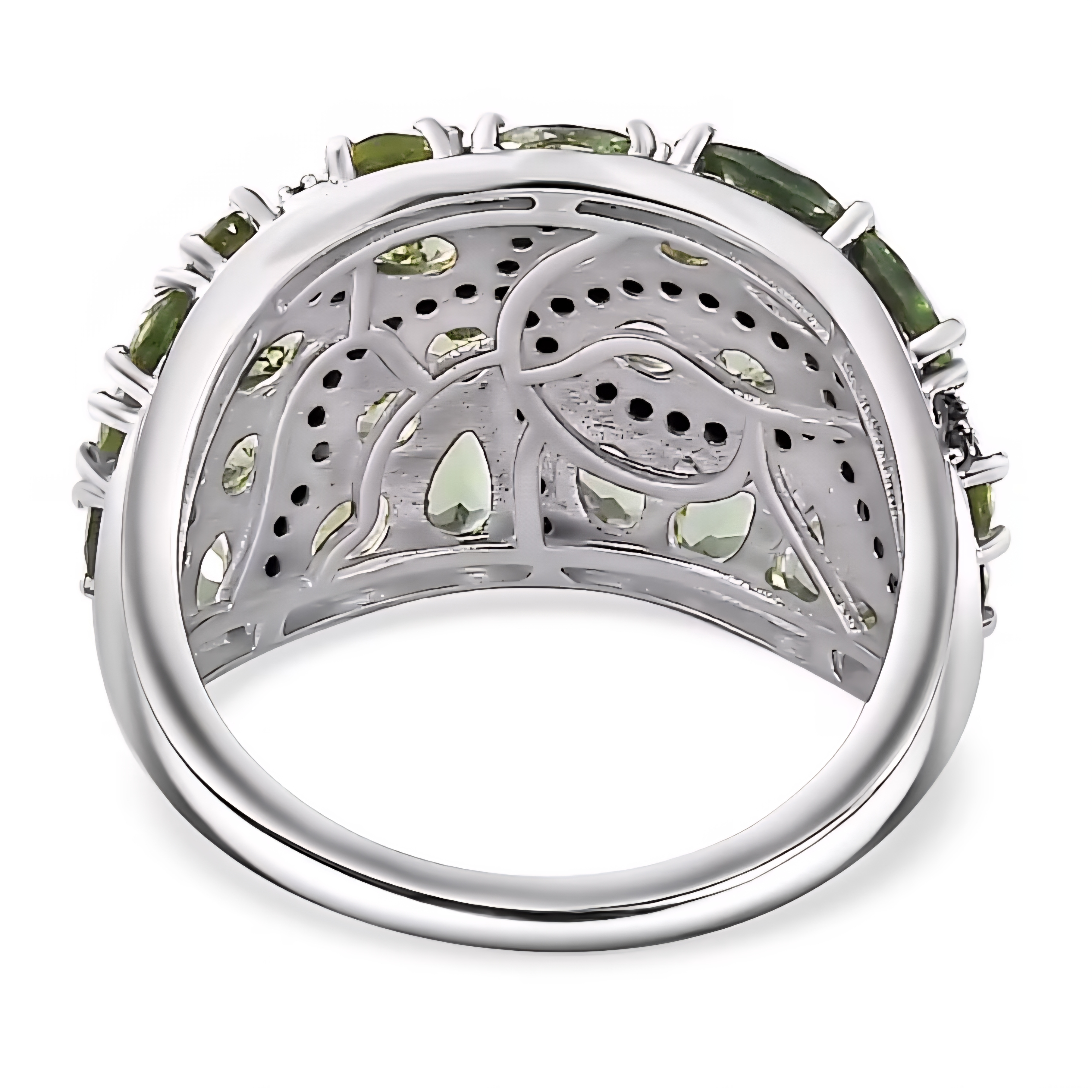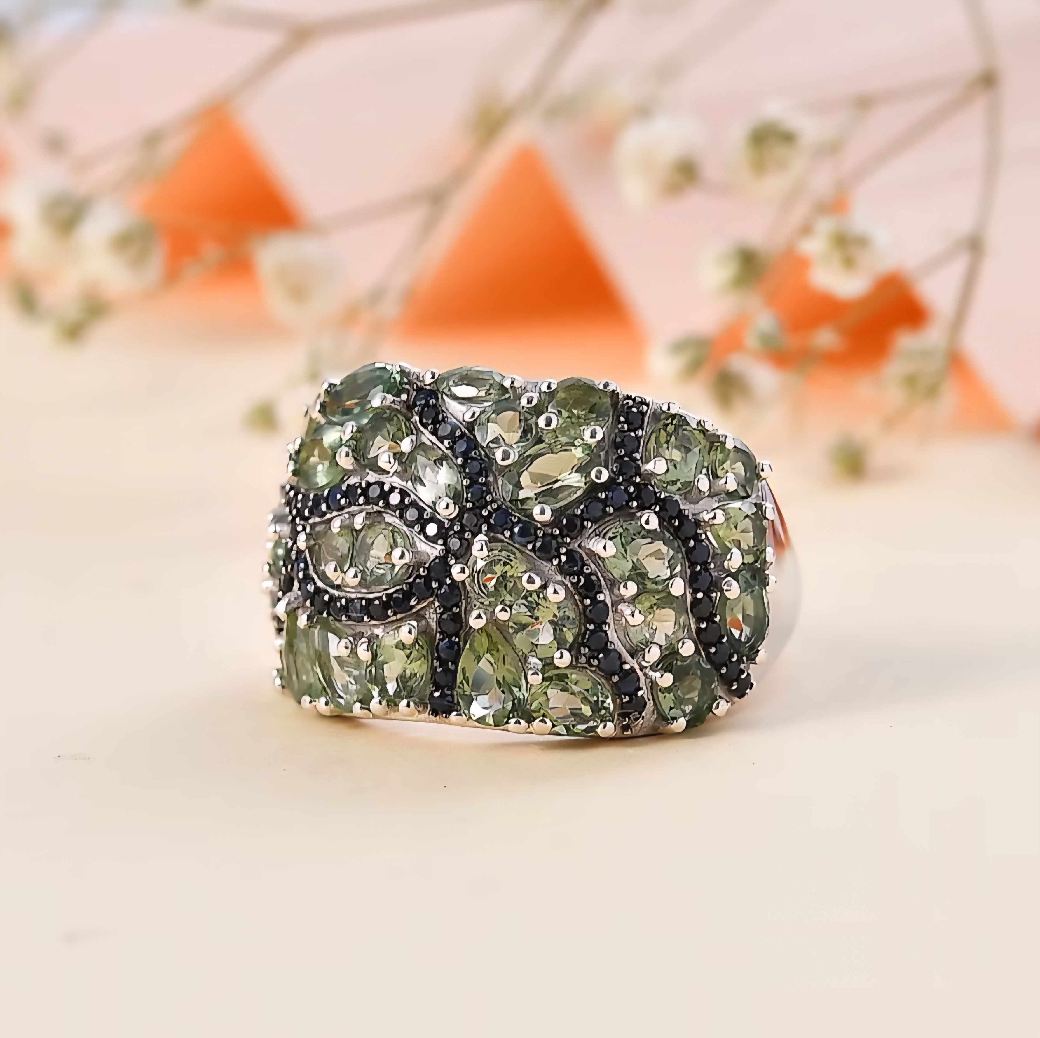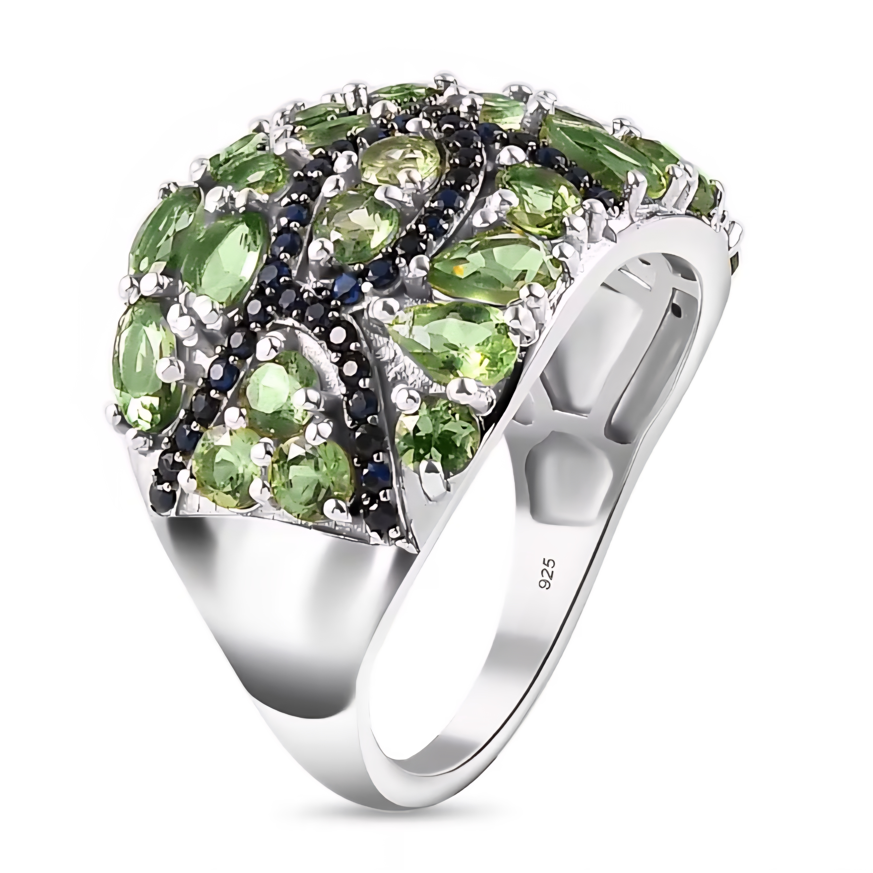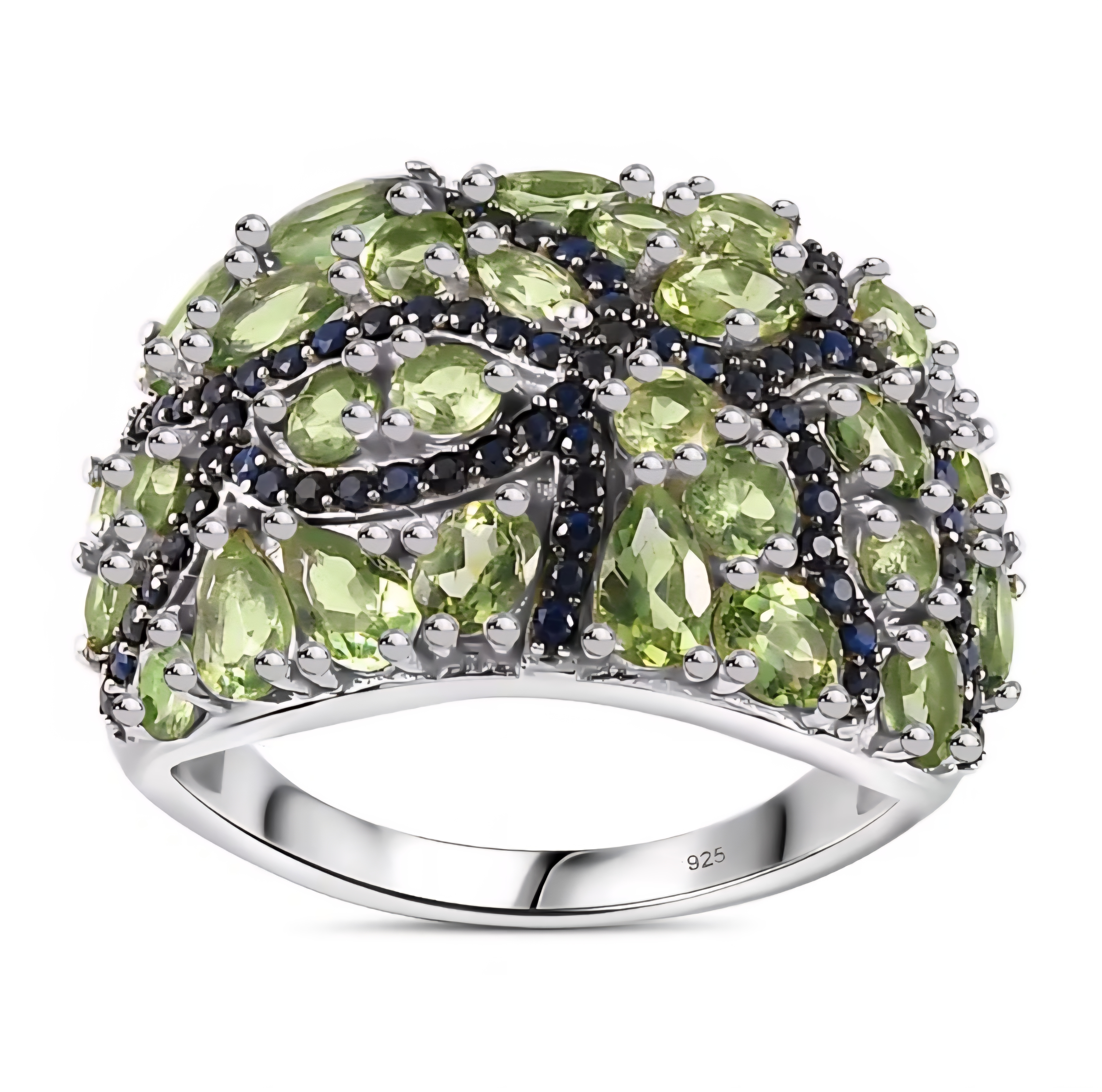 Brilliantly bold and unapologetically vivid — this ring combines 4.70 carats of lush green Madagascar apatite with 0.78 carats of deep blue sapphire for a contrast that radiates energy and precision. The mixed cuts — marquise, pear, oval, and round — create dynamic light play and texture, while the rhodium finish adds a sleek, reflective polish over solid 925 sterling silver. Designed to command attention, this piece turns the natural vibrance of color gemstones into wearable art — perfectly balanced, perfectly alive.