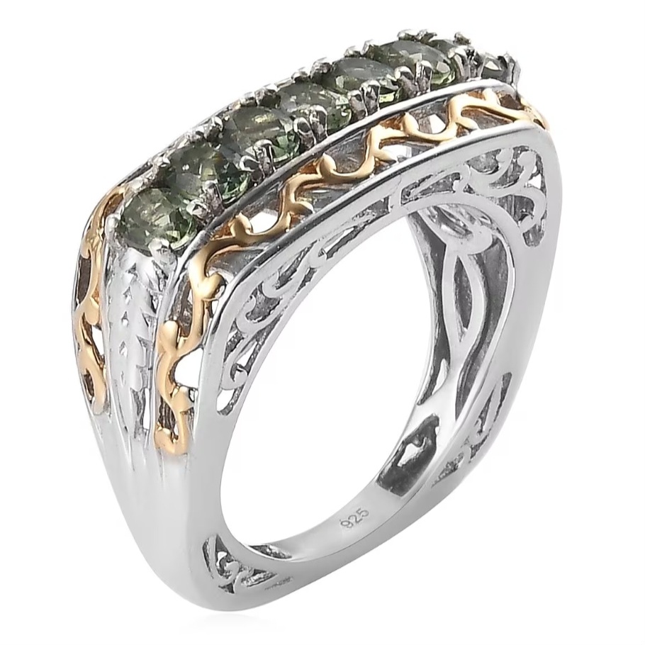 Green fire, golden scrolls, and silver architecture — this ring is a masterclass in craftsmanship. Seven vivid green apatites from Madagascar shimmer across the center in a perfectly aligned row, each one alive with depth and light.
