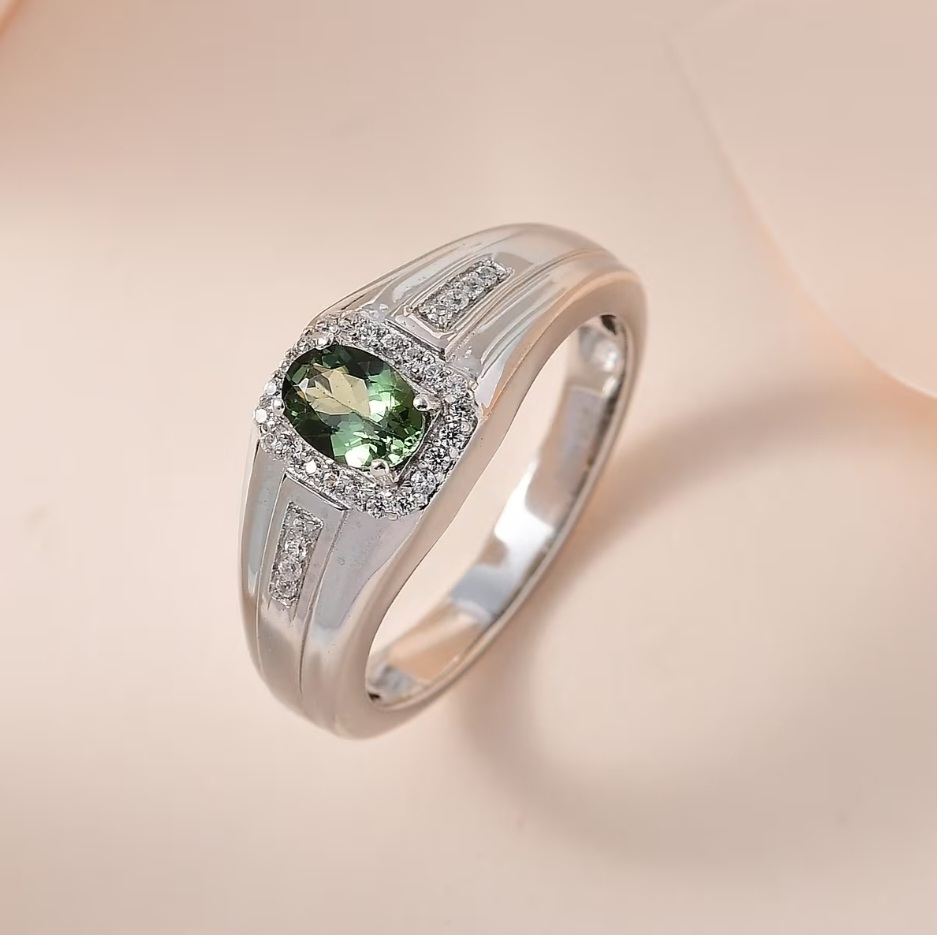 A vivid Tanzanian green apatite sits at the center, showing rich green tones with natural depth and flashes of teal depending on the light. The oval cut gives the stone a refined look while keeping the design masculine and balanced.