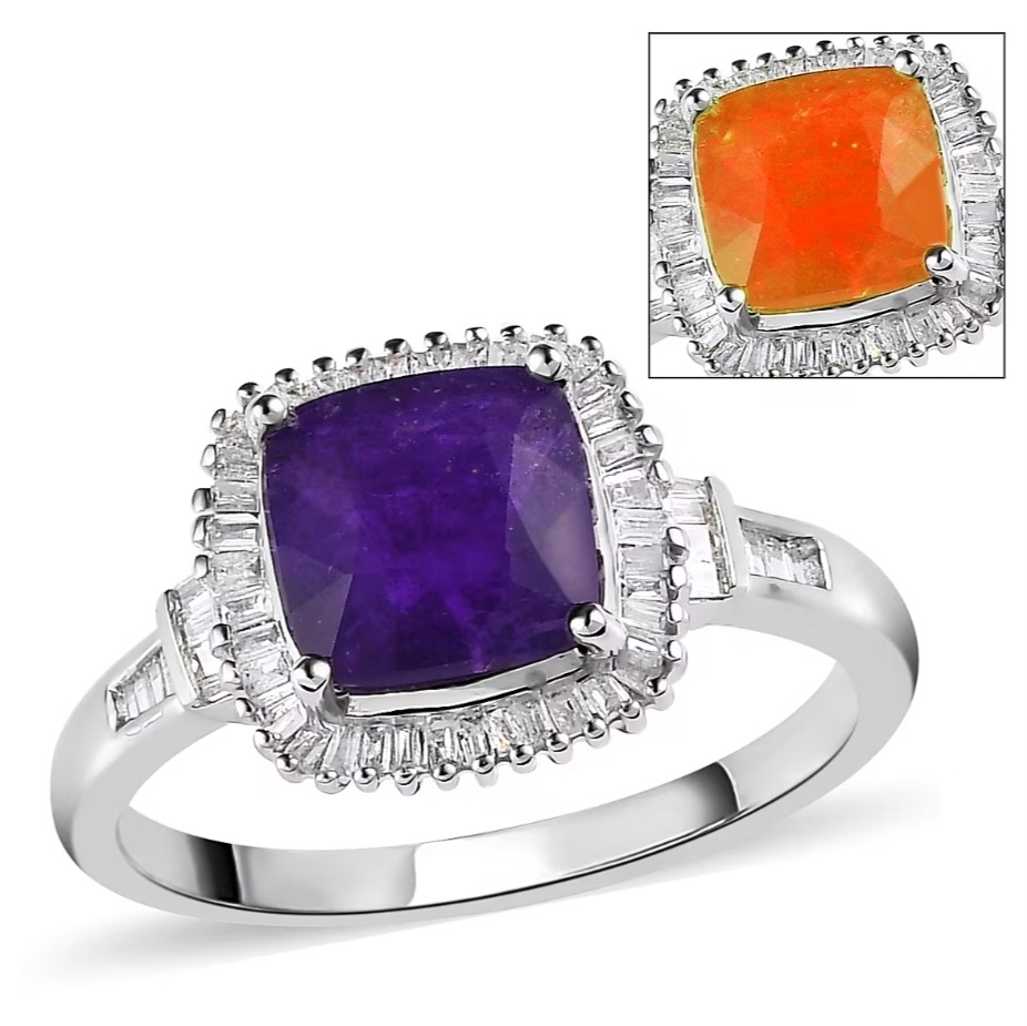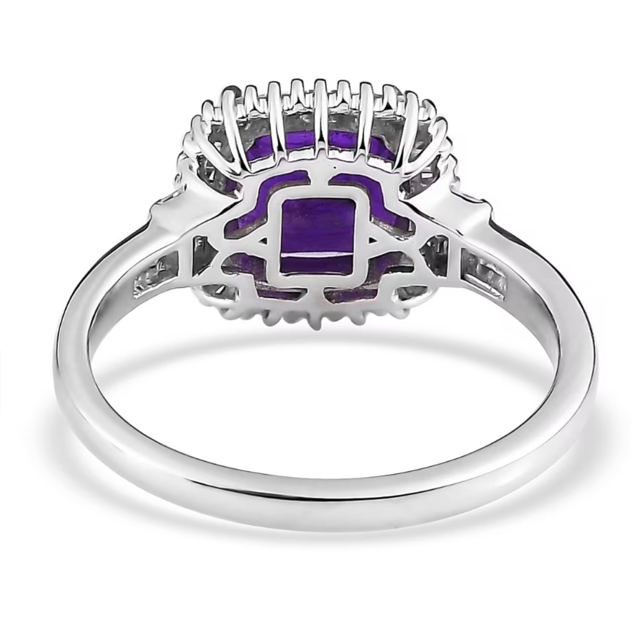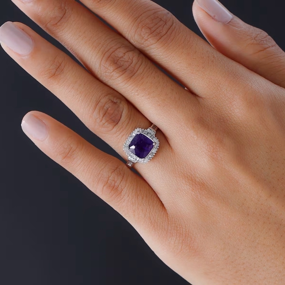 Rich, regal, and unapologetically rare — this 1.40ct natural Hackmanite glows in a deep, saturated purple tone that commands attention. Its bold cushion cut is encircled by a refined halo of baguette diamonds, blending timeless geometry with subtle brilliance. Expertly crafted in solid 14k white gold and rhodium finished for a mirror-smooth sheen, the design balances old-world sophistication with unmistakable modern edge. A statement piece that radiates pure purple power.