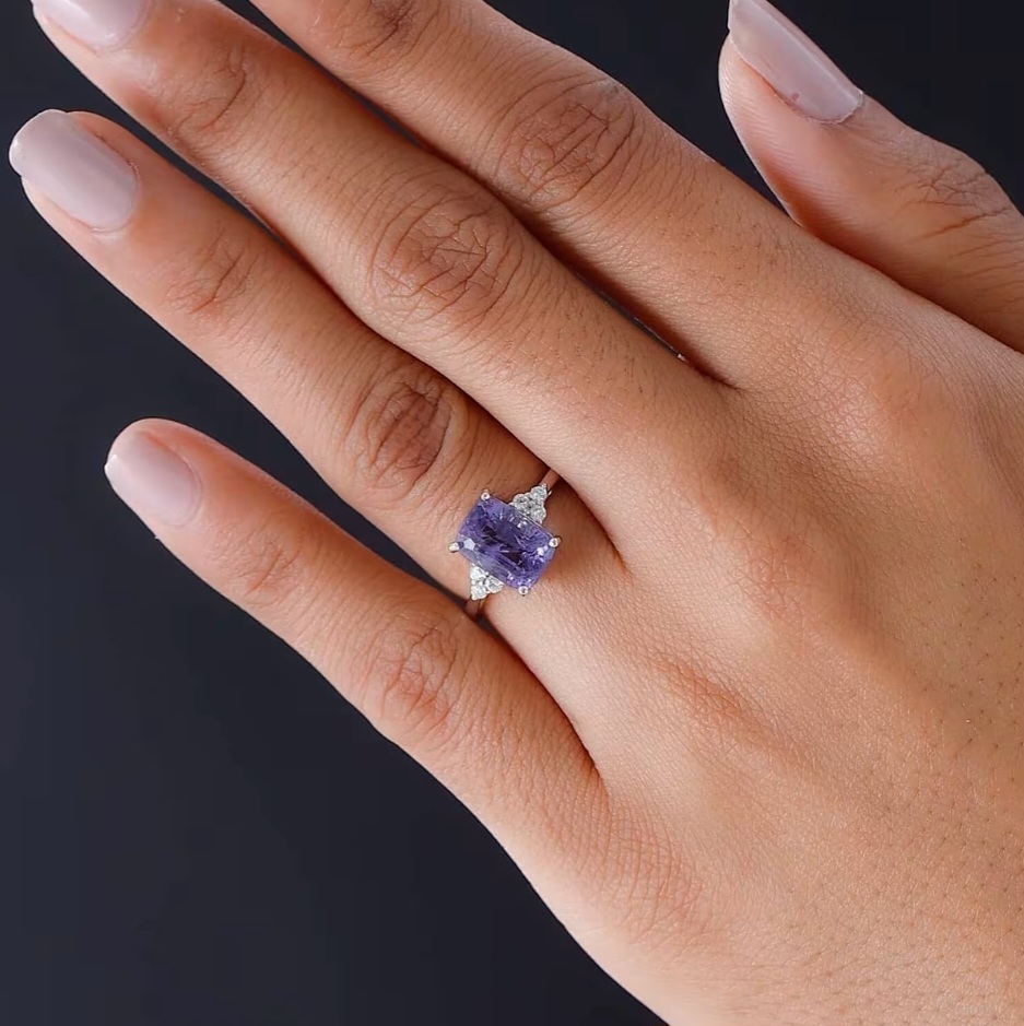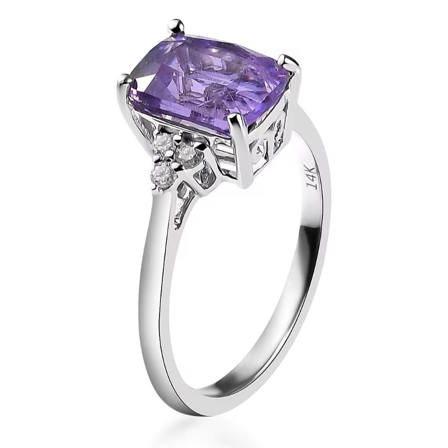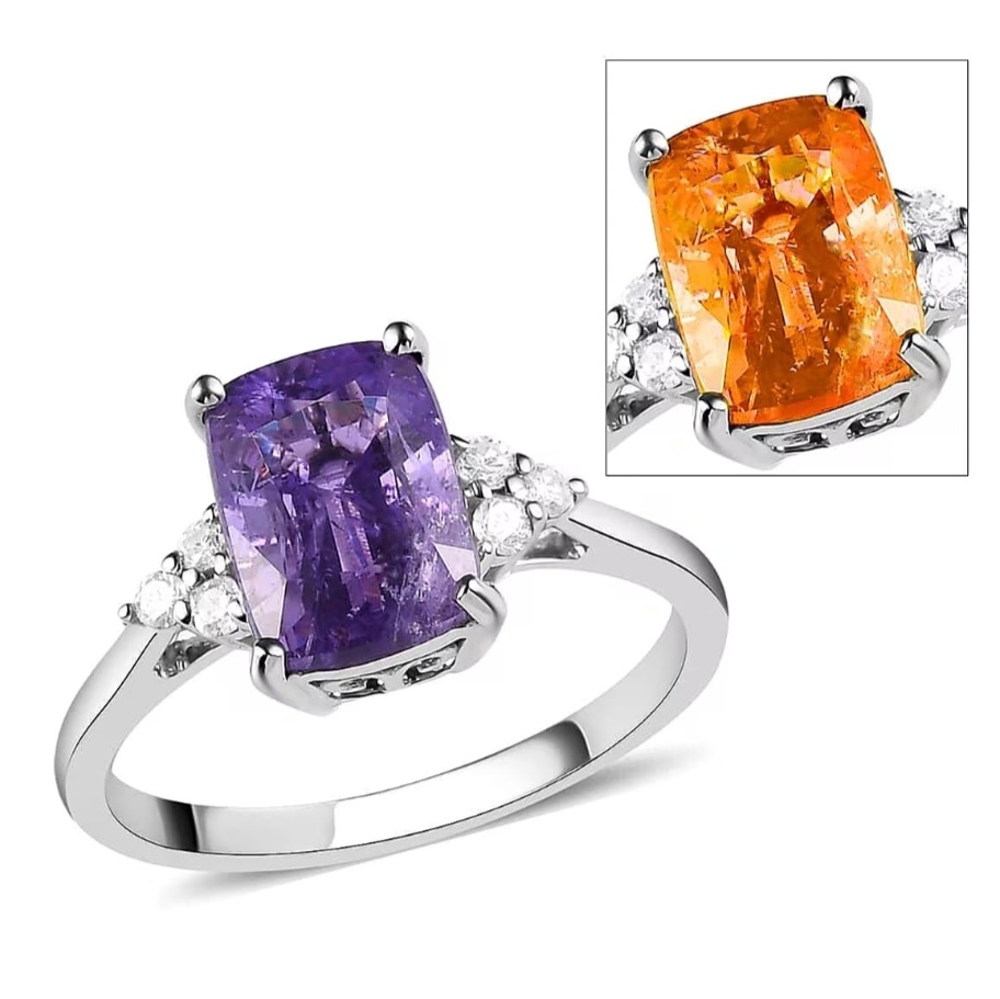 Natural Hackmanite is one of nature’s most captivating anomalies — a gem that transforms under UV light from soft lilac to vivid orange in a display of true tenebrescence. This 2.06ct cushion-cut Hackmanite takes center stage, flanked by bright white natural diamonds that amplify its rare phenomenon with crisp brilliance. Set in solid 14k white gold and finished with rhodium for lasting luster, this design captures elegance and elemental science in one seamless statement. It’s not just a color-change gem — it’s proof that light itself can be luxury.