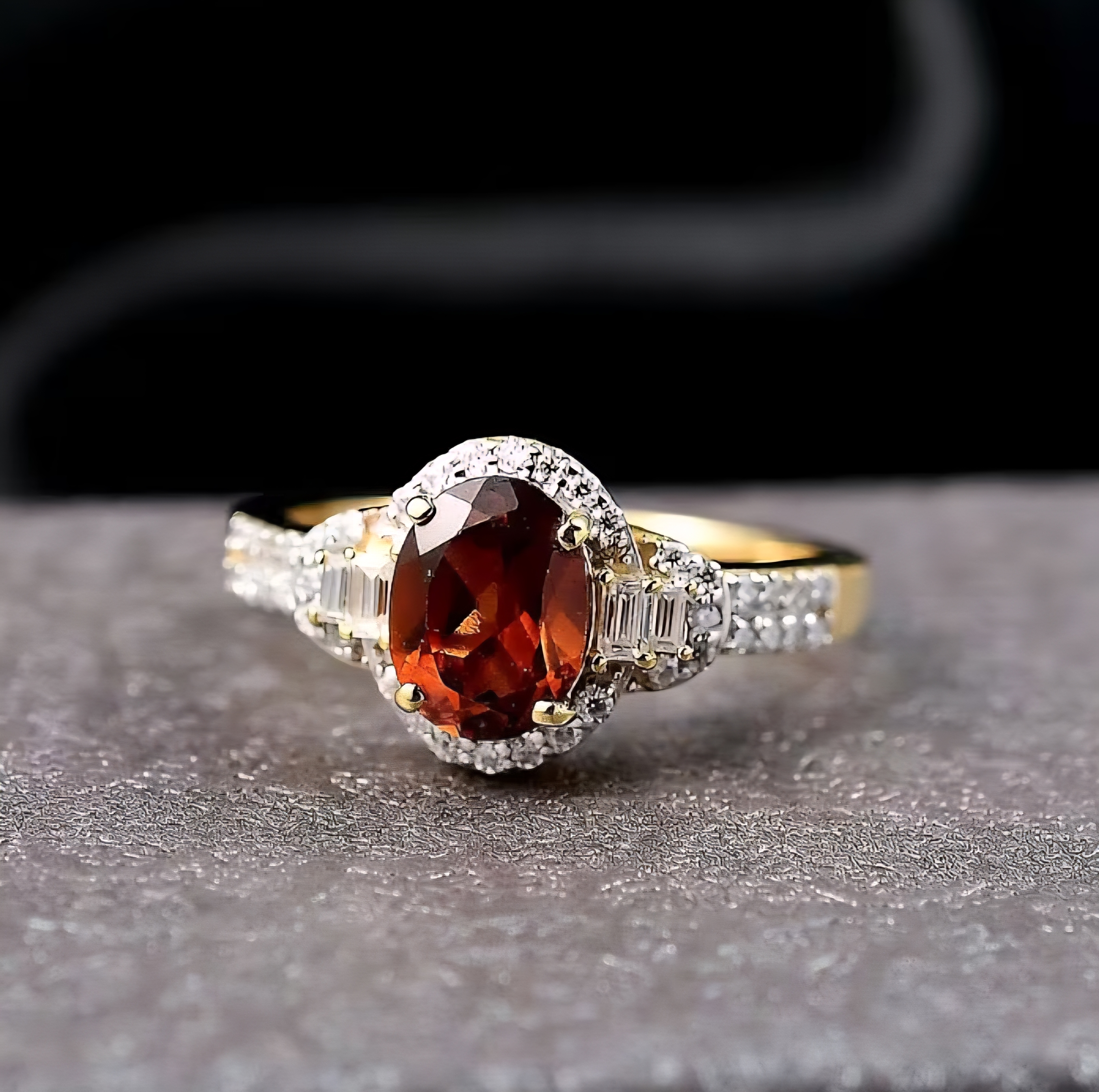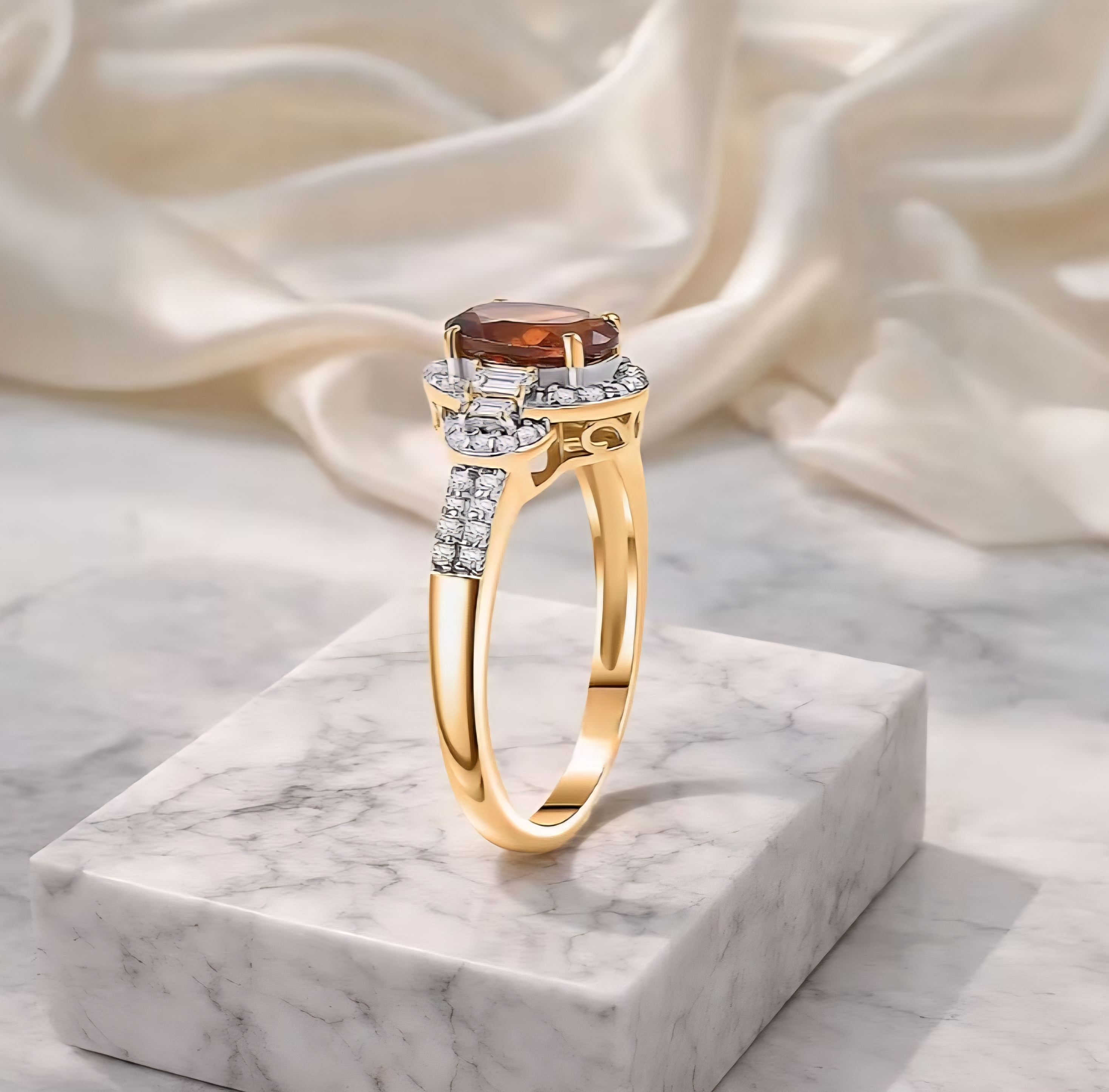Warm, spicy, and unmistakably rare! This ring centers around a 1.53 carat Ceylon hessonite garnet in an 8x6mm oval cut. Hessonite is loved for its glowing cinnamon orange color, and it has a softer, more antique warmth than red garnet, with a depth that looks almost lit from within.