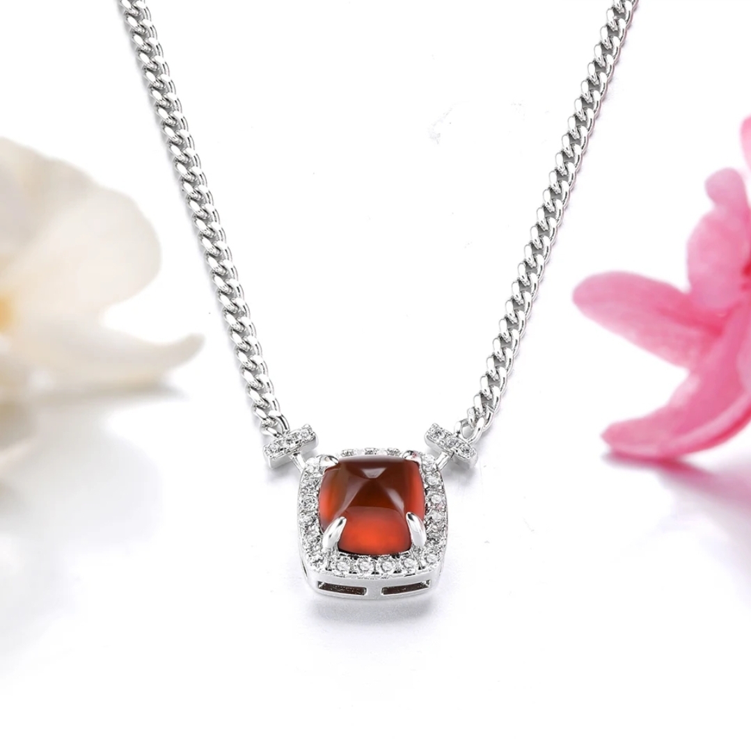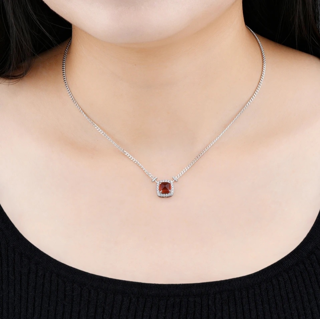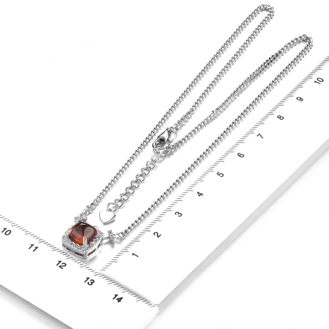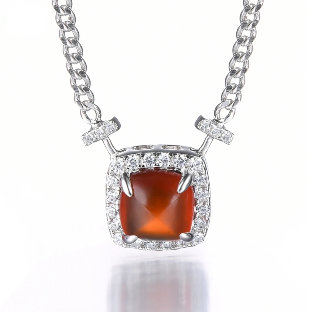 Elevate your jewelry collection with our Hessonite Garnet & White Zircon Station Necklace. This captivating necklace boasts a gorgeous orange Sugar Loaf Cabochon center, adding a touch of warmth and sophistication to your look. Designed with a sleek single station style and a thick chain, it effortlessly exudes modern elegance. Crafted with Rhodium over Sterling Silver, this necklace promises enduring beauty and high-quality craftsmanship. Make a statement wherever you go with this exquisite piece!