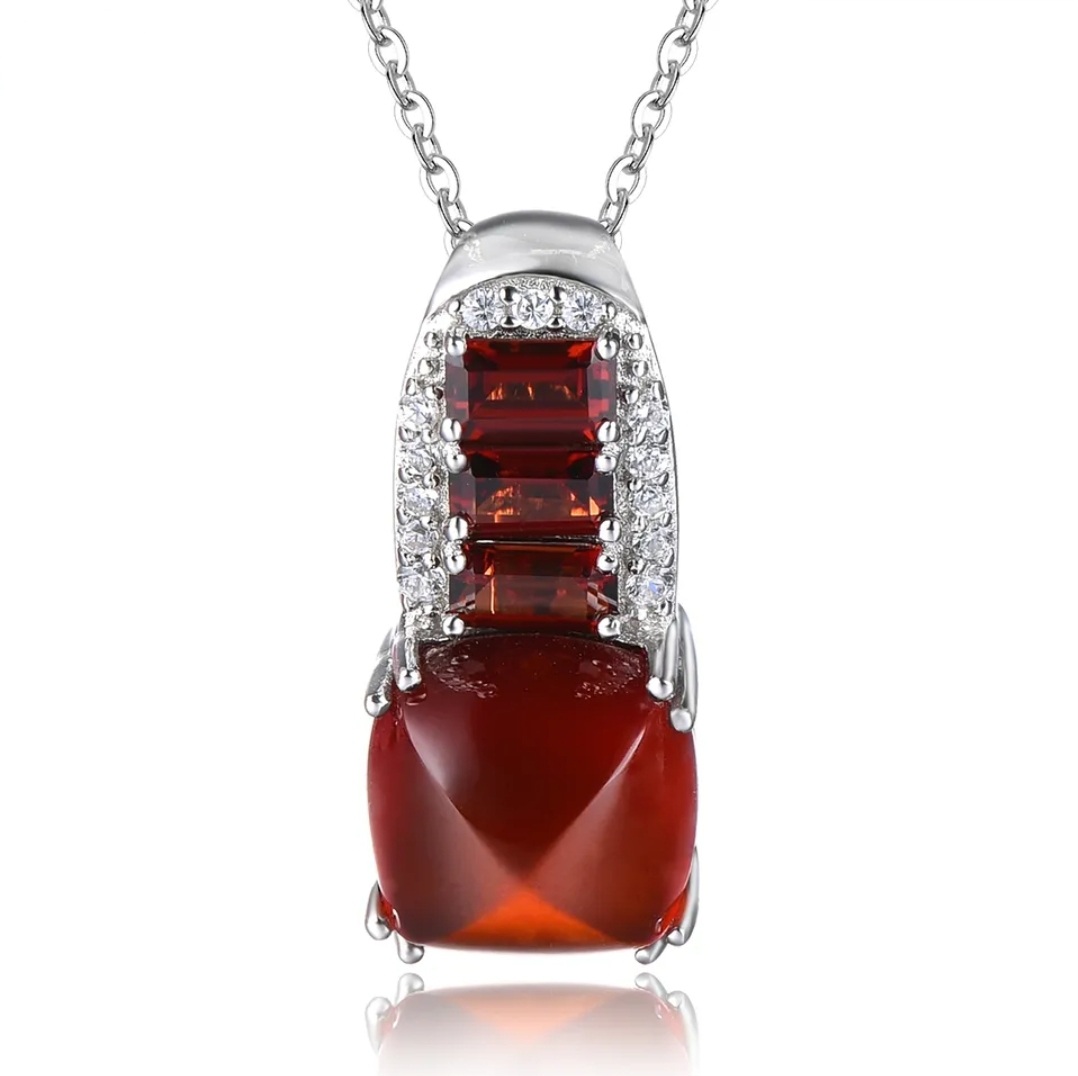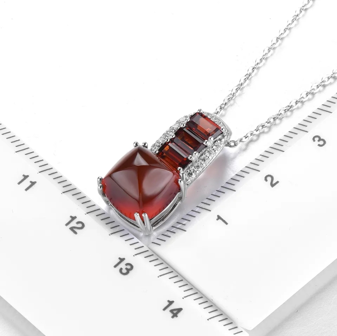 Immerse yourself in the deep, warm hues of this beautifully crafted Sugar Loaf Pendant Necklace. This spectacular piece features a breathtaking Cinnamon Orange Hessonite alongside stunning Red Garnet and intricate Zircon accents, set in gleaming Rhodium over Sterling Silver. This necklace comes with a Cabochon Hessonite that is captivating, to say the least. This pretty accessory is Fall season ready and simply begs to be paired with your favorite cozy sweaters and pumpkin spice lattes, adding a splash of fiery autumn color to any ensemble. Its timeless appeal and durable construction ensure it will remain a favorite piece in your jewelry collection for many years to come.