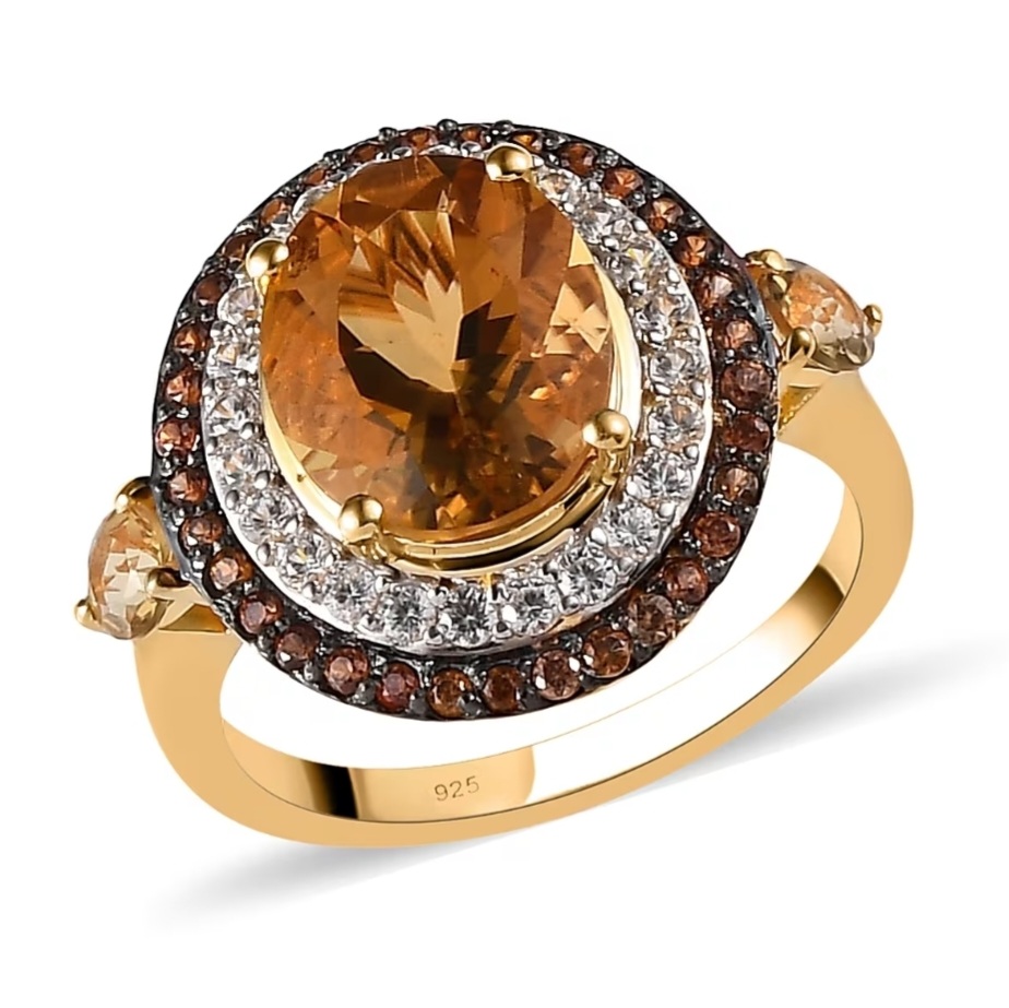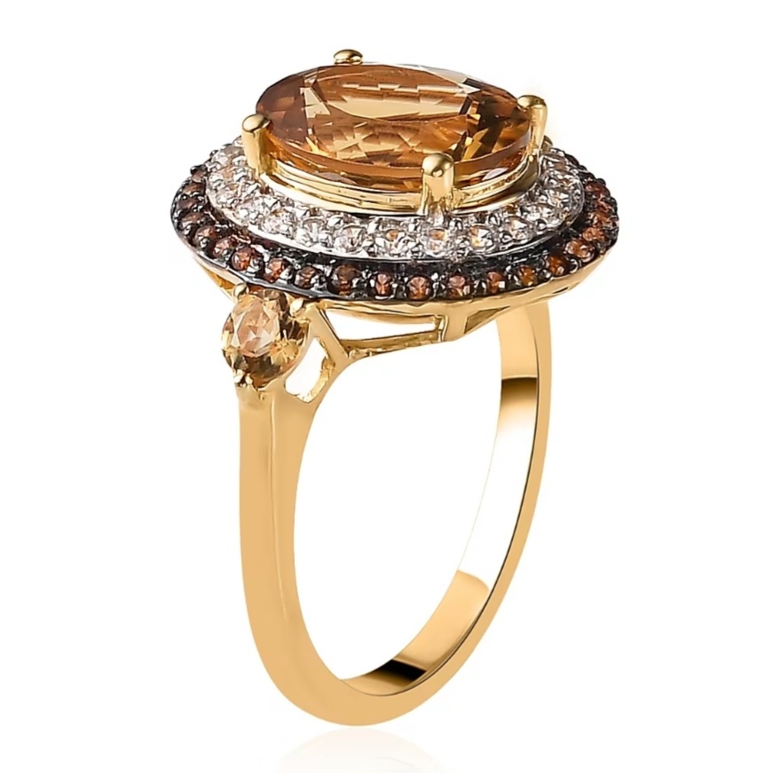 This is a statement ring built on color harmony — golden Scapolite, white sparkle, and rich chocolate Zircon working together in one bold, polished piece.
