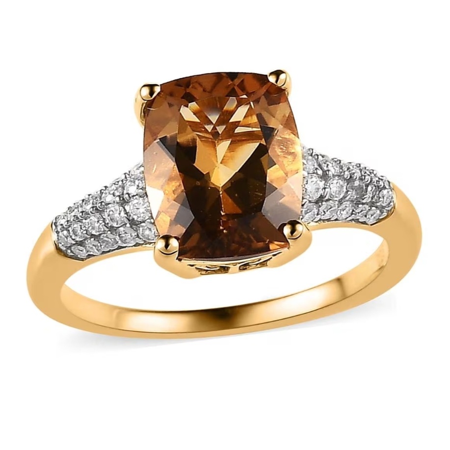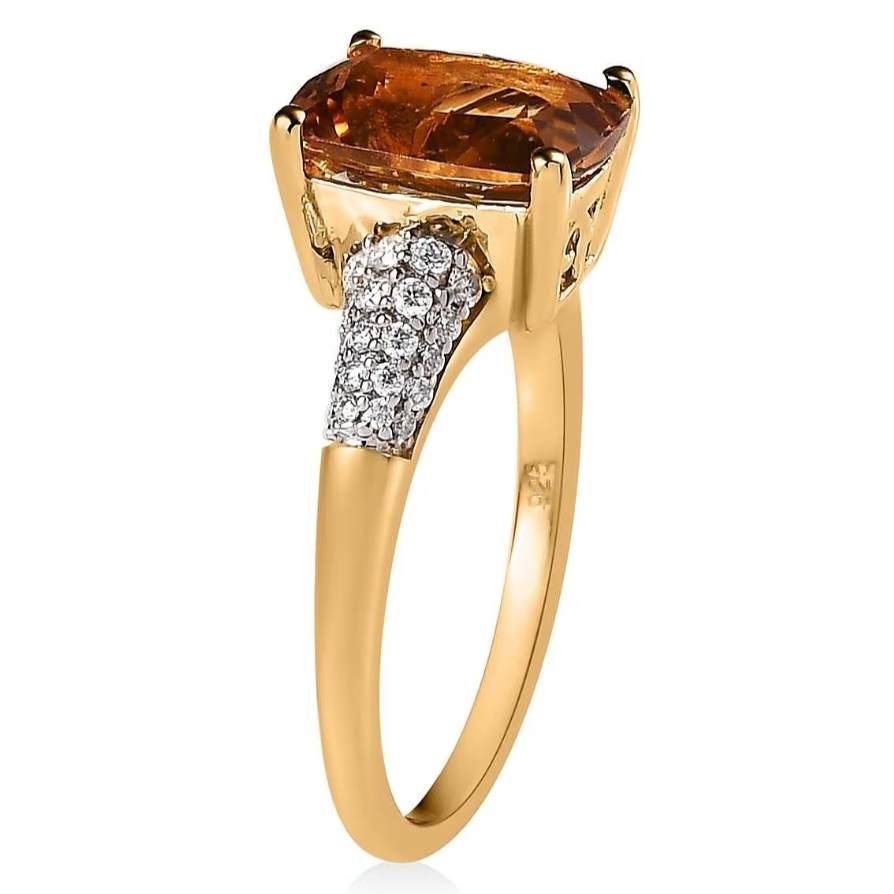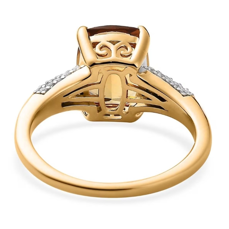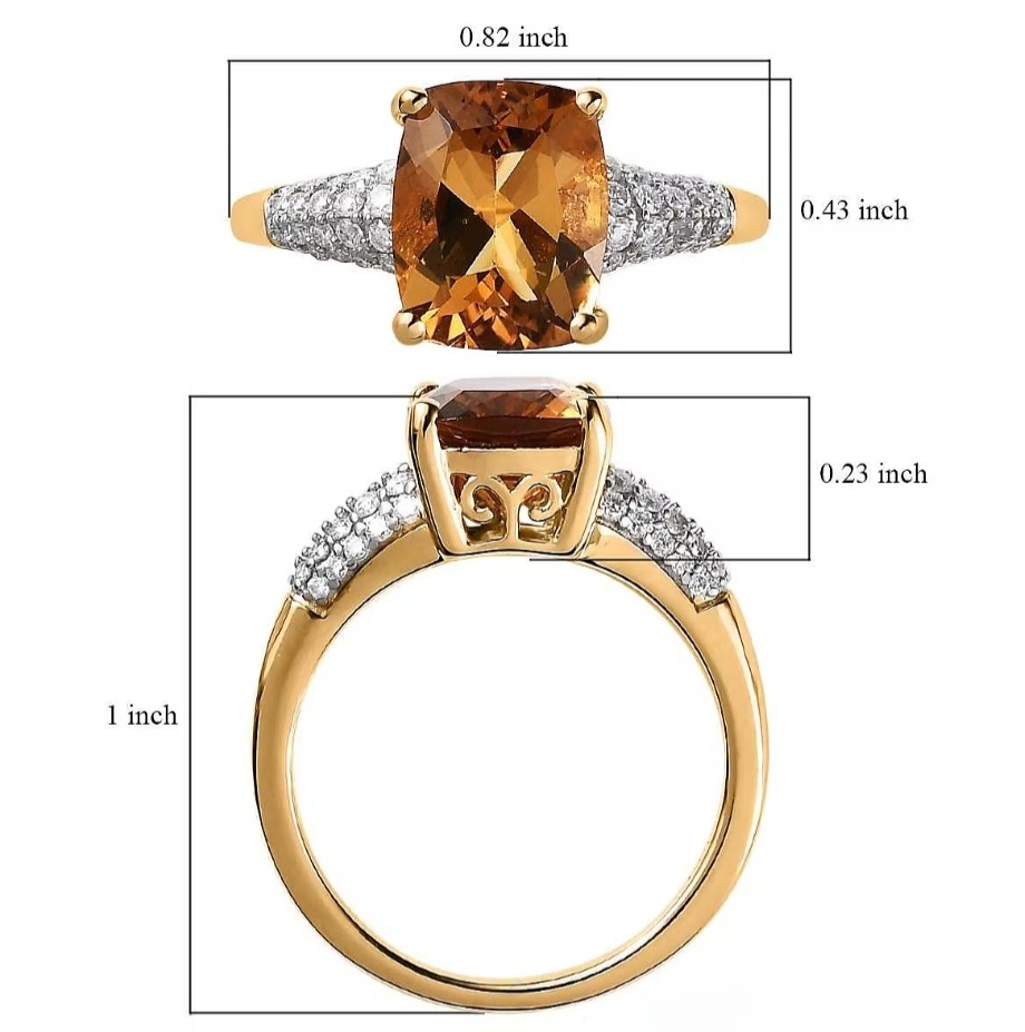 Finished in 18k yellow gold plating over solid 925 sterling silver with rhodium-brightened prong tips, the ring maintains a clean, highly polished profile that enhances both the golden Scapolite and the bright Moissanite accents. Classic, elegant, and color-rich, this is a warm and timeless gemstone solitaire.