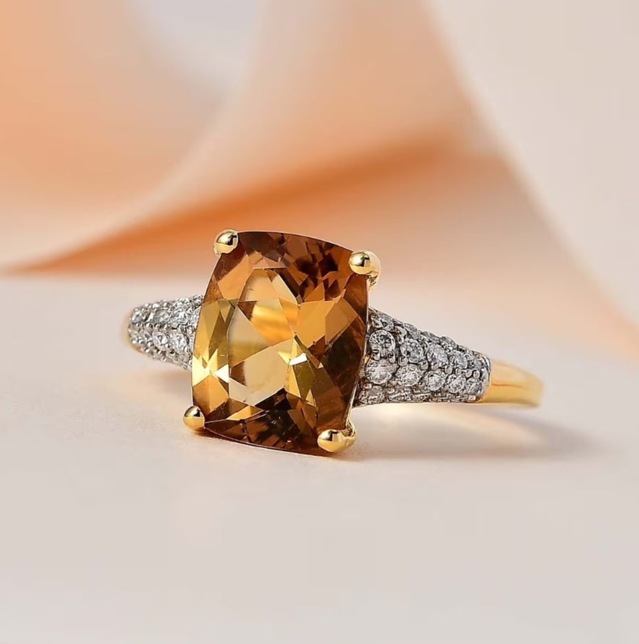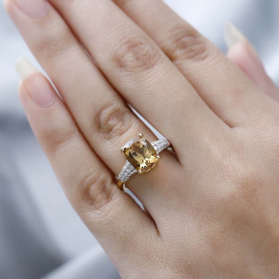This ring delivers a rich, golden glow with a clean, timeless silhouette. The centerpiece is a 2.60ct honey Scapolite, cut into a 10×8mm cushion with warm amber tones and bright internal fire. Its elegant faceting gives the gemstone a smooth, radiant presence that shifts beautifully in the light.