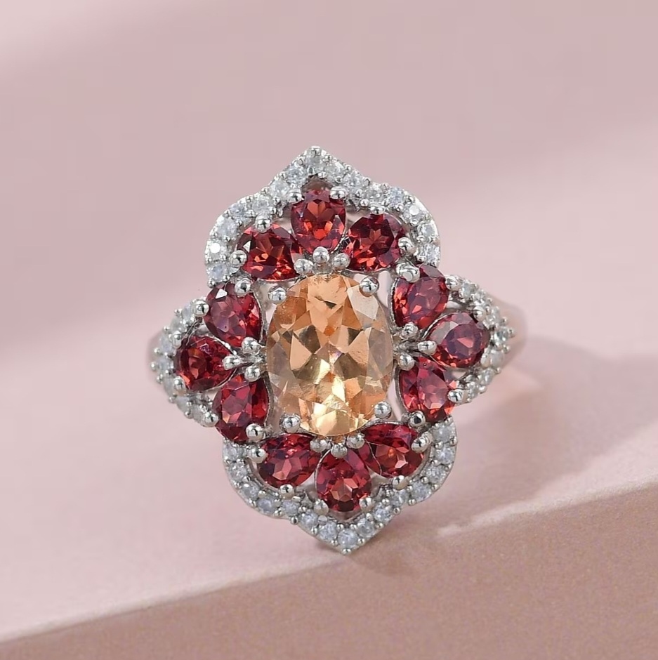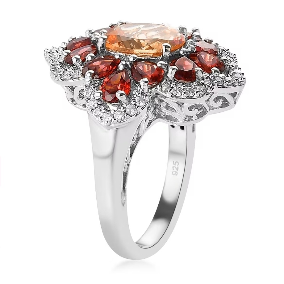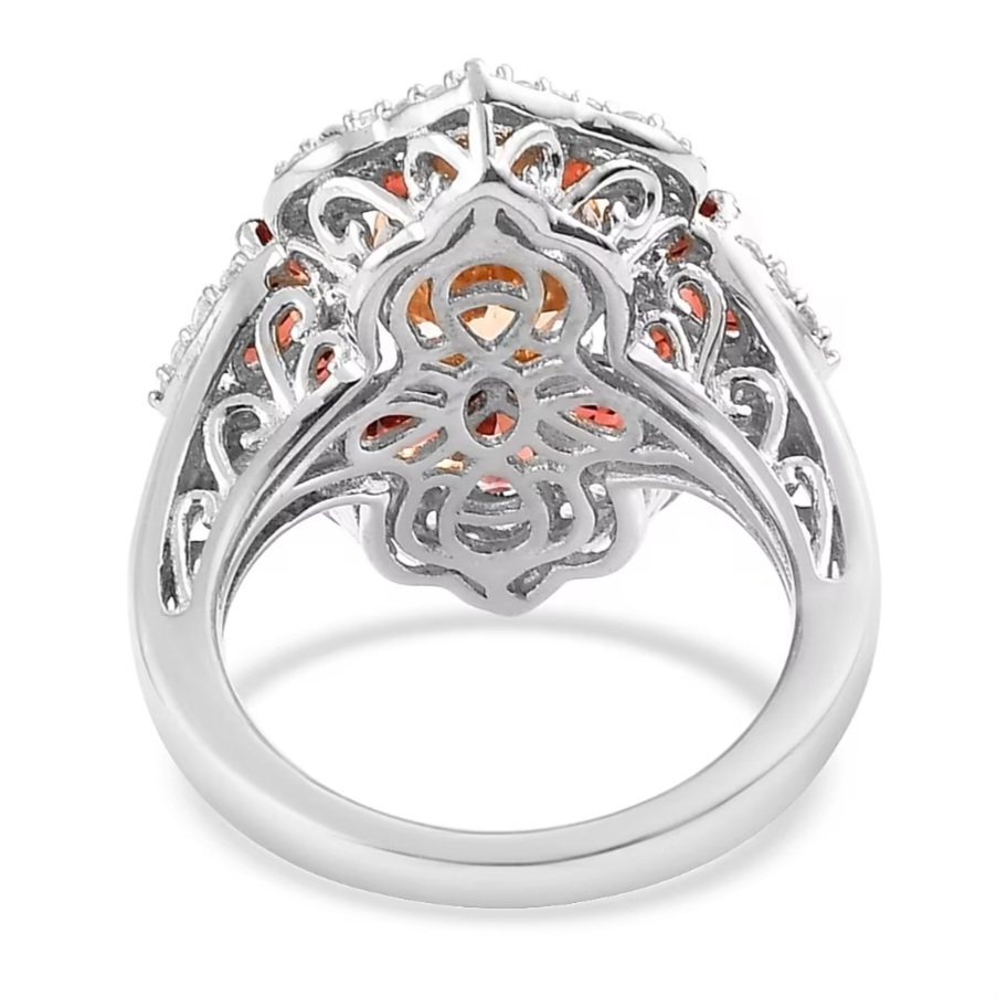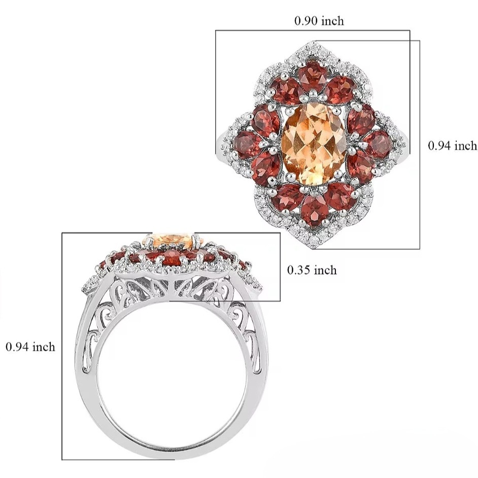 This commanding cocktail ring captures fire and precision in one unforgettable design. A rich Sri Lankan Imperial Garnet glows with golden-orange intensity at the center, surrounded by a radiating halo of Mozambique red garnets for depth and dimension. Framed by a final ring of white zircons, the arrangement creates a burst of color and brilliance reminiscent of molten sunlight through crystal. Set in rhodium-plated sterling silver with a balanced, sculpted undergallery, it delivers bold gemstone geometry and high-impact sparkle made for the spotlight.