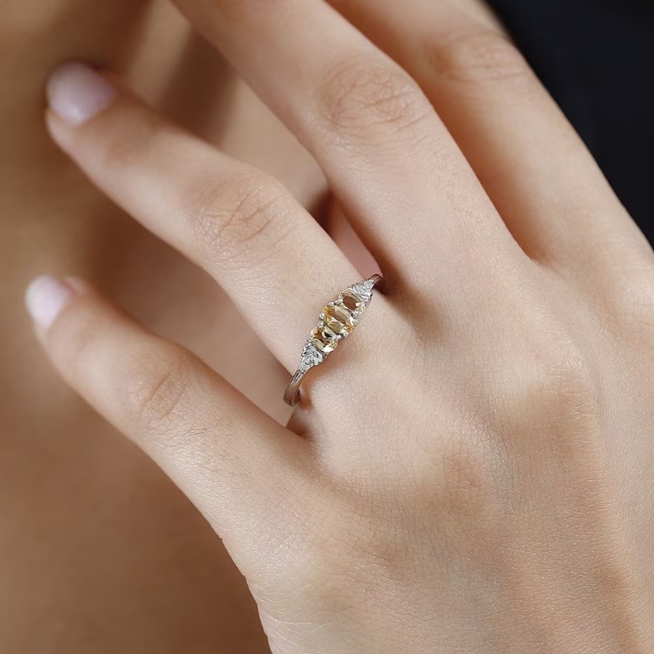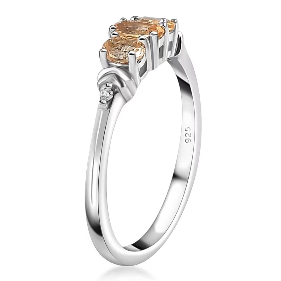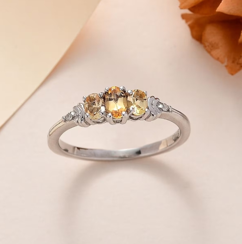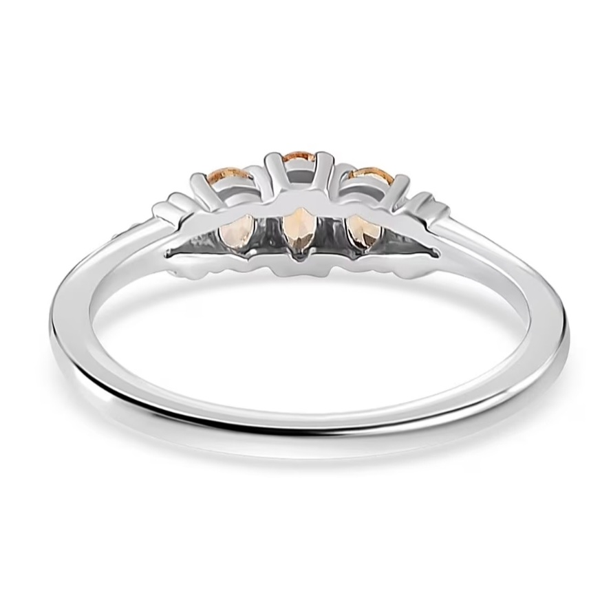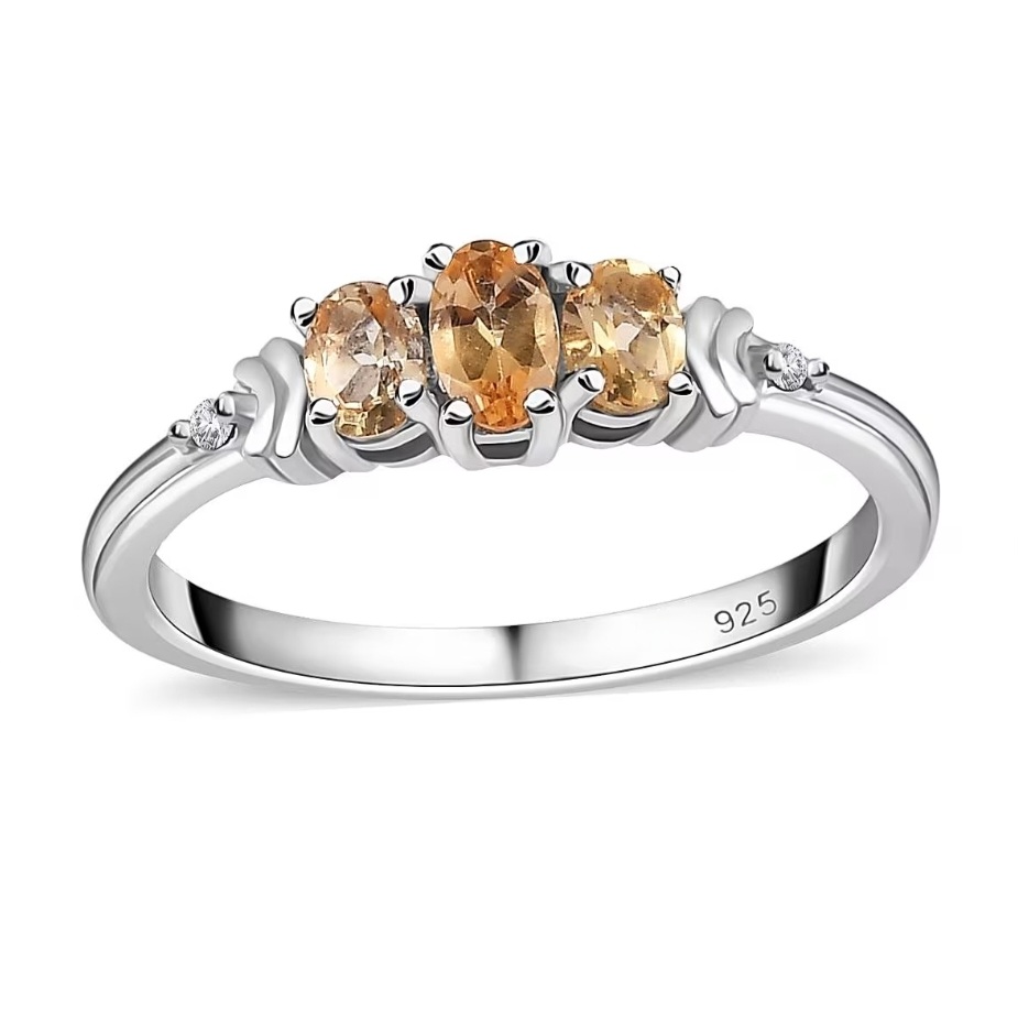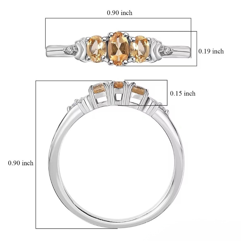 This ring celebrates classic trilogy design with natural Imperial Topaz in warm golden tones, each oval cut reflecting pure light and balance. Two diamond accents punctuate the sides for subtle brilliance, while the high-polish rhodium finish adds crisp contrast and longevity.