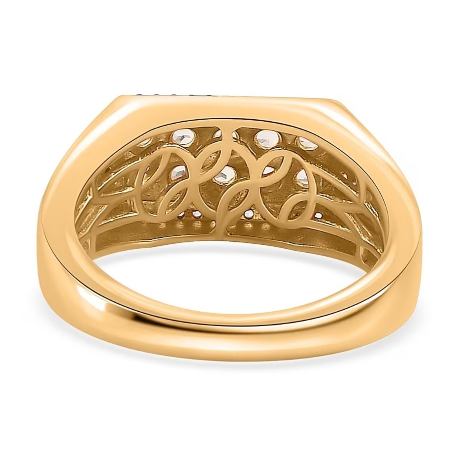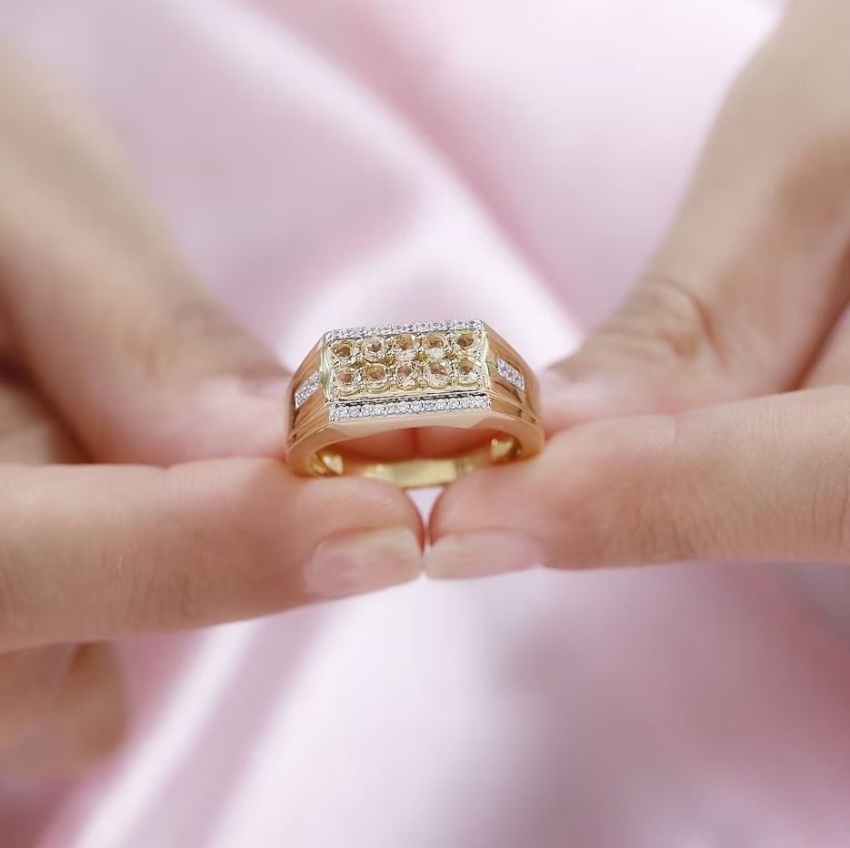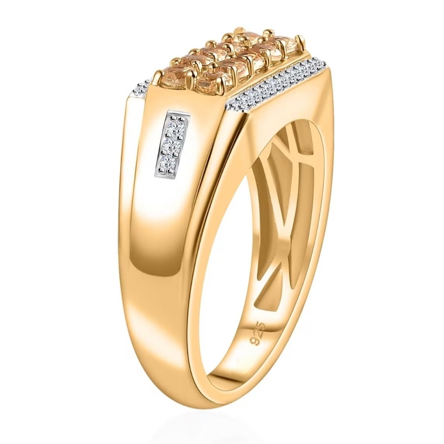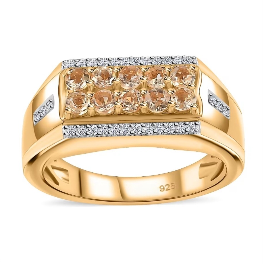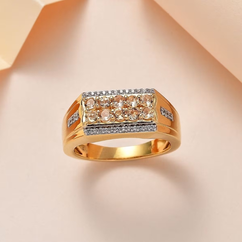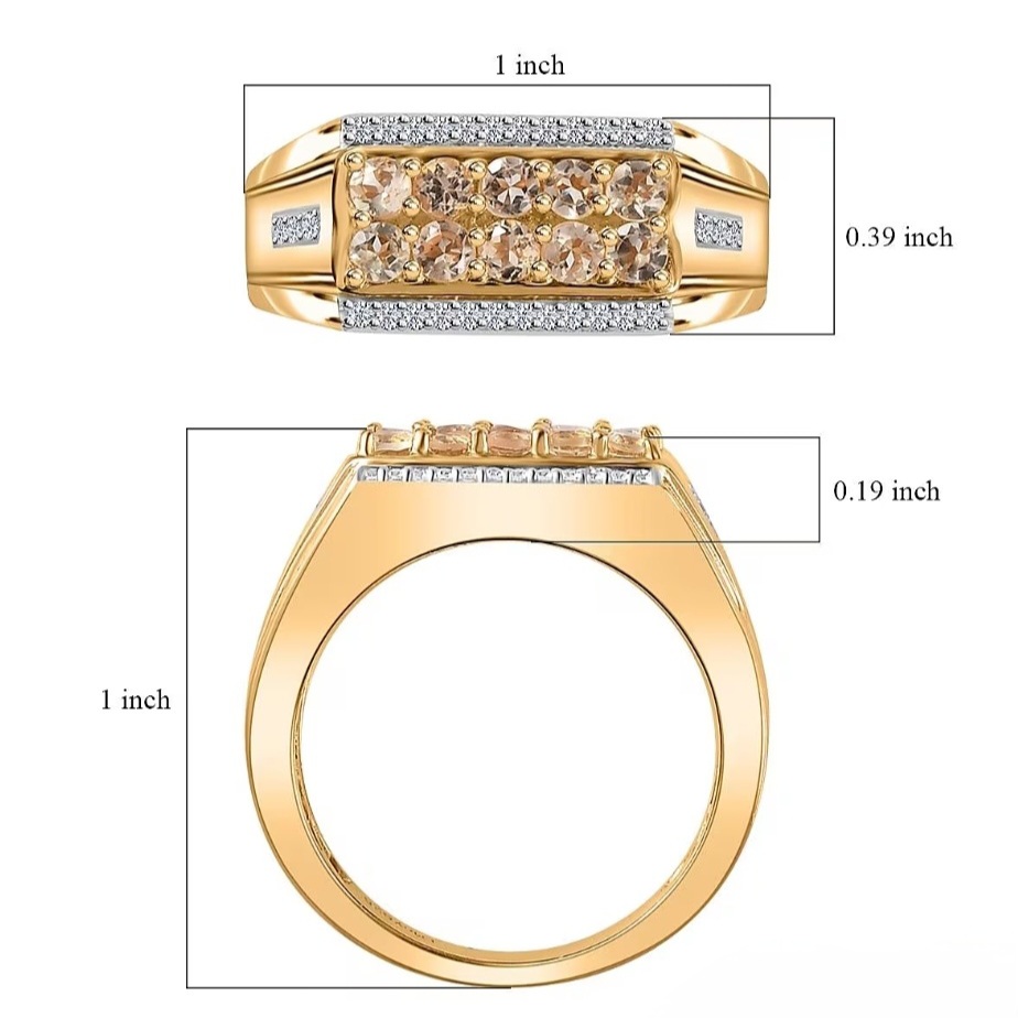This gents ring features a line of golden Imperial Topaz stones across a bold rectangular face, surrounded by precision-set white zircons for a flash of brilliance. The geometric arrangement delivers symmetry and structure — confident without excess.