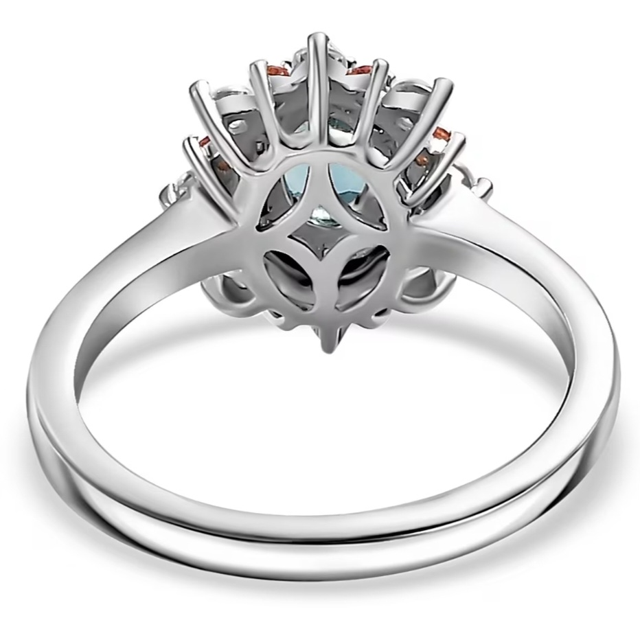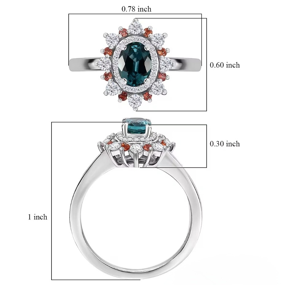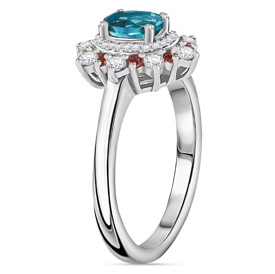 This ring hits like contrast in its purest form. A deep Brazilian indicolite tourmaline — that cool, storm-blue fire — burns from the center, surrounded by flashes of Padparadscha sapphire that pulse warm orange-pink around it. Every moissanite in the halo throws clean white light, sharpening the color tension until it glows from every angle.