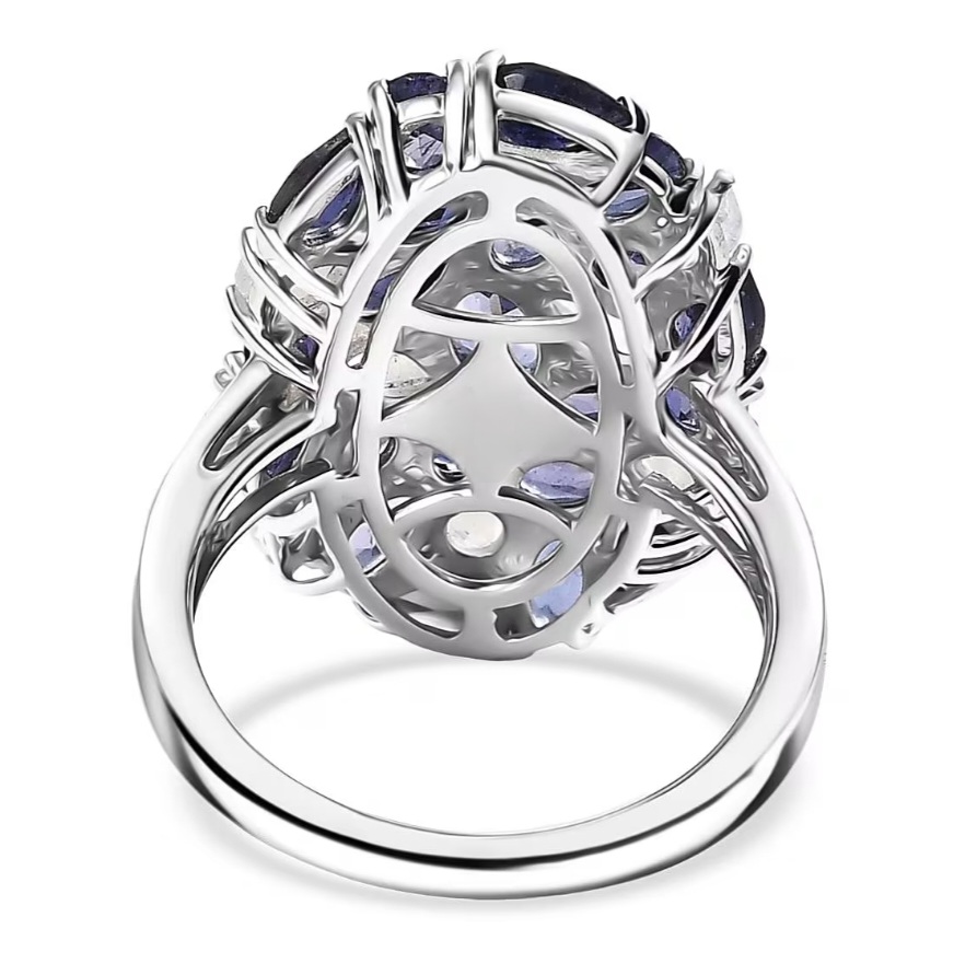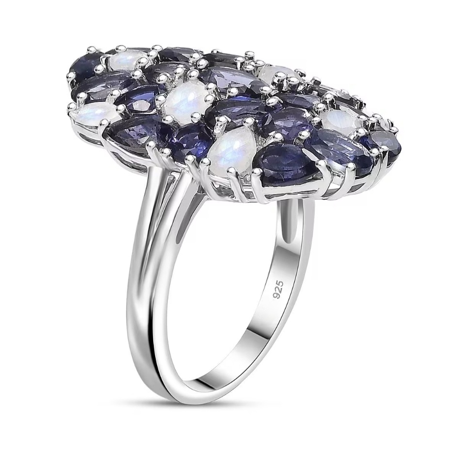 Finished in rhodium over sterling silver, the setting has a bright, polished tone that complements both the cooler iolite hues and the reflective quality of the moonstone.