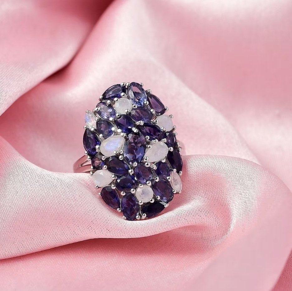 The iolite brings a deep purple-blue tone, forming the main body of the design, while the rainbow moonstone introduces lighter flashes of color that break up the darker base. The contrast between the two creates movement across the ring, with the moonstone catching light and shifting against the more saturated iolite.