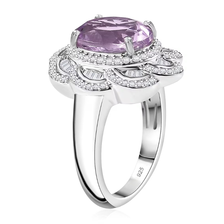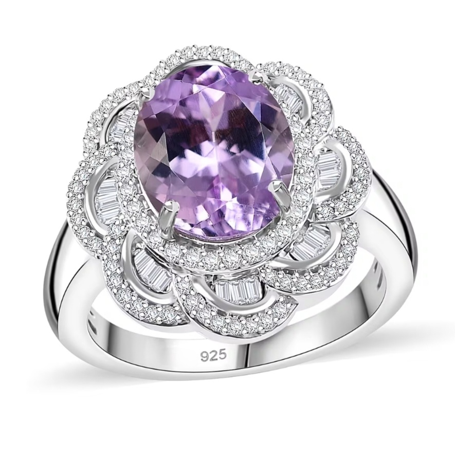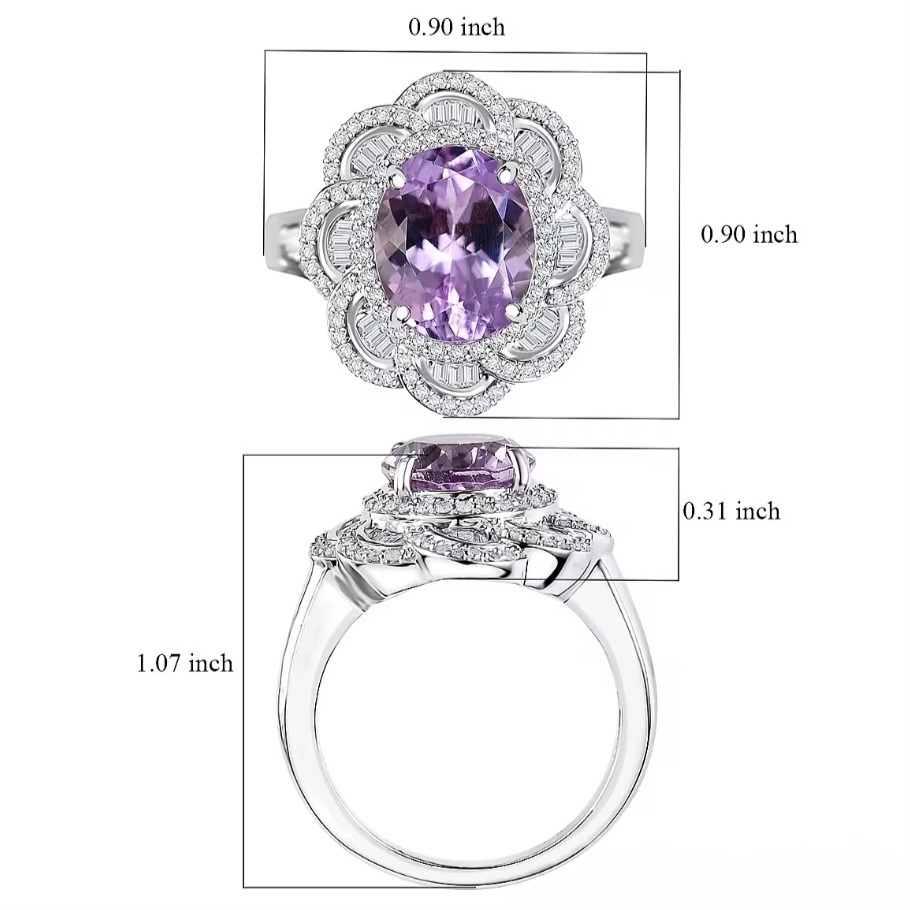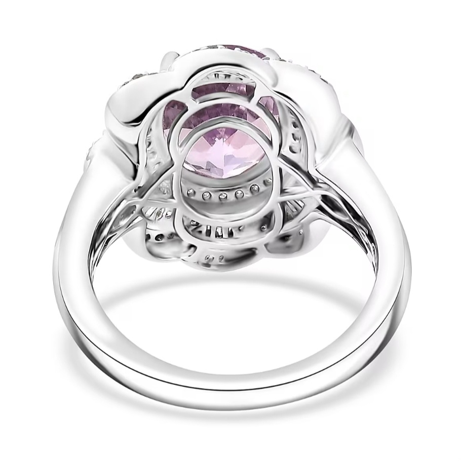 Set in solid 925 sterling silver and finished in bright rhodium plating, the metal stays crisp and mirror-bright, enhancing the contrast between the icy diamond sparkle and the soft pink-violet kunzite center.