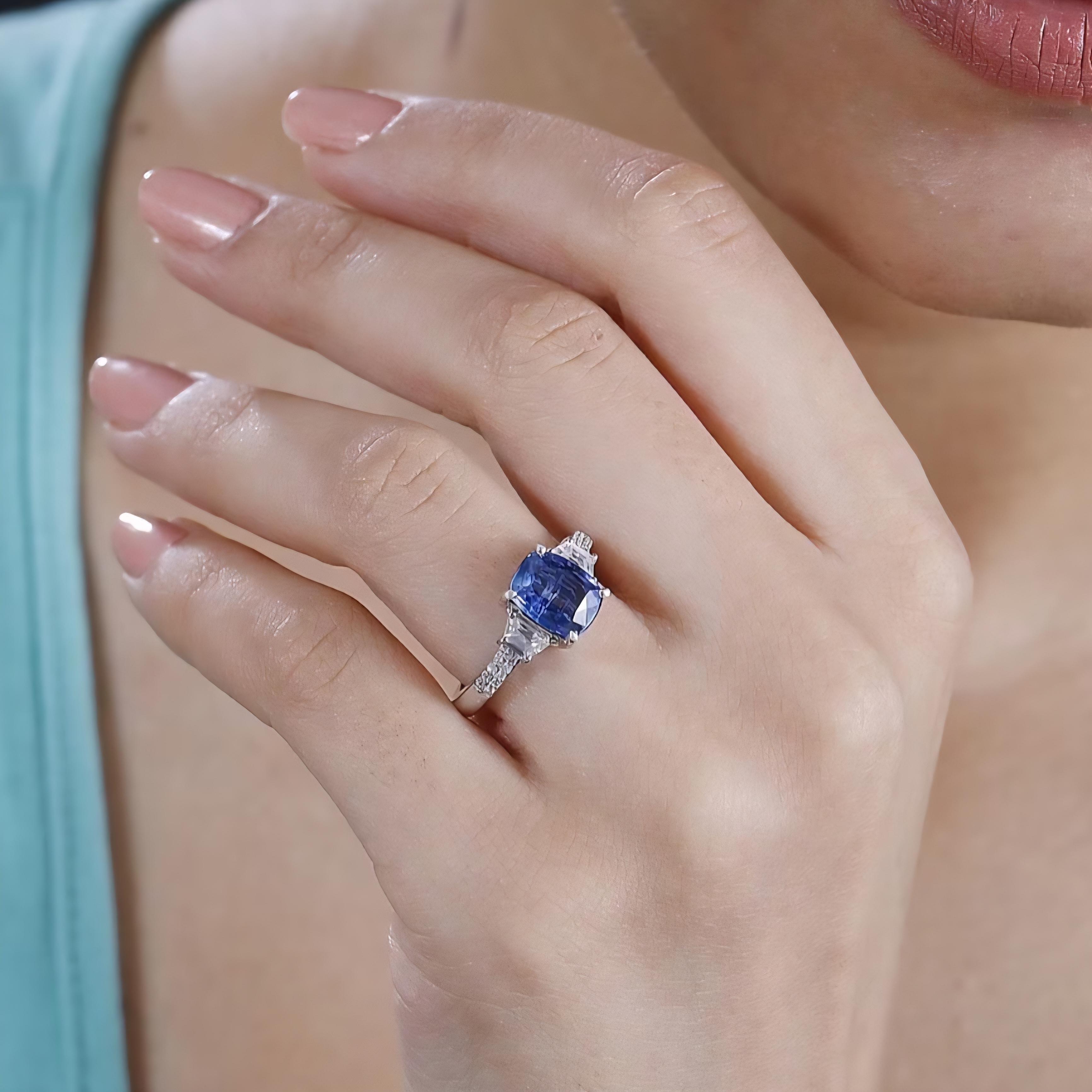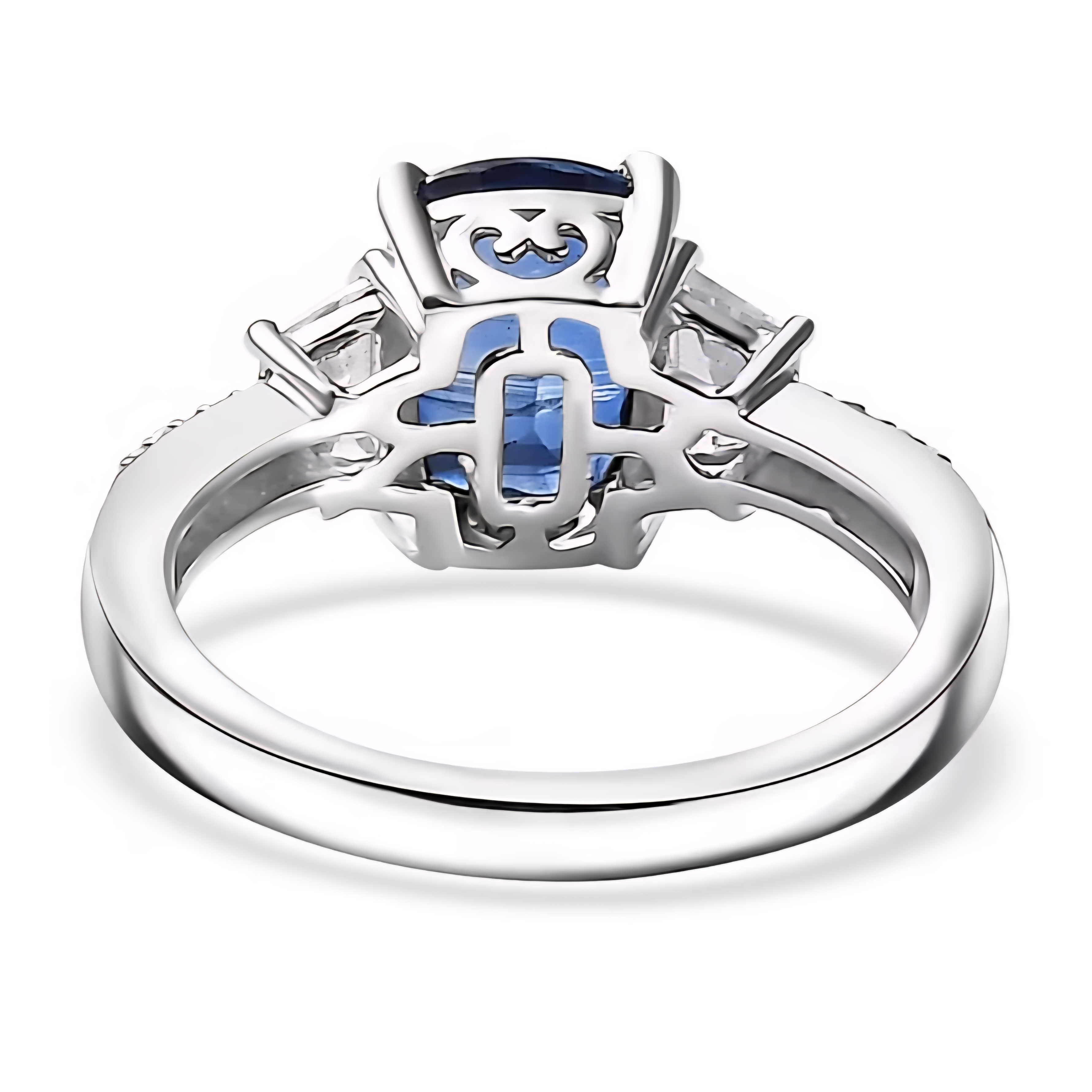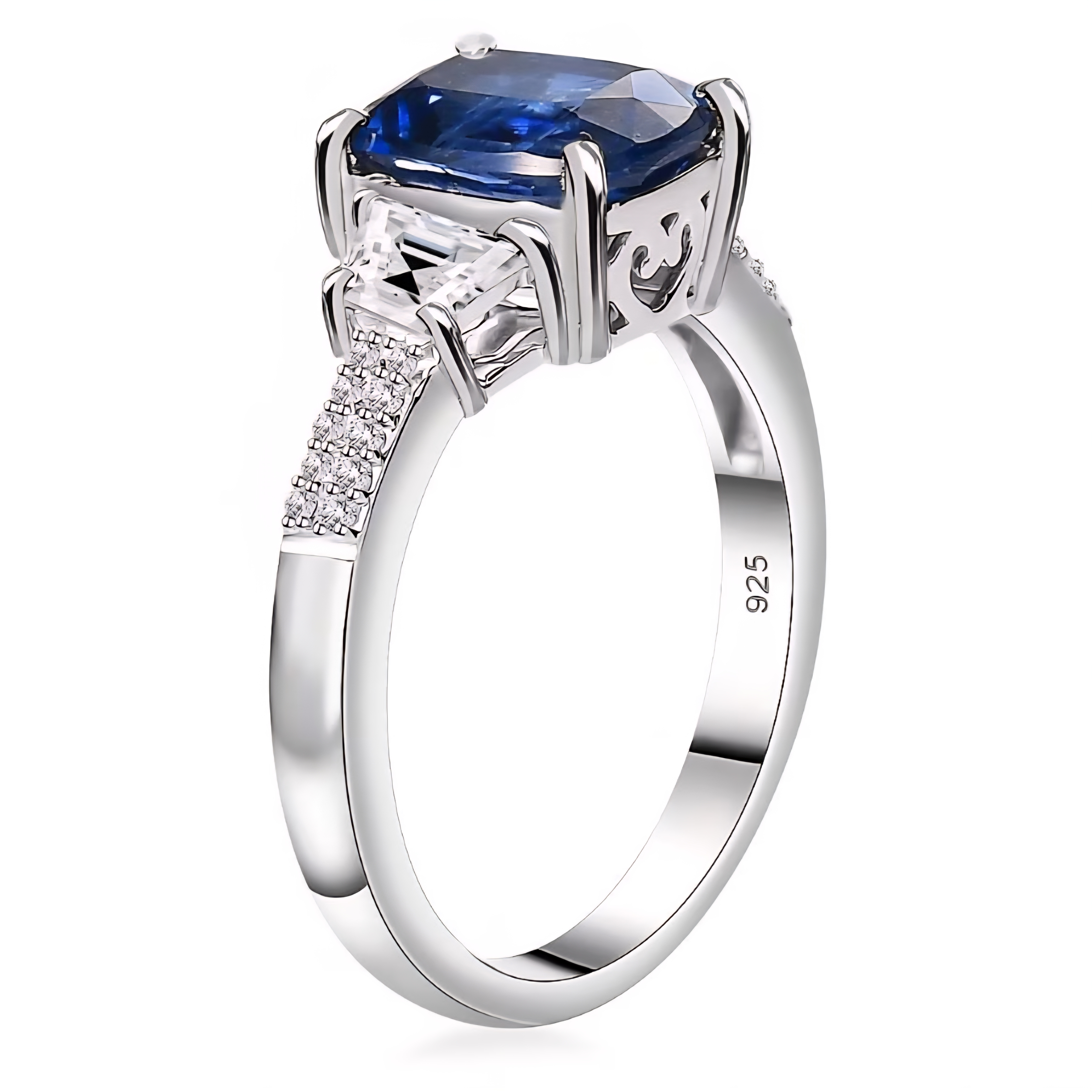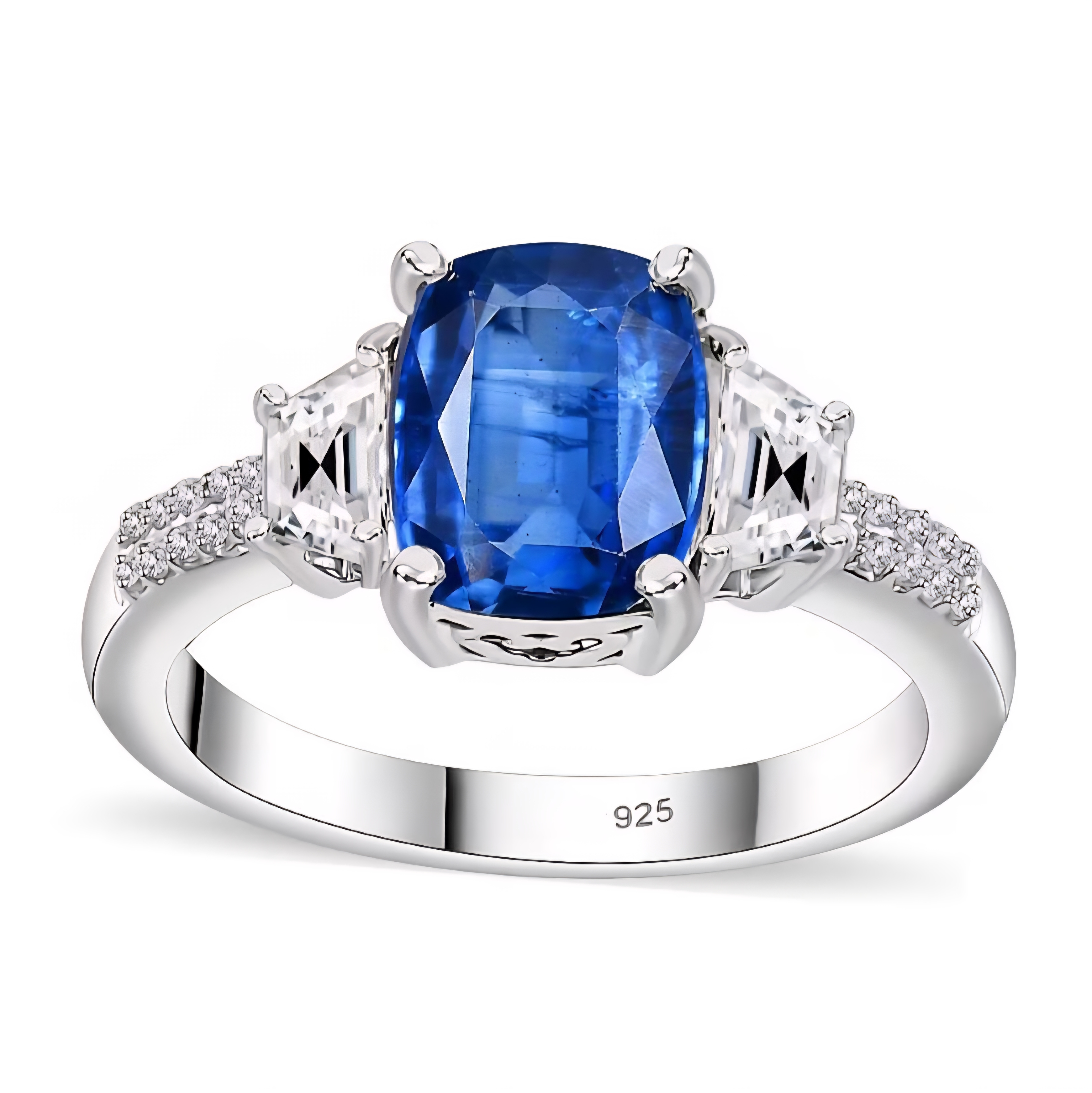 This elegant three stone ring features a vivid blue oval kyanite as the centerpiece, framed by crisp trapezoid cut white zircon side stones for a clean, structured look. Additional round white zircon accents along the shoulders add extra brilliance without overpowering the center stone. Crafted in solid 925 sterling silver and finished in rhodium plating, this design delivers a bright white metal finish that enhances the kyanite’s saturated blue color while keeping the overall look refined and modern.