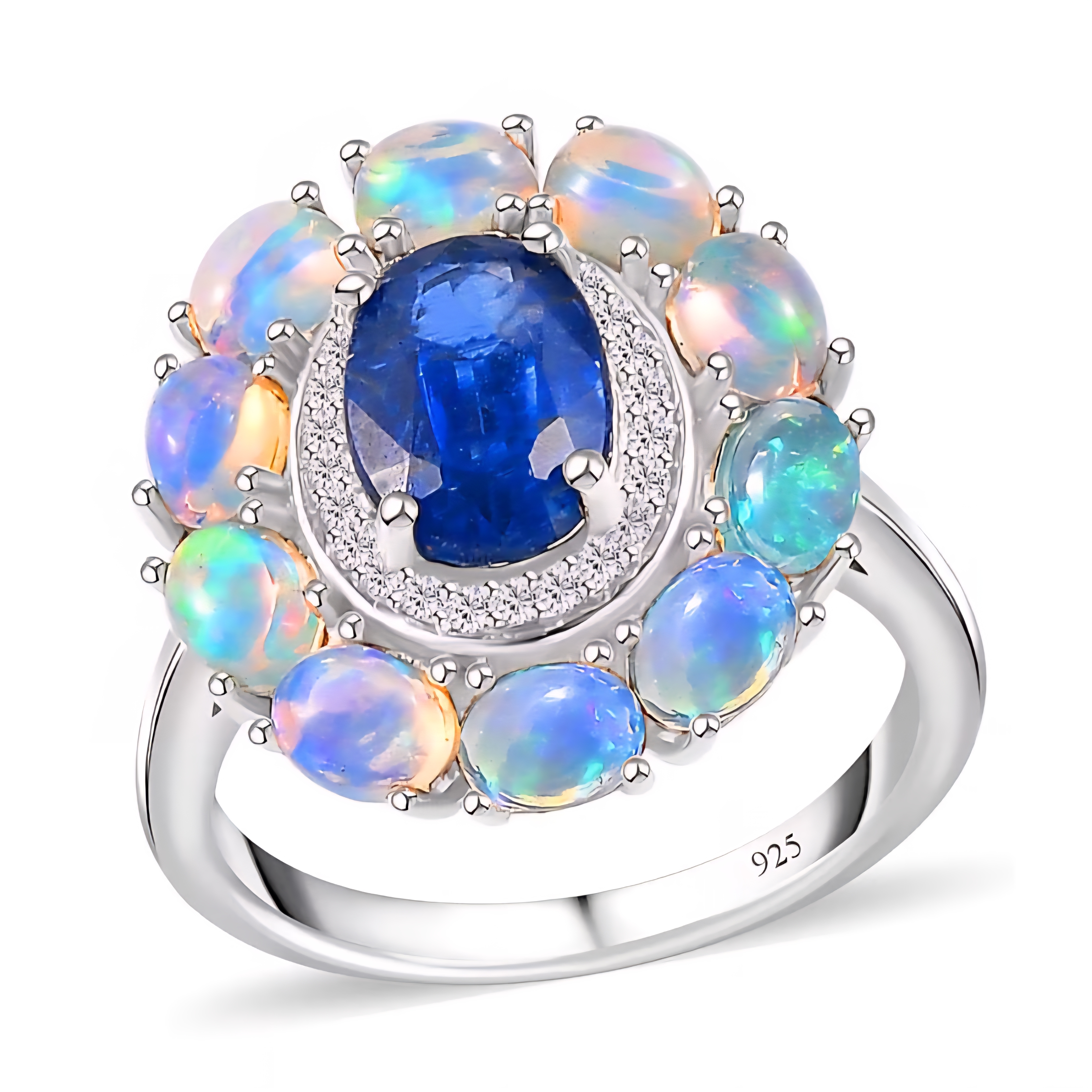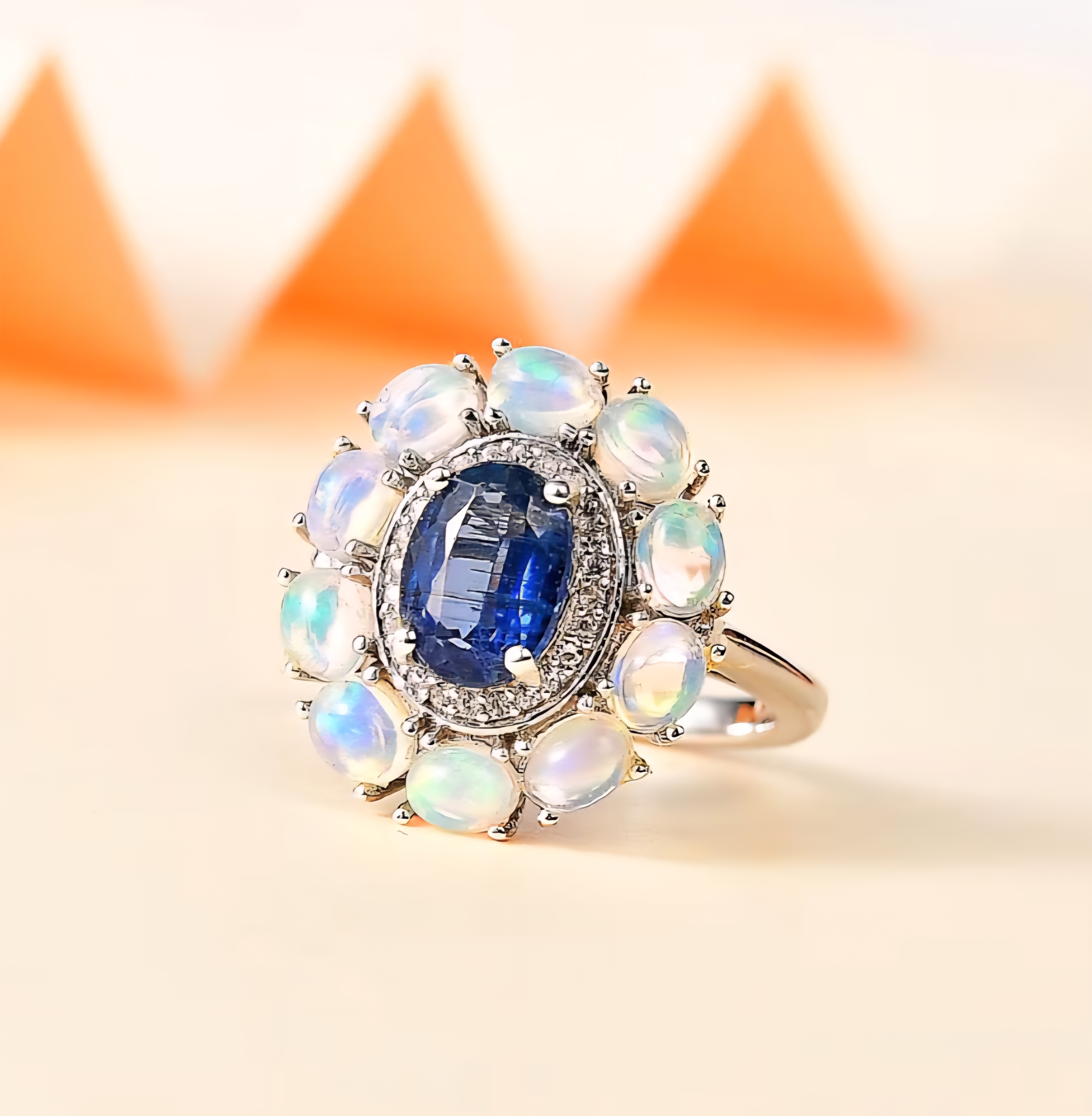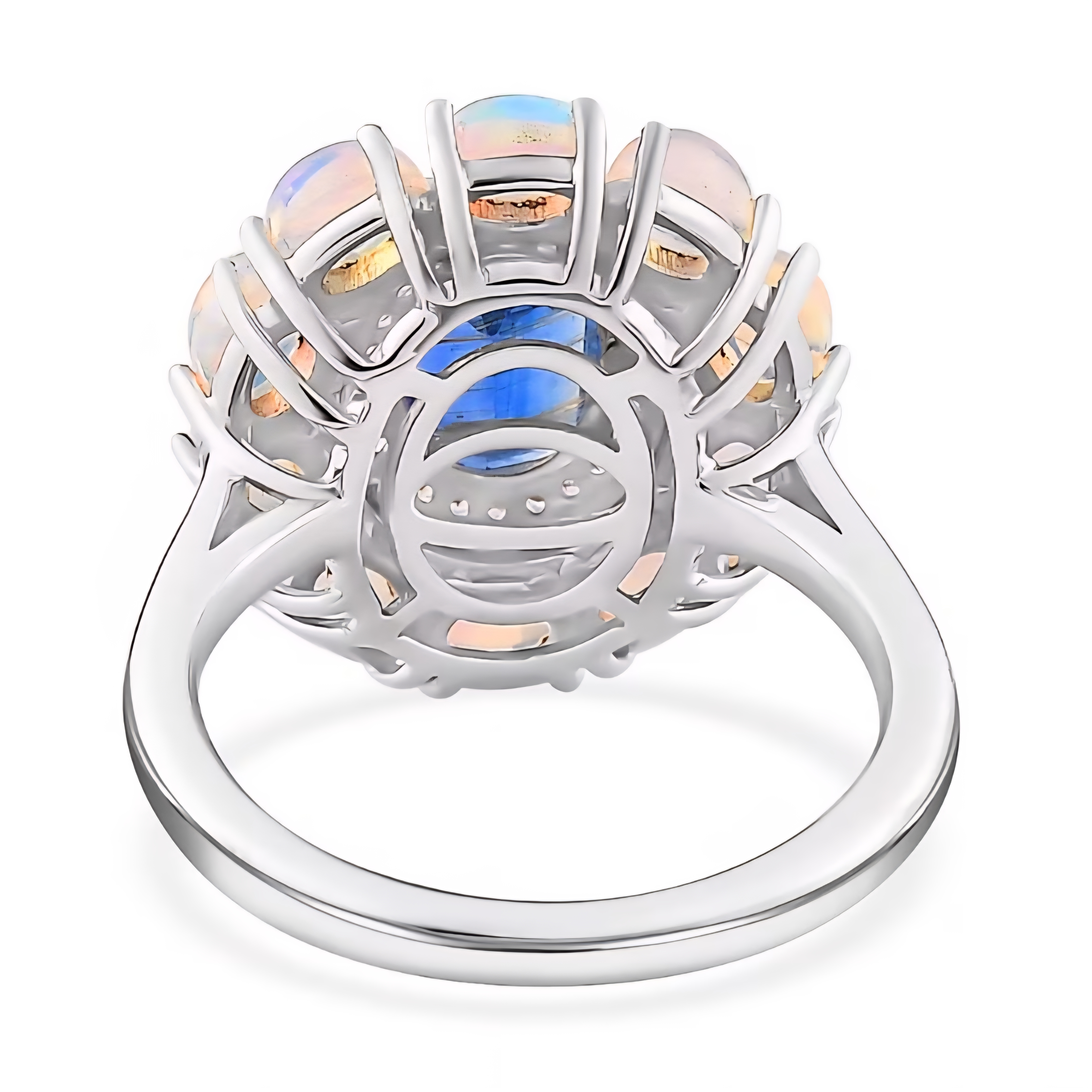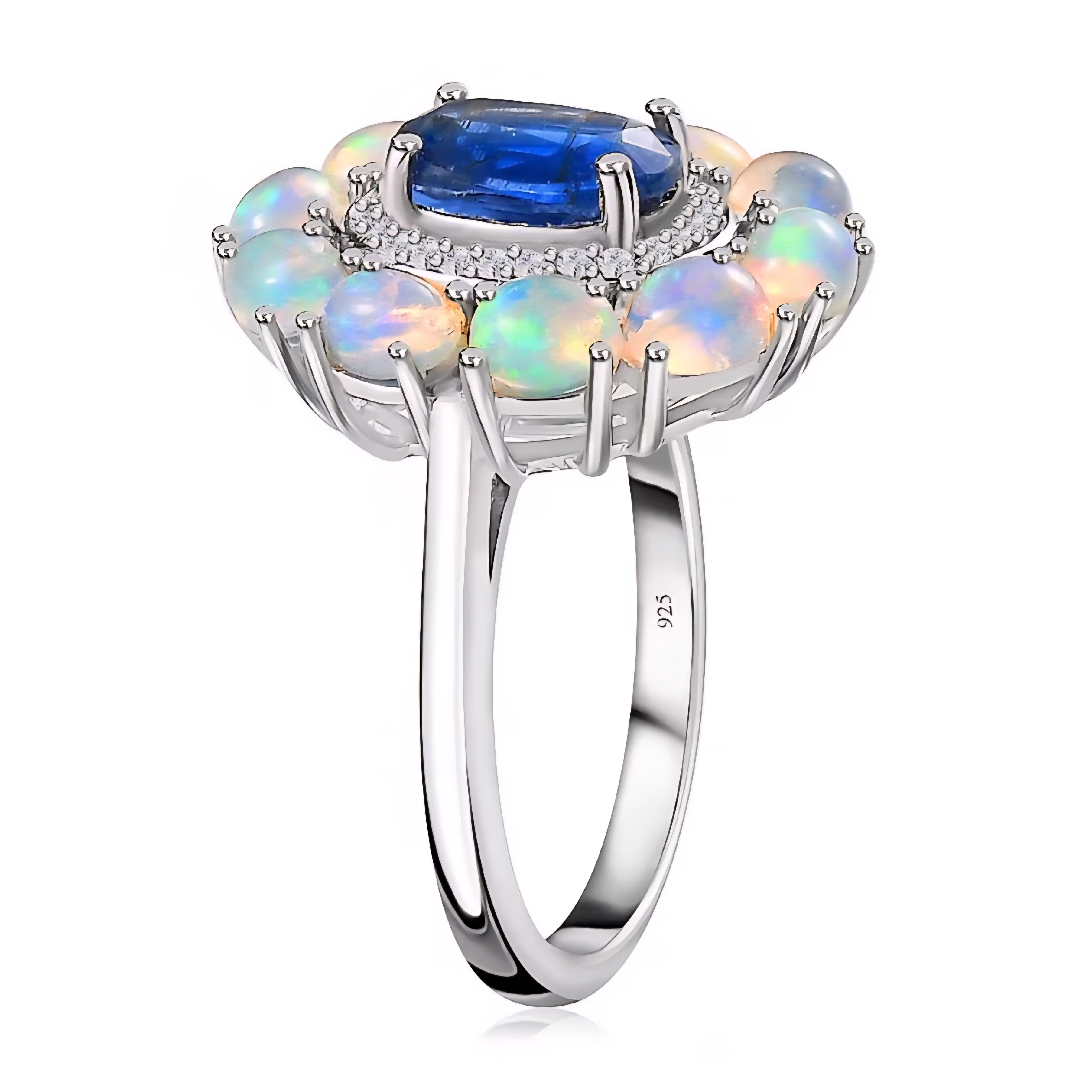 This ring radiates light from every angle. A vivid 1.54ct oval Kyanite takes center stage, surrounded by a halo of Ethiopian opals glowing with shifting rainbow fire and framed by sparkling white zircons. Each gem amplifies the next — the deep blue heart of Kyanite, the ethereal flash of Opal, the brilliance of Zircon — all unified in a polished rhodium finish over solid 925 sterling silver. Designed for maximum drama and dimension, this ring captures both color and craftsmanship in one unforgettable statement.