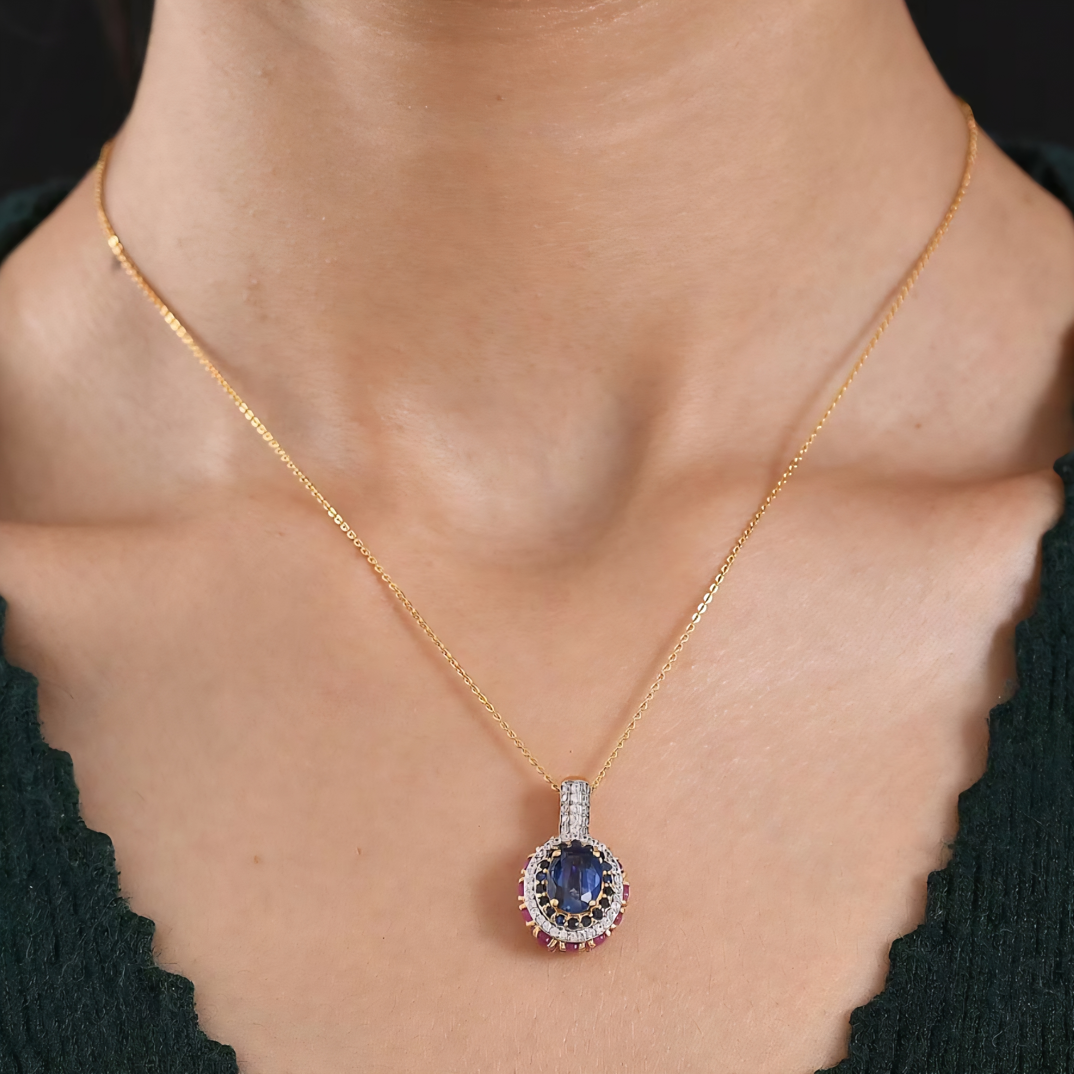 Crafted in solid 925 sterling silver and finished with luxurious 18K yellow gold vermeil, the warm gold tone enhances the richness of the kyanite while highlighting the vibrant ruby and sapphire accents. The result is a bold multi gemstone pendant designed to stand out from every angle.
