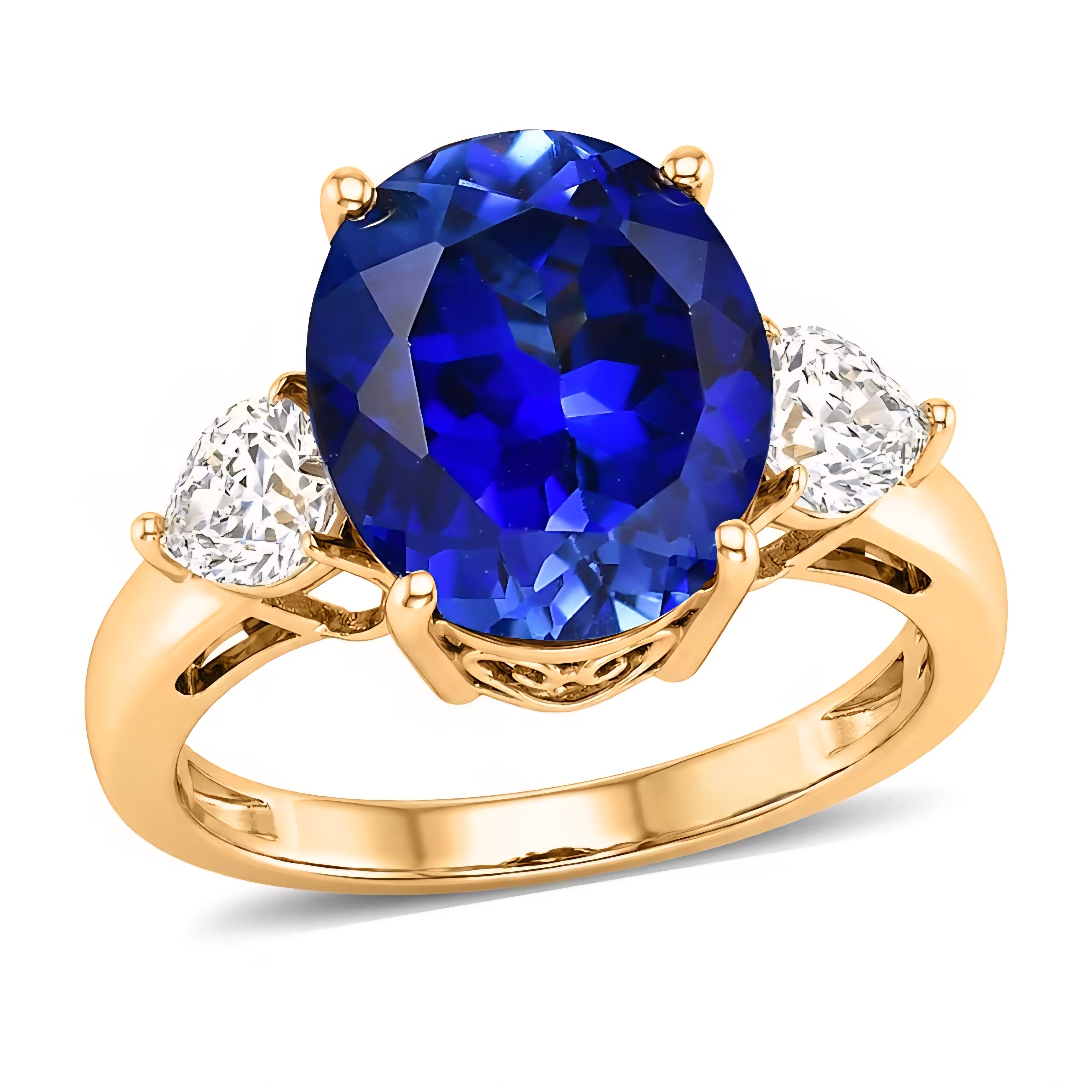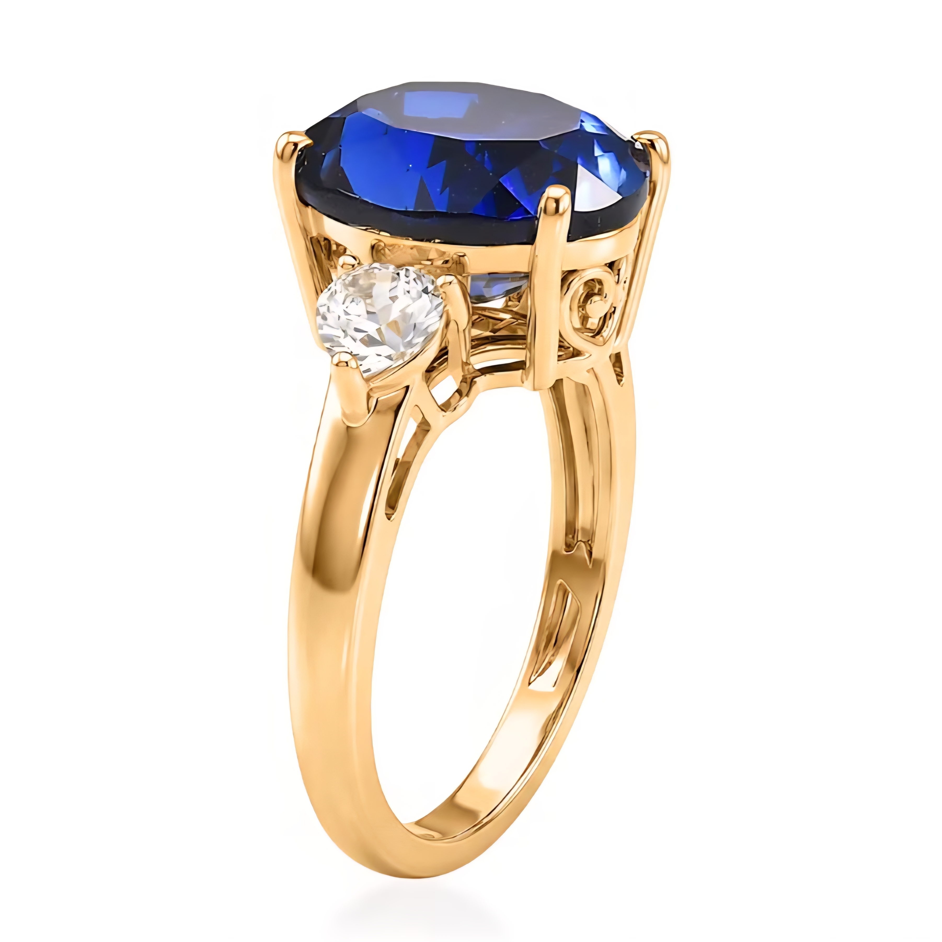 On each side of the center stone sits a heart shaped white sapphire accent, adding bright contrast and elegant sparkle to the design. The combination of the rich blue sapphire and the crisp white accents creates a classic three stone style that highlights the center gem beautifully.