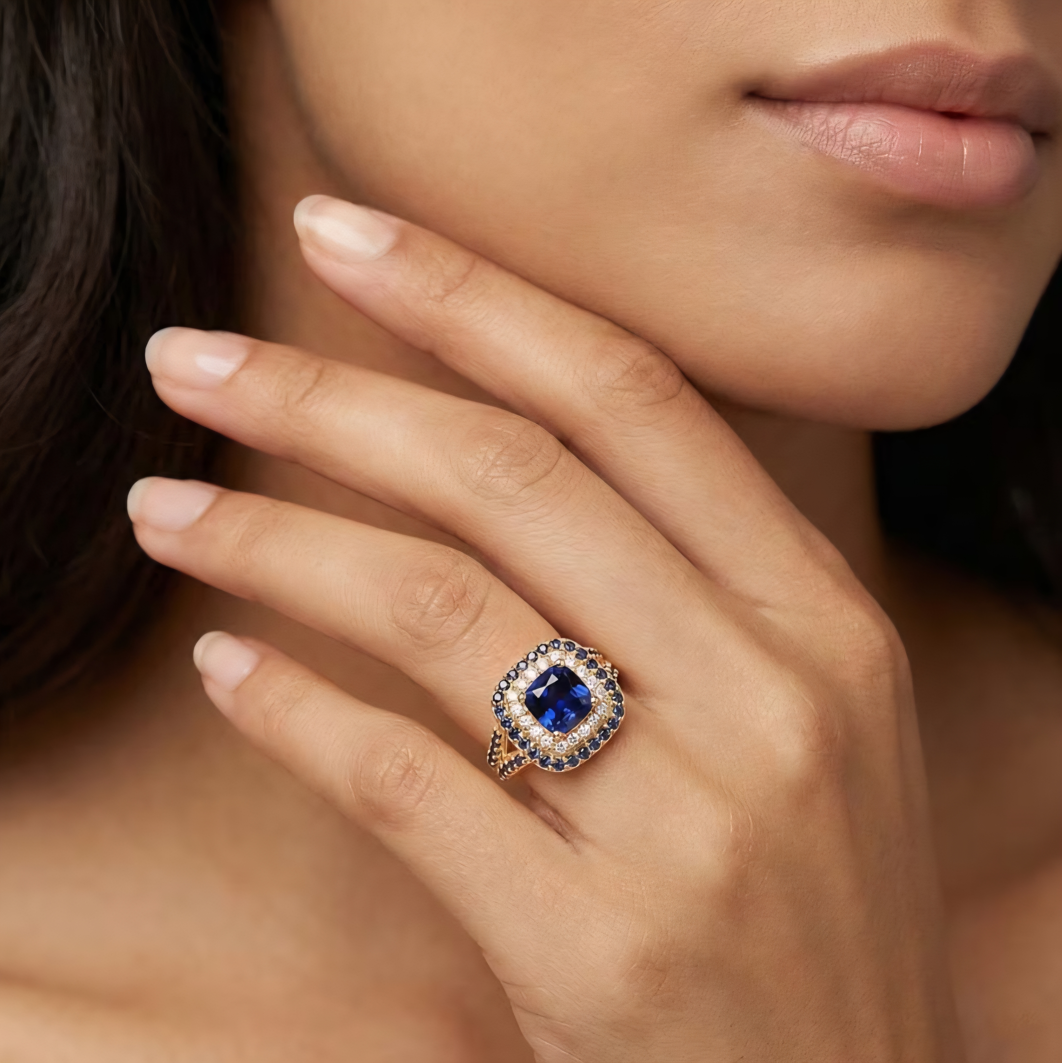 Surrounding the center sapphire are layered halos of lab created sapphires. A halo of bright white sapphires adds brilliance around the center stone, while a second halo of blue sapphires deepens the color contrast and enhances the overall design. Additional blue sapphires along the shoulders continue the sparkle across the ring.