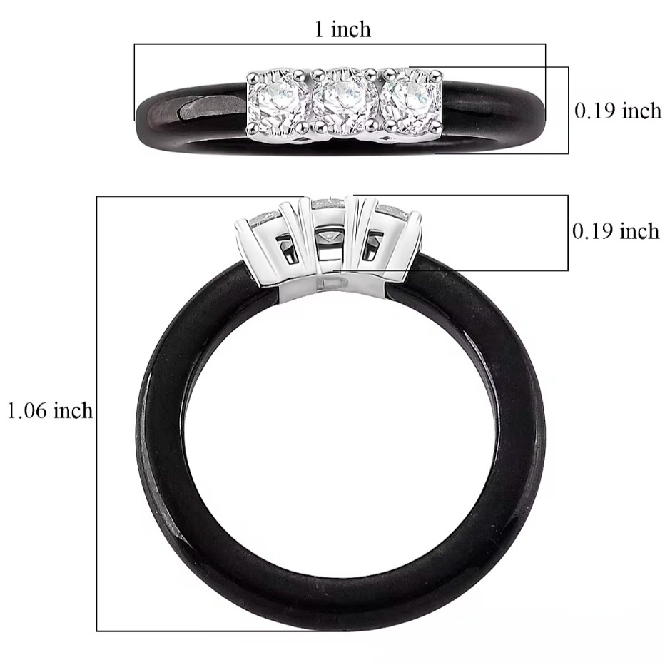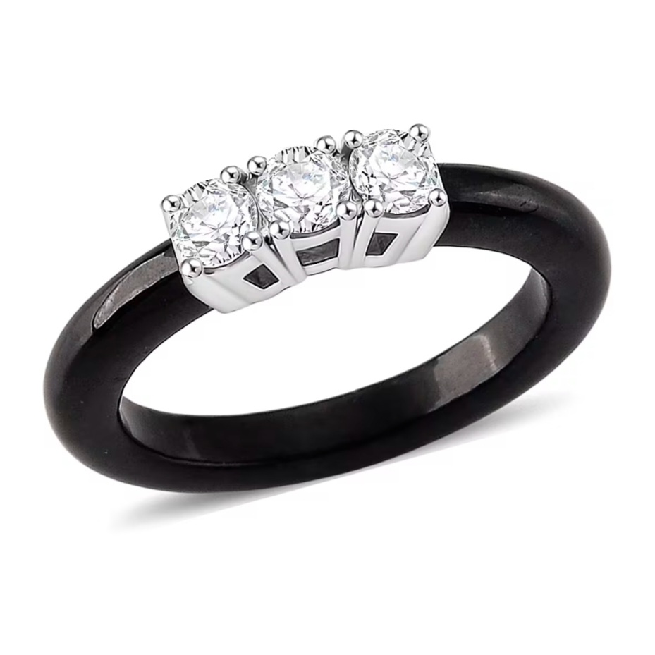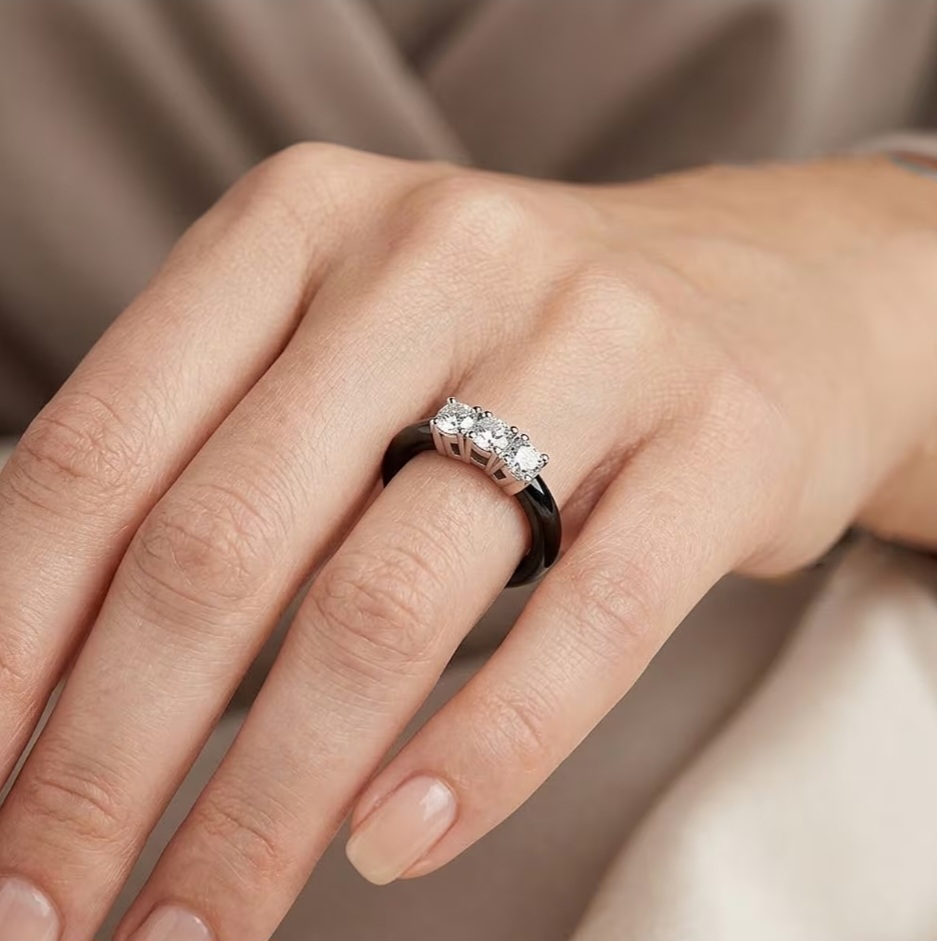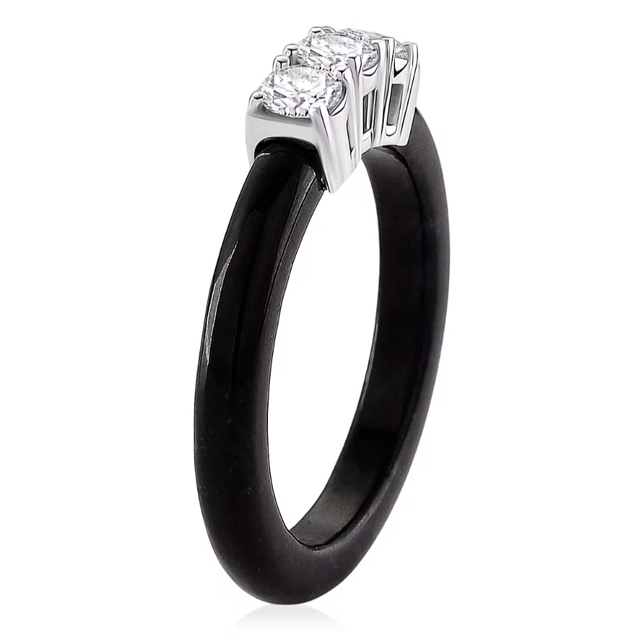 This black jade ring features a classic three-stone layout set across a smooth, carved band. Three round lab grown diamonds are aligned across the top, creating a clear, balanced focal point with strong light return.