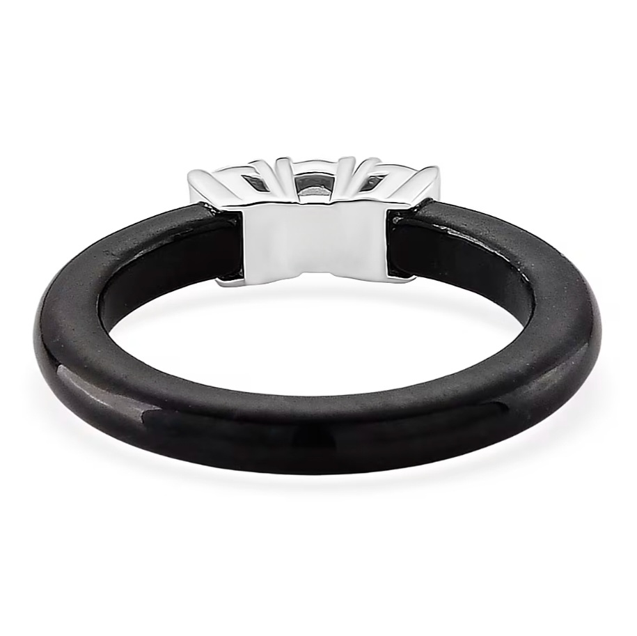 The jade band is polished and slightly rounded, giving the ring a continuous, solid feel with a deep black finish. This dark surface provides sharp contrast, allowing each diamond to stand out clearly without distraction.