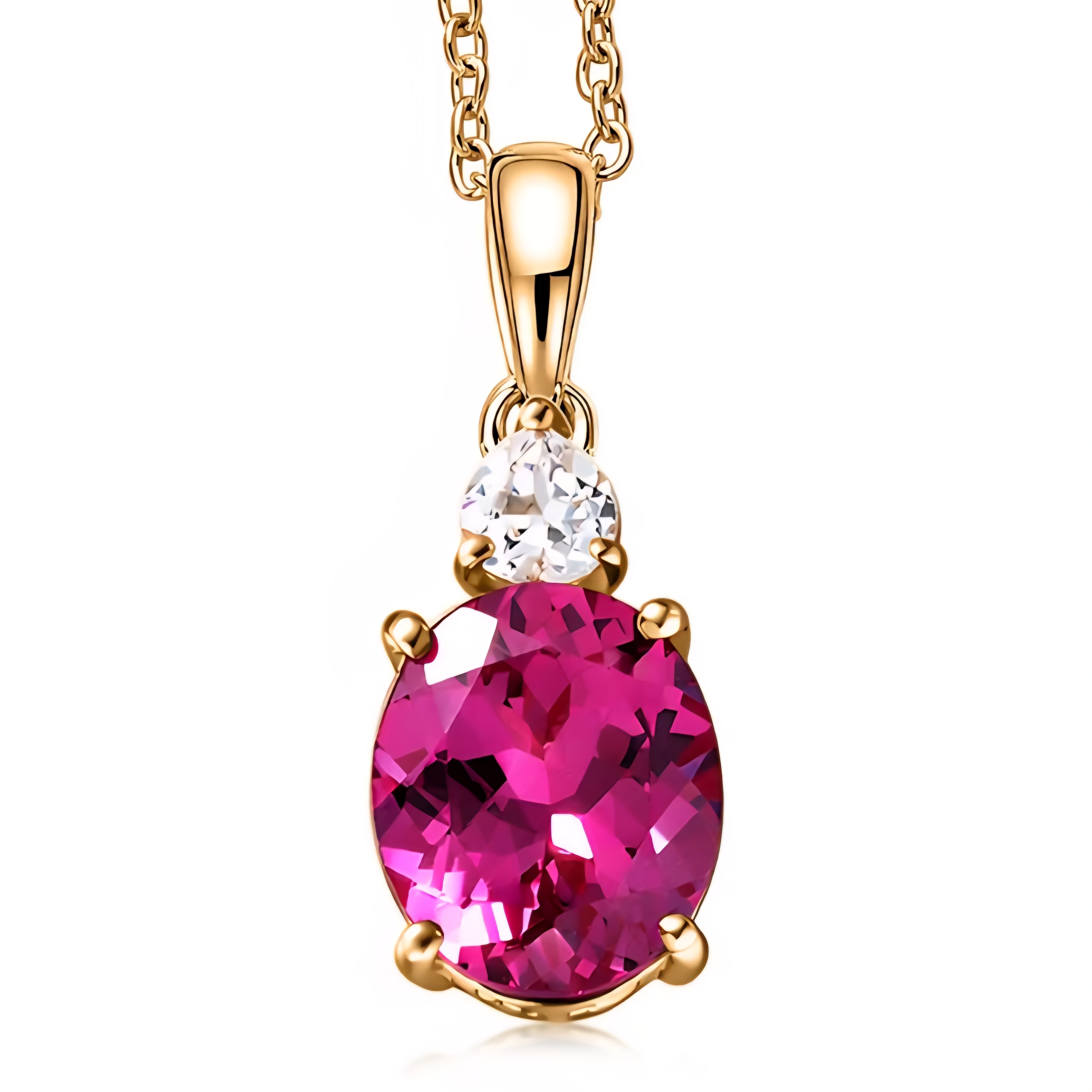This pendant features a vibrant oval lab created pink sapphire measuring 12x10mm and weighing an impressive 6.92 carats. The rich pink color and large size create a bold focal point with strong brilliance and eye catching color.