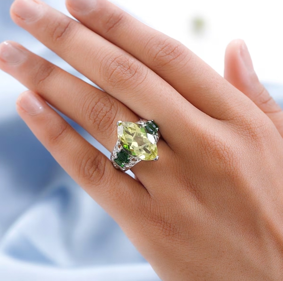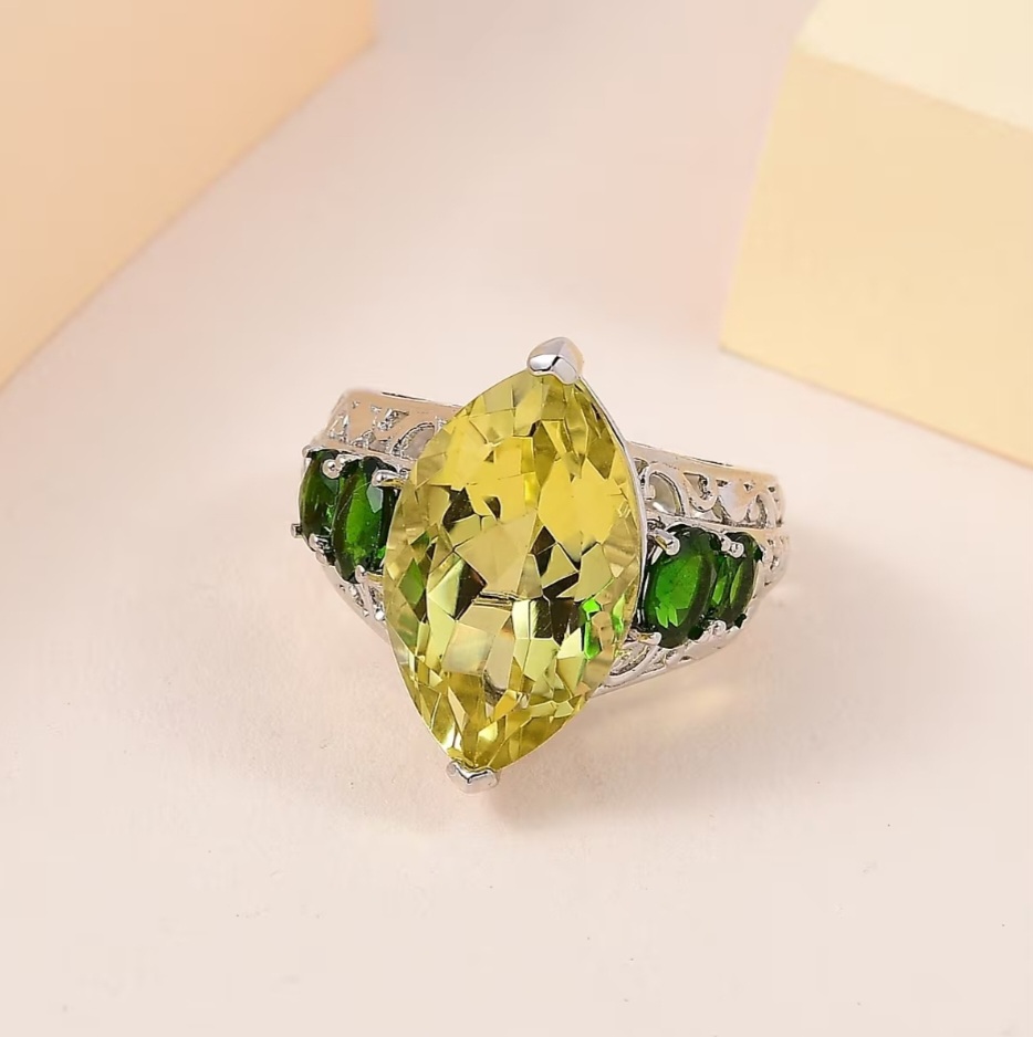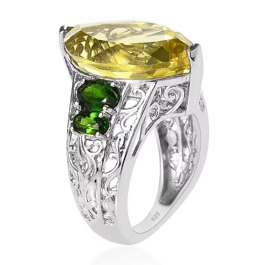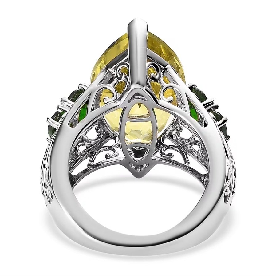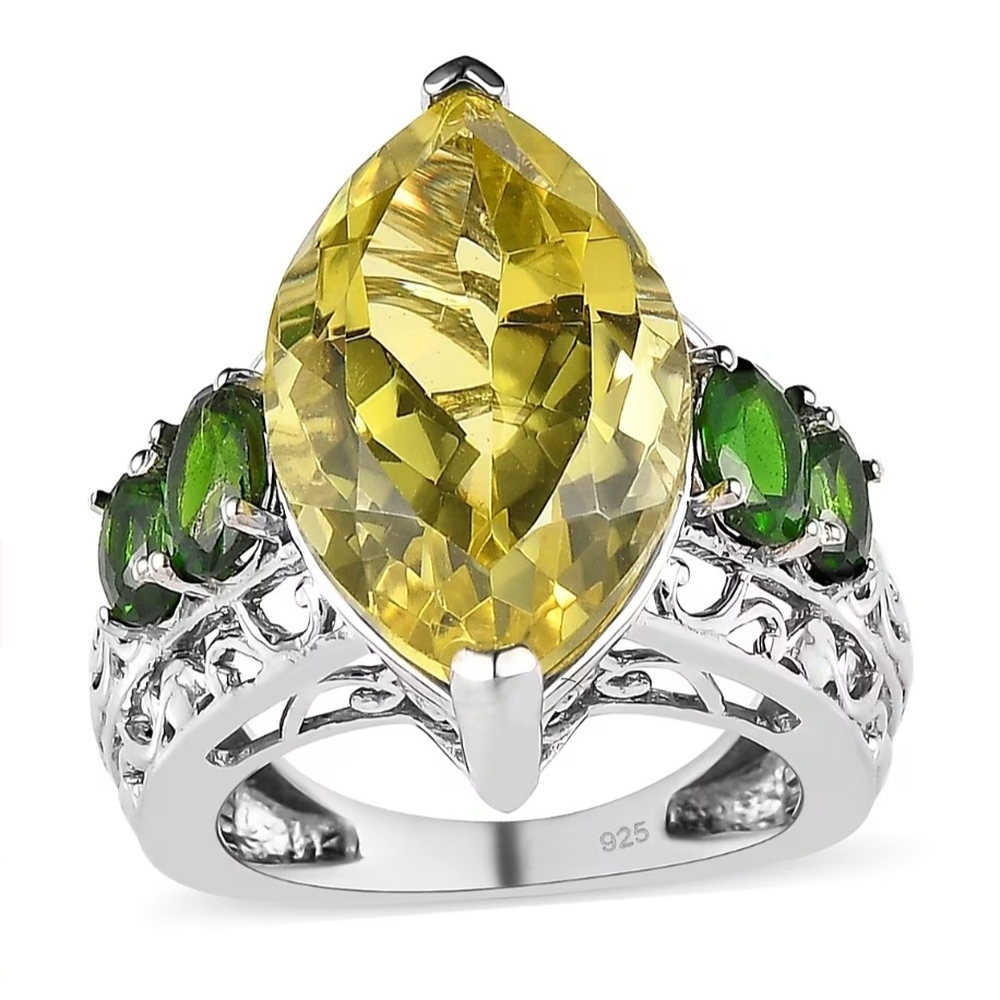 Command the room with a bold marquise lemon quartz—20×12mm and 10.86ct of sunlit sparkle—framed by rich forest-green chrome diopside ovals across a sculpted, filigree under-gallery. High-polish rhodium over solid 925 sterling silver keeps the look bright and tarnish-resistant, while the elongated marquise silhouette slenderizes the finger and the vivid green accents intensify the golden hue. A true statement cocktail ring with eye-catching contrast, luxurious presence, and everyday durability.