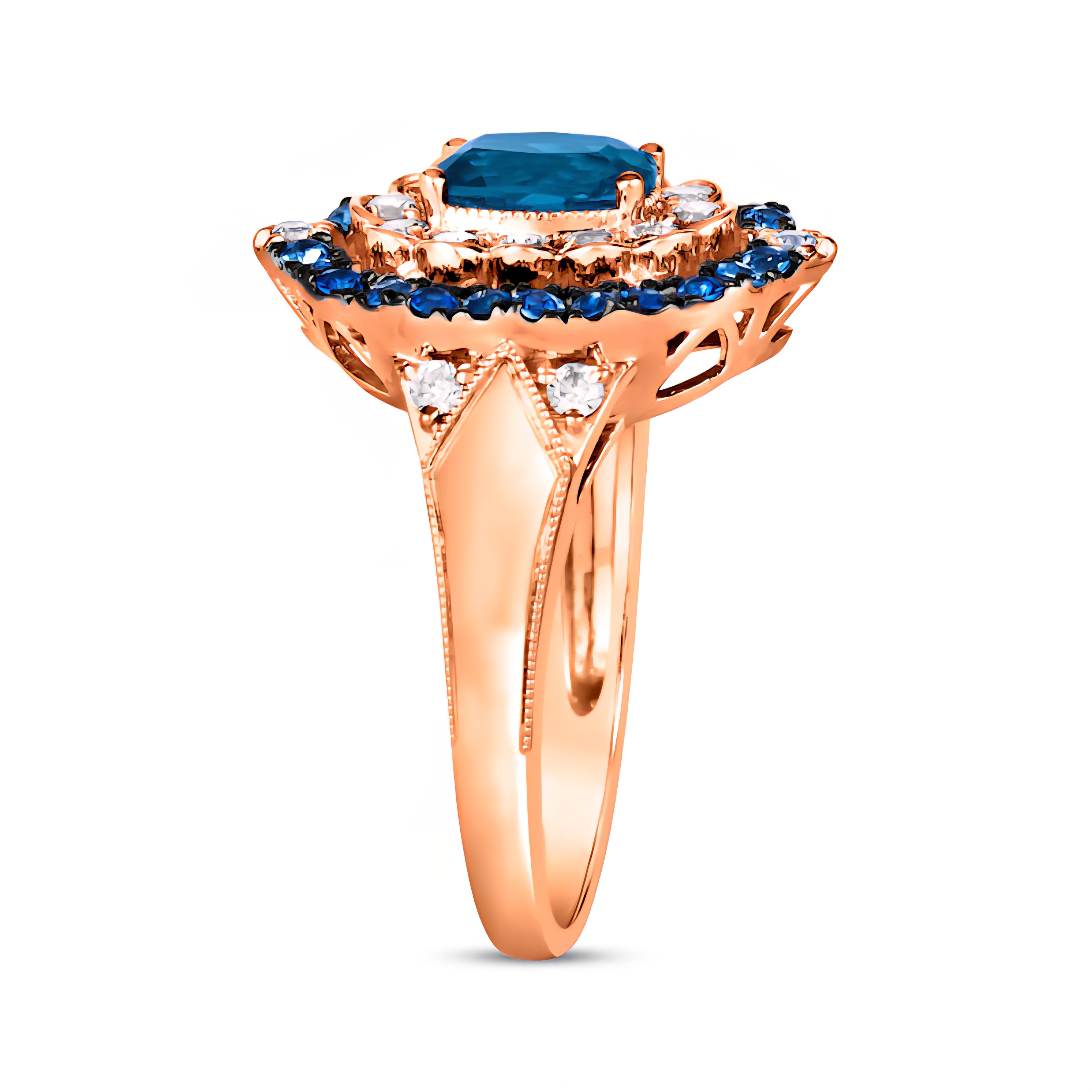 This ring brings architecture and artistry together in a way that refuses to blend in. At the center, a London Blue Topaz burns with its deep oceanic hue, rich and dramatic against warm rose gold. It’s wrapped first in a halo of white diamonds, set in a scalloped pattern that gives the design movement and softness. Around that, a second halo of royal blue sapphires sharpens the edges and adds intensity, enhanced by black rhodium that pulls every detail into focus. The split-shank design continues the brilliance with diamond accents, creating a layered effect that feels regal, bold, and built to command attention. This is a statement ring with presence — sophisticated, powerful, and unforgettable.