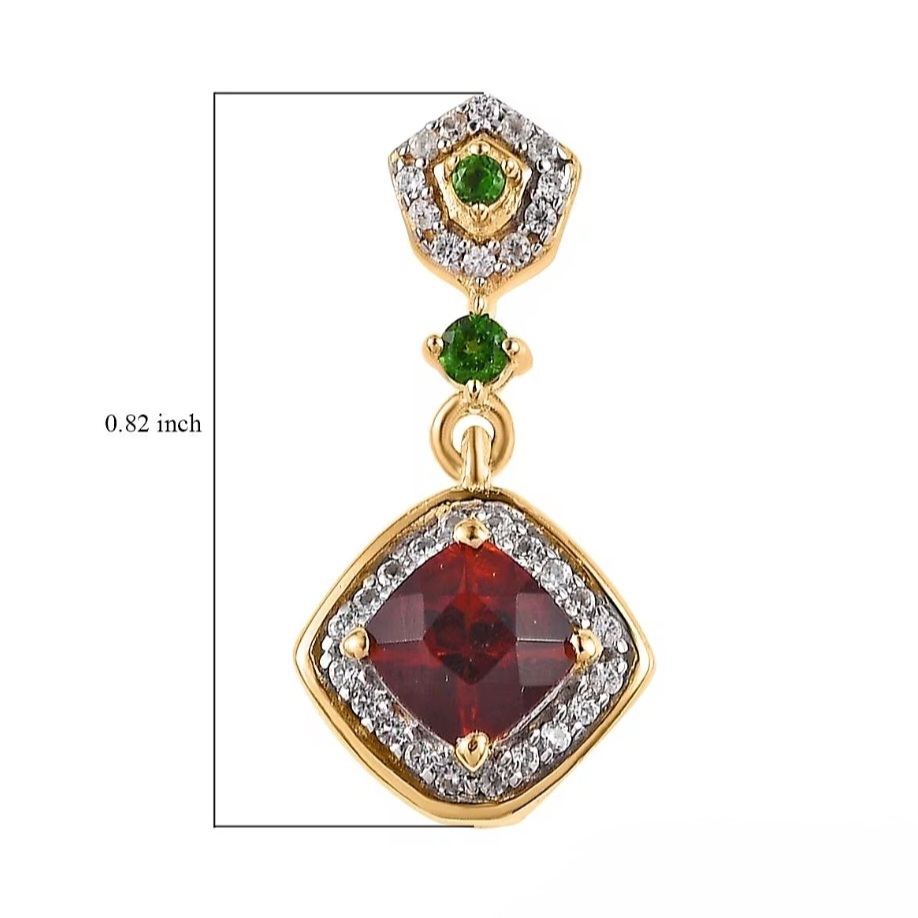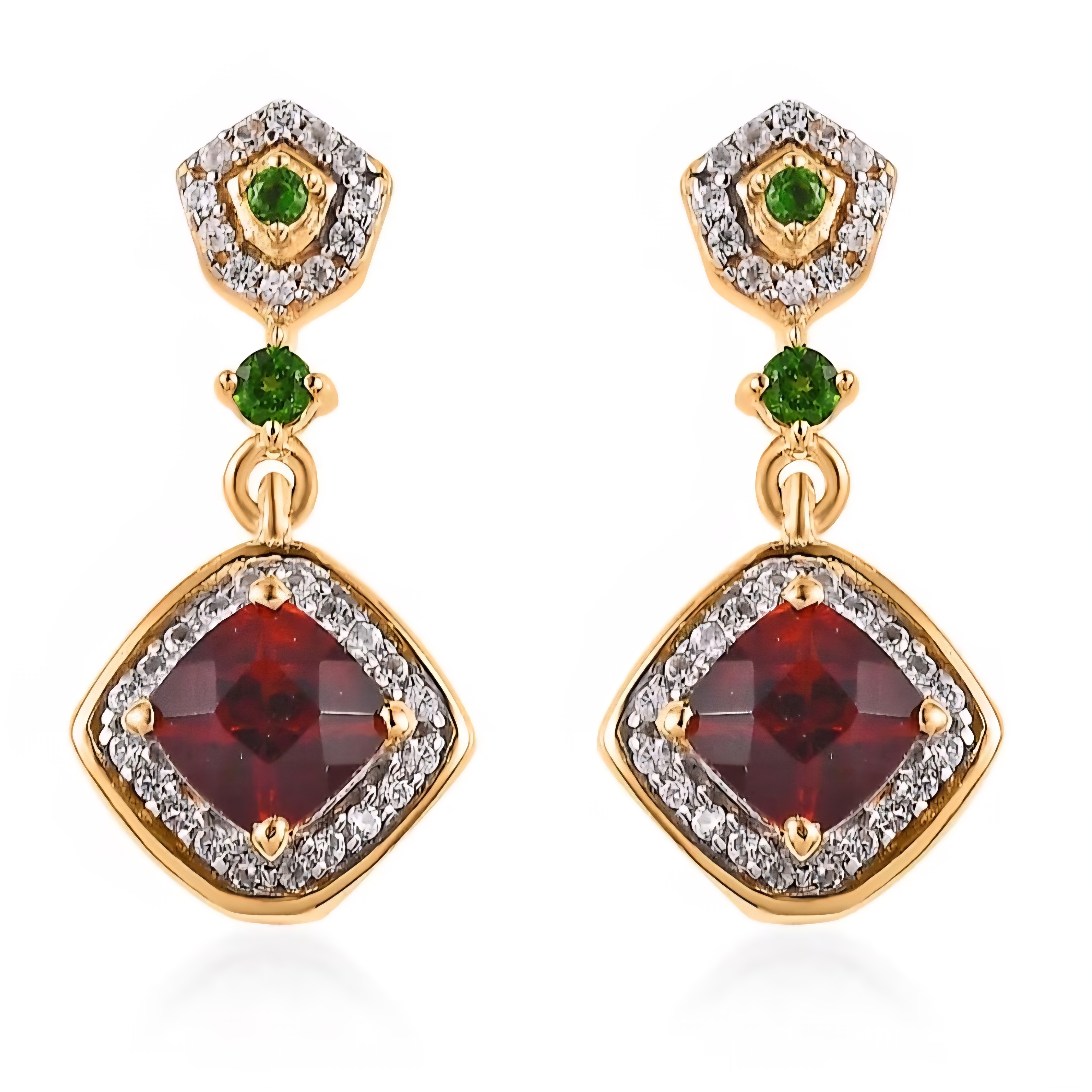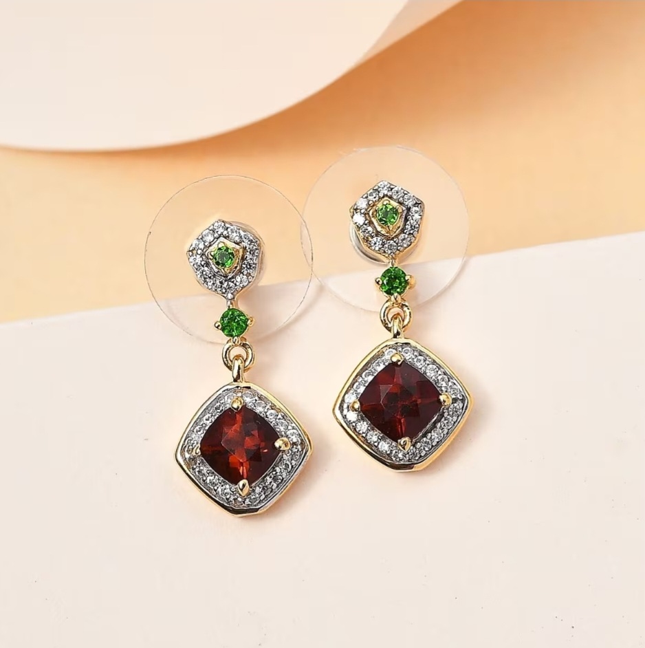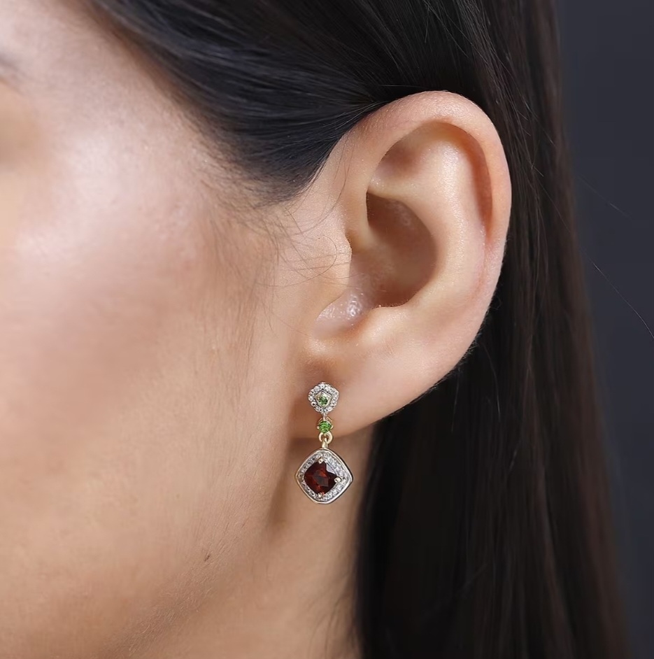 Set above, round Chrome Diopside stones introduce a flash of saturated green — a subtle yet striking counterbalance to the warmth below. The design’s symmetry and polish make them refined, while the fiery color pairing keeps them undeniably bold.