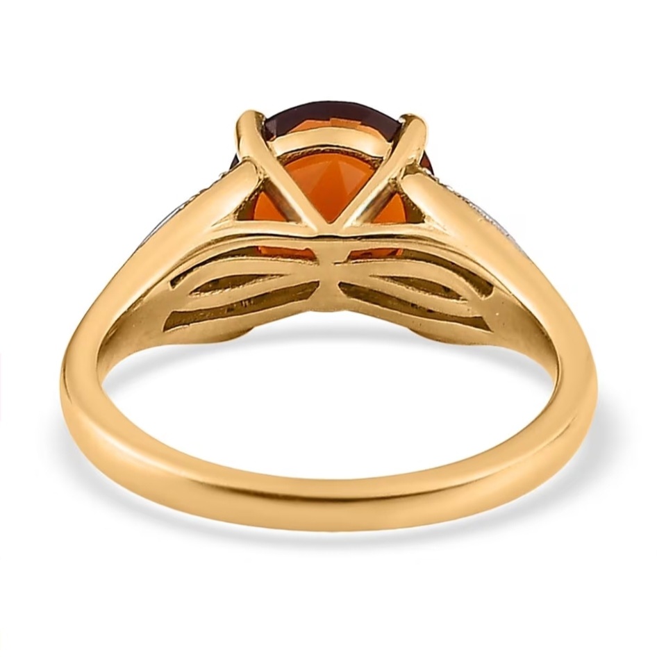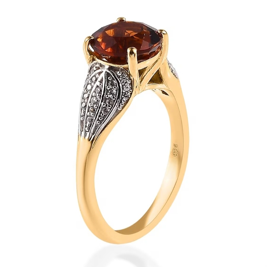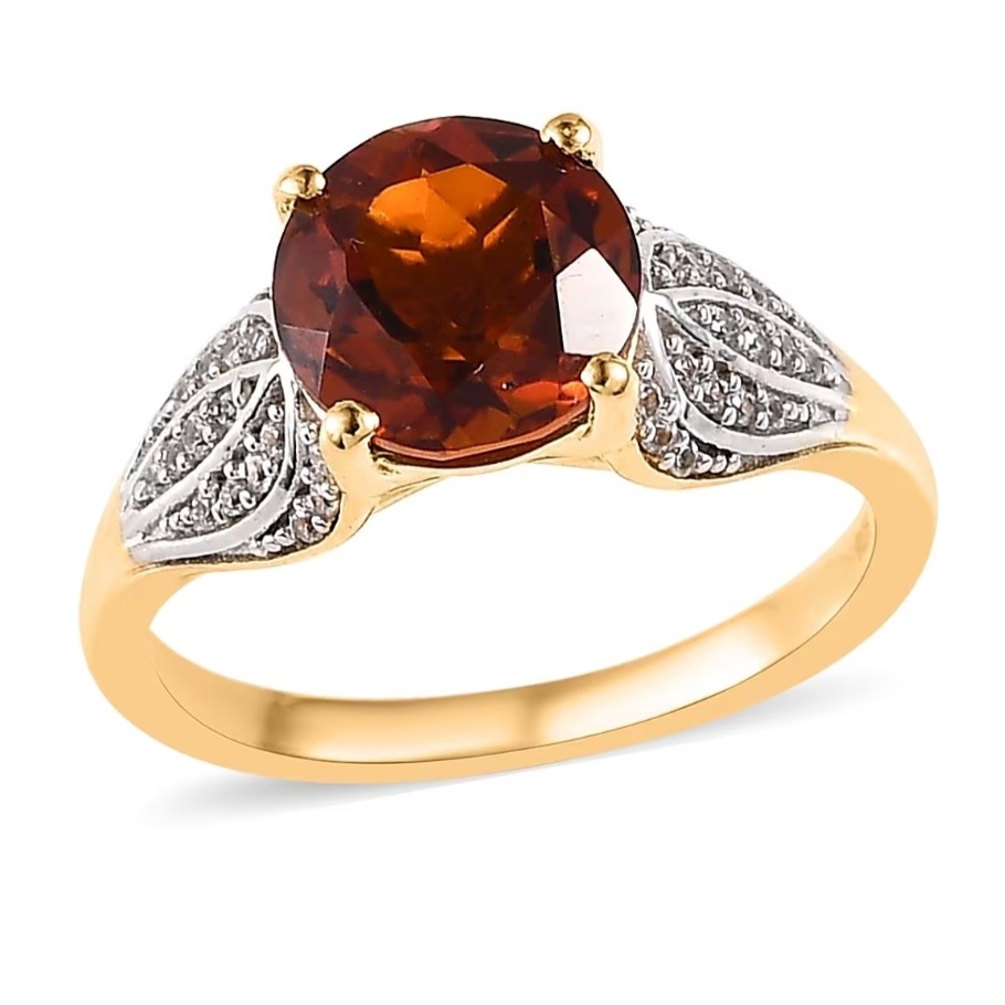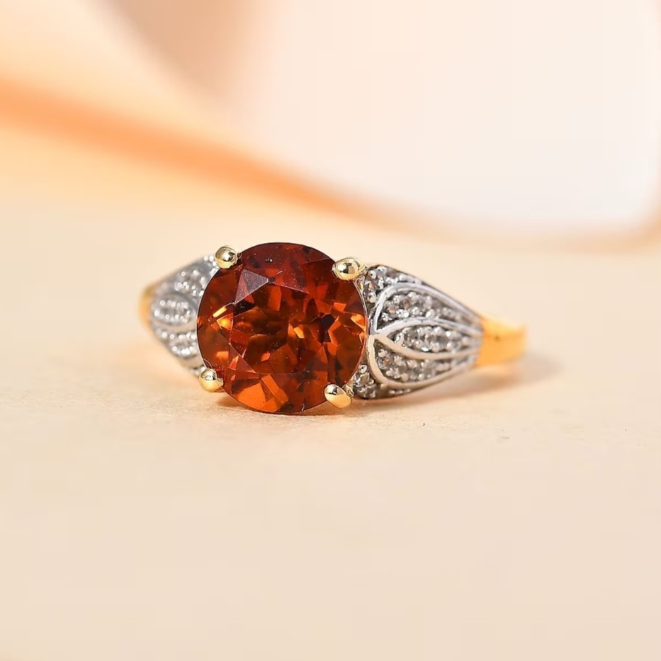This elegant ring highlights a vivid Brazilian Madeira Citrine at its center, glowing with a rich red-orange hue that defines this rare gemstone. White Zircon accents form graceful leaf-inspired shoulders, adding subtle sparkle that enhances the warmth and depth of the citrine’s color.