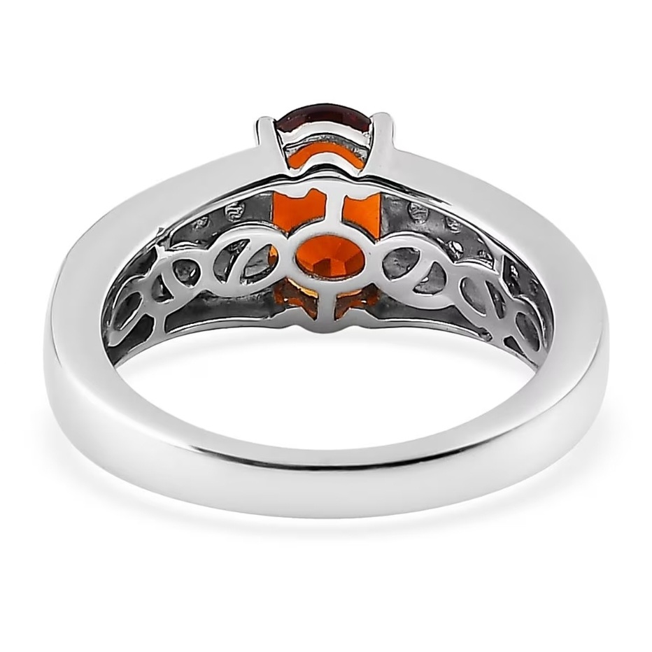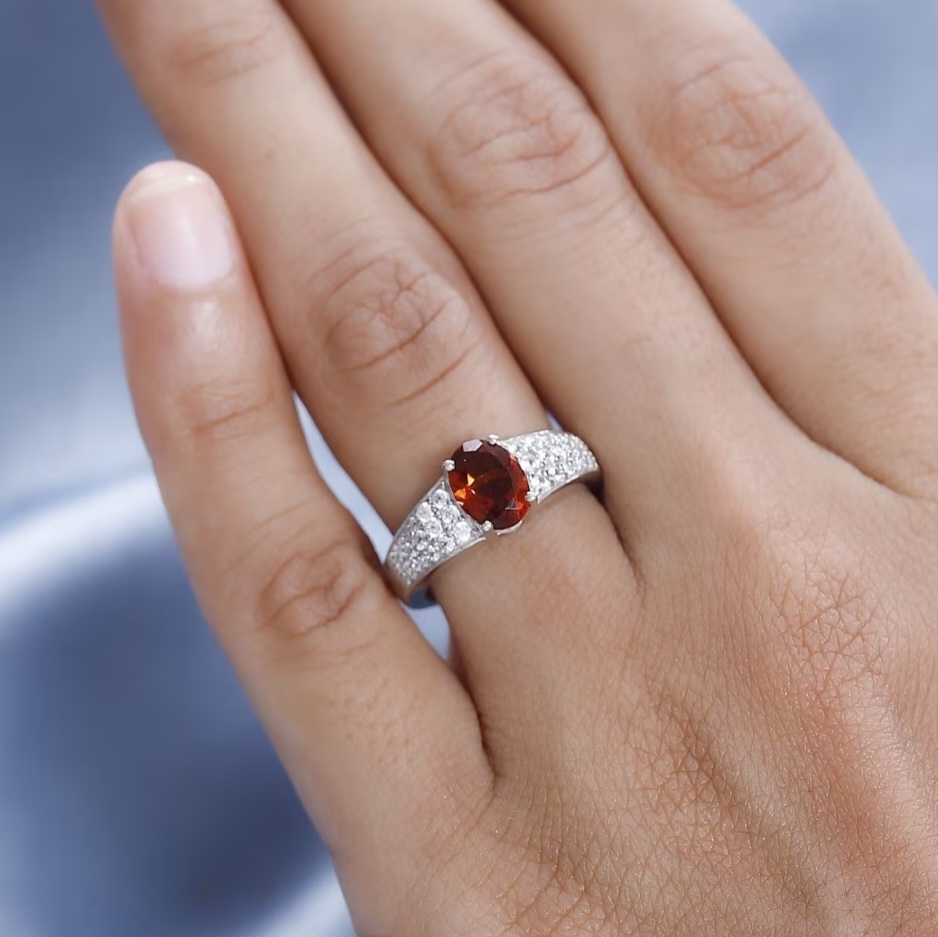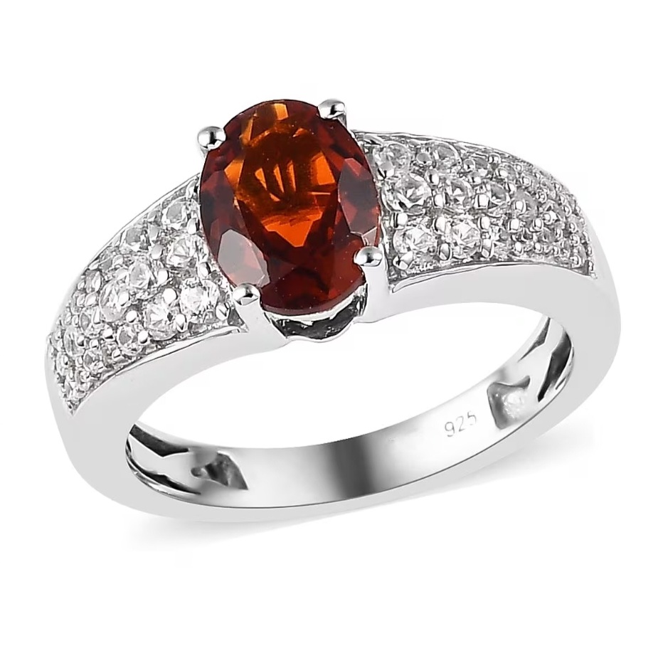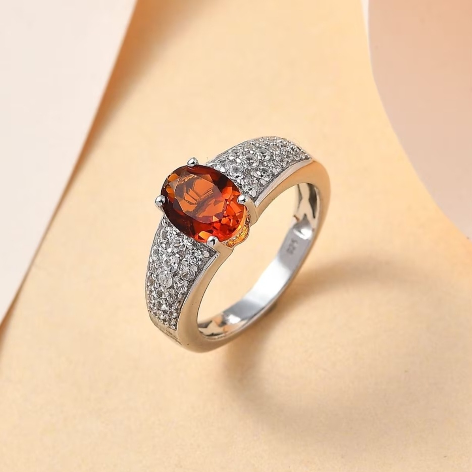 Classic design, fiery color. A rich Madeira Citrine brings deep, red-orange warmth to this timeless setting—brightened by precise pavé-set White Zircon across the shoulders. The layout is traditional but never dull, built to showcase the contrast of heat and light that makes citrine unmistakable.