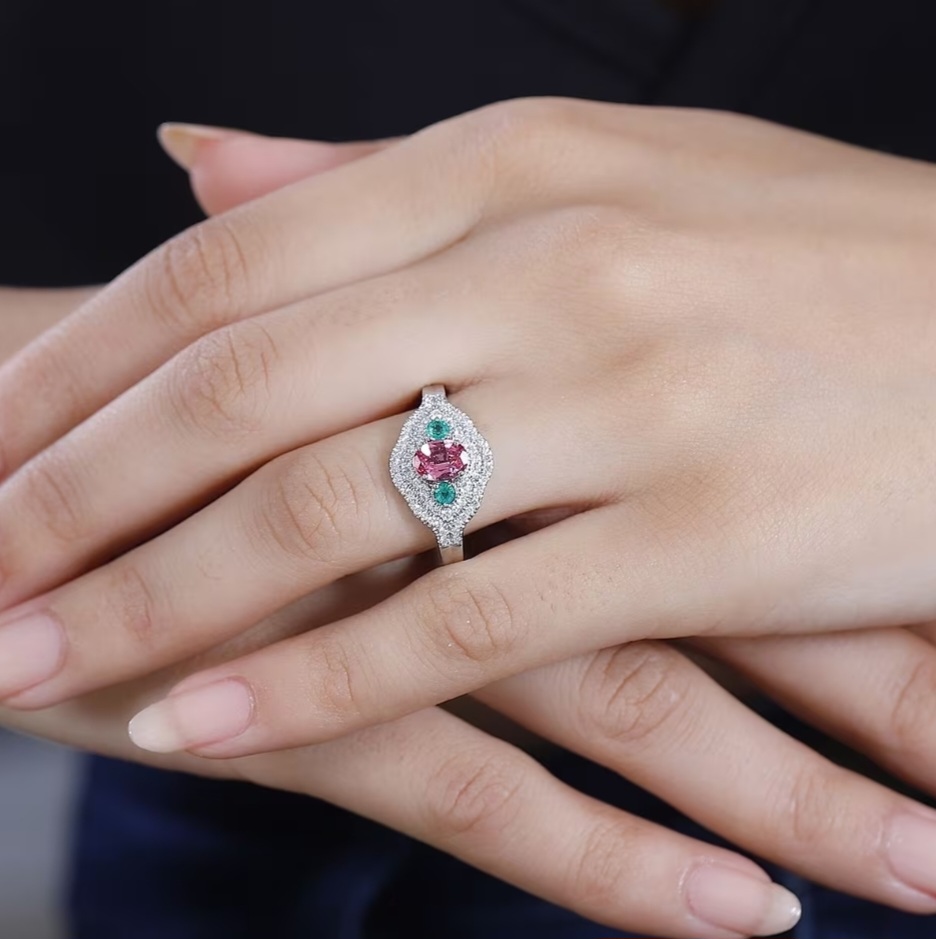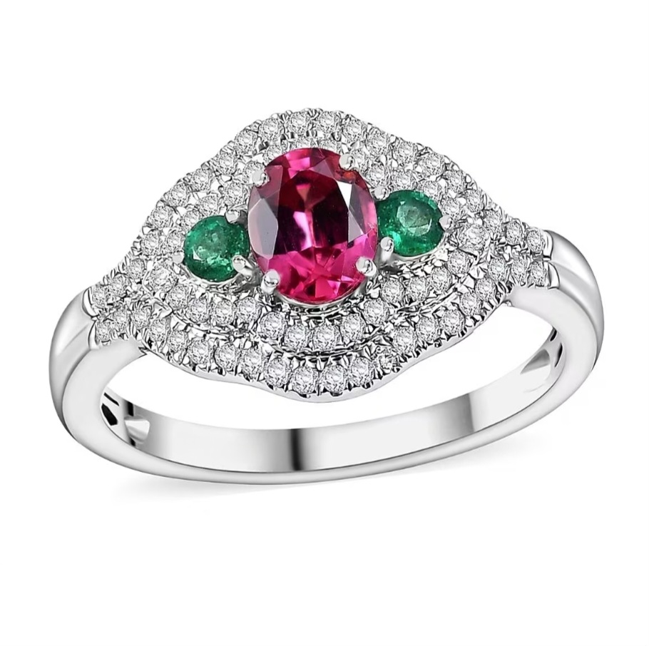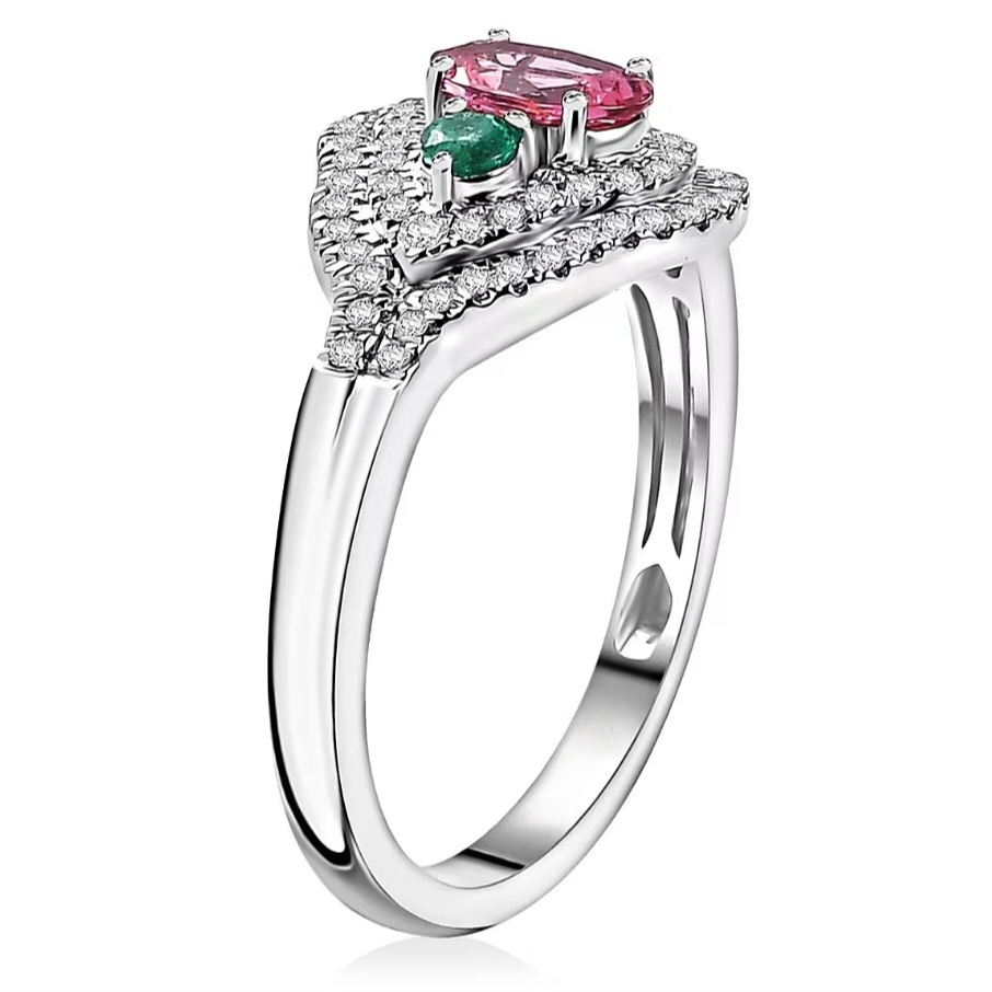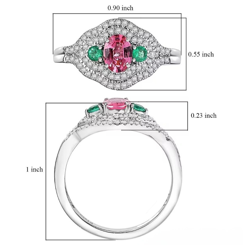 This Mahenge pink spinel ring is pure fine-jewelry energy. A vivid 0.60ct oval spinel from Mahenge commands the center with its intensely saturated hot pink glow — clean, lively, and unmistakably rare. On either side, rich Colombian emeralds add a sharp flash of green contrast, while a halo and split-shoulder array of E–F color VS diamonds deliver precision sparkle and serious presence. The color combination is bold but refined, striking that perfect balance between high-end statement and timeless elegance. Crafted in solid 950 platinum for weight, durability, and heirloom longevity, this is a true luxury piece built for collectors who understand fine gemstones.