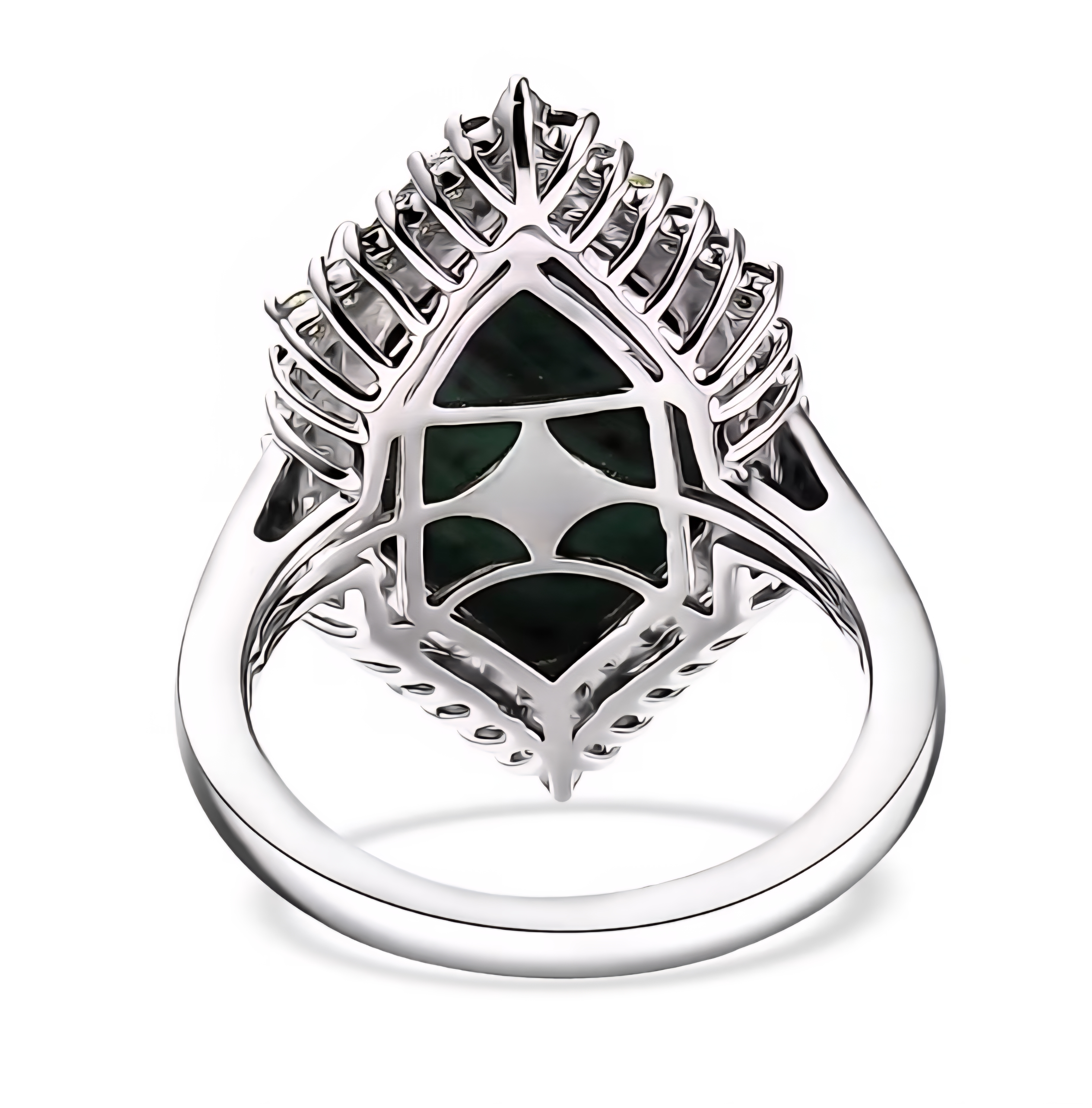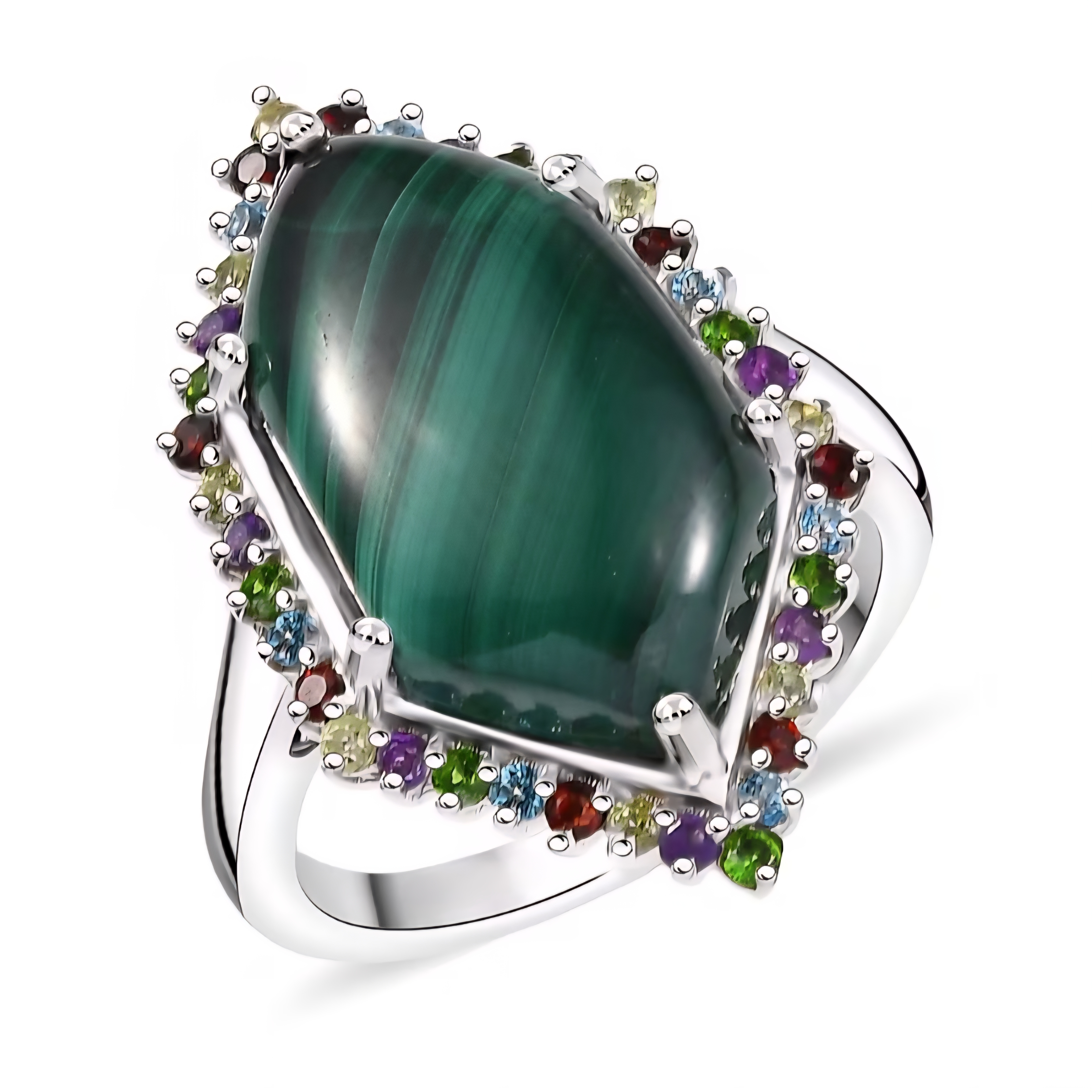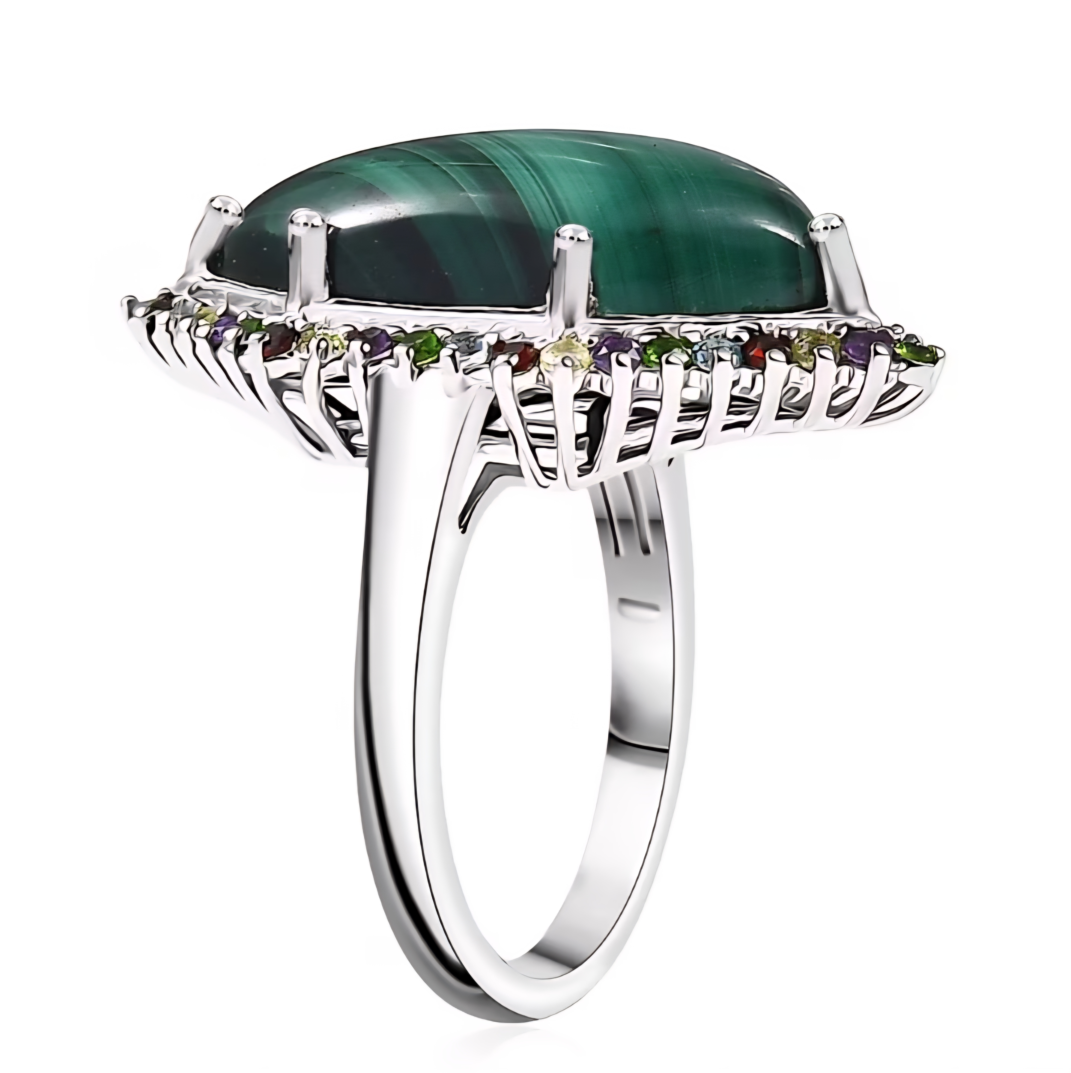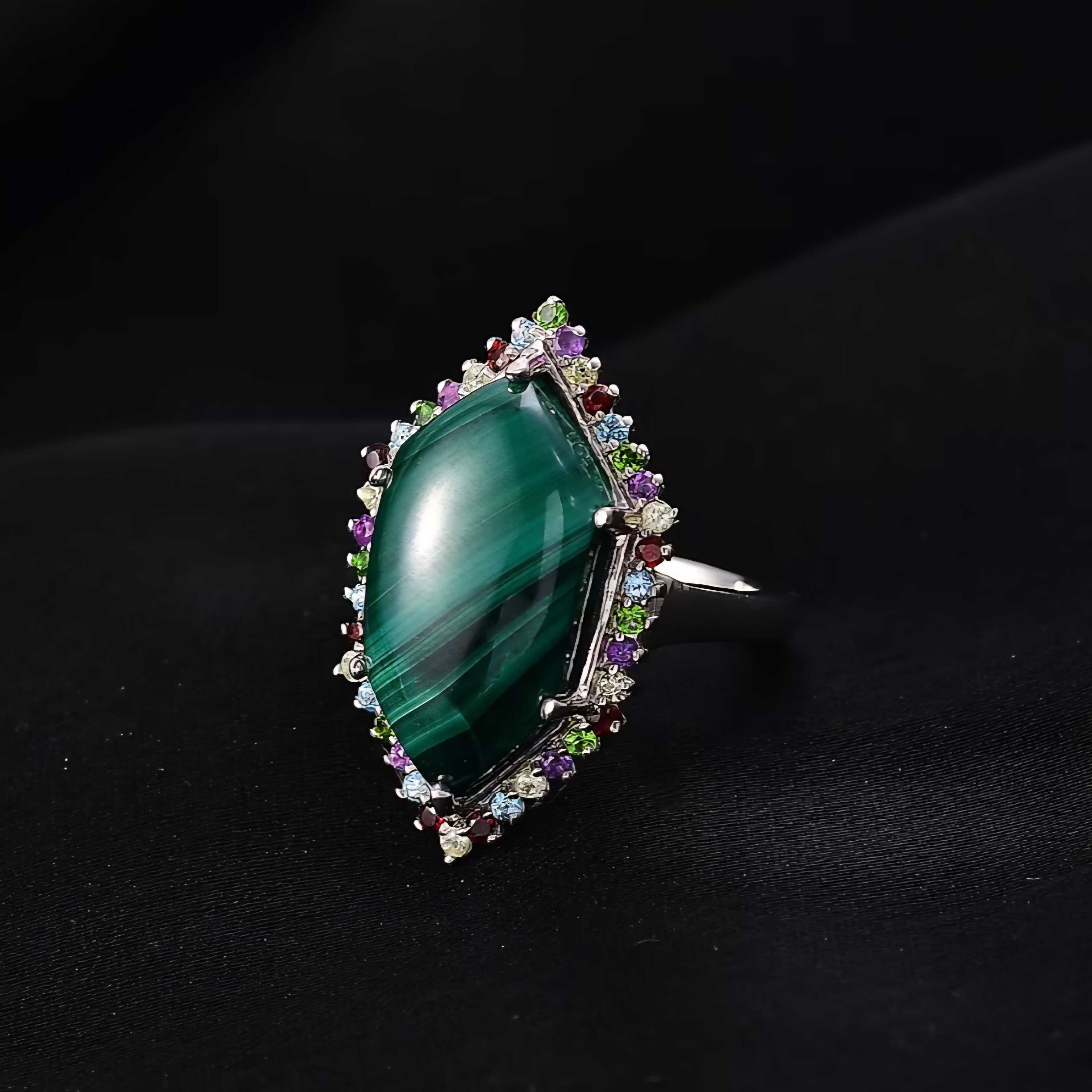 Finished in bright rhodium over solid sterling silver, the setting stays crisp and mirror clean, giving the ring a modern edge while the malachite brings the natural drama.