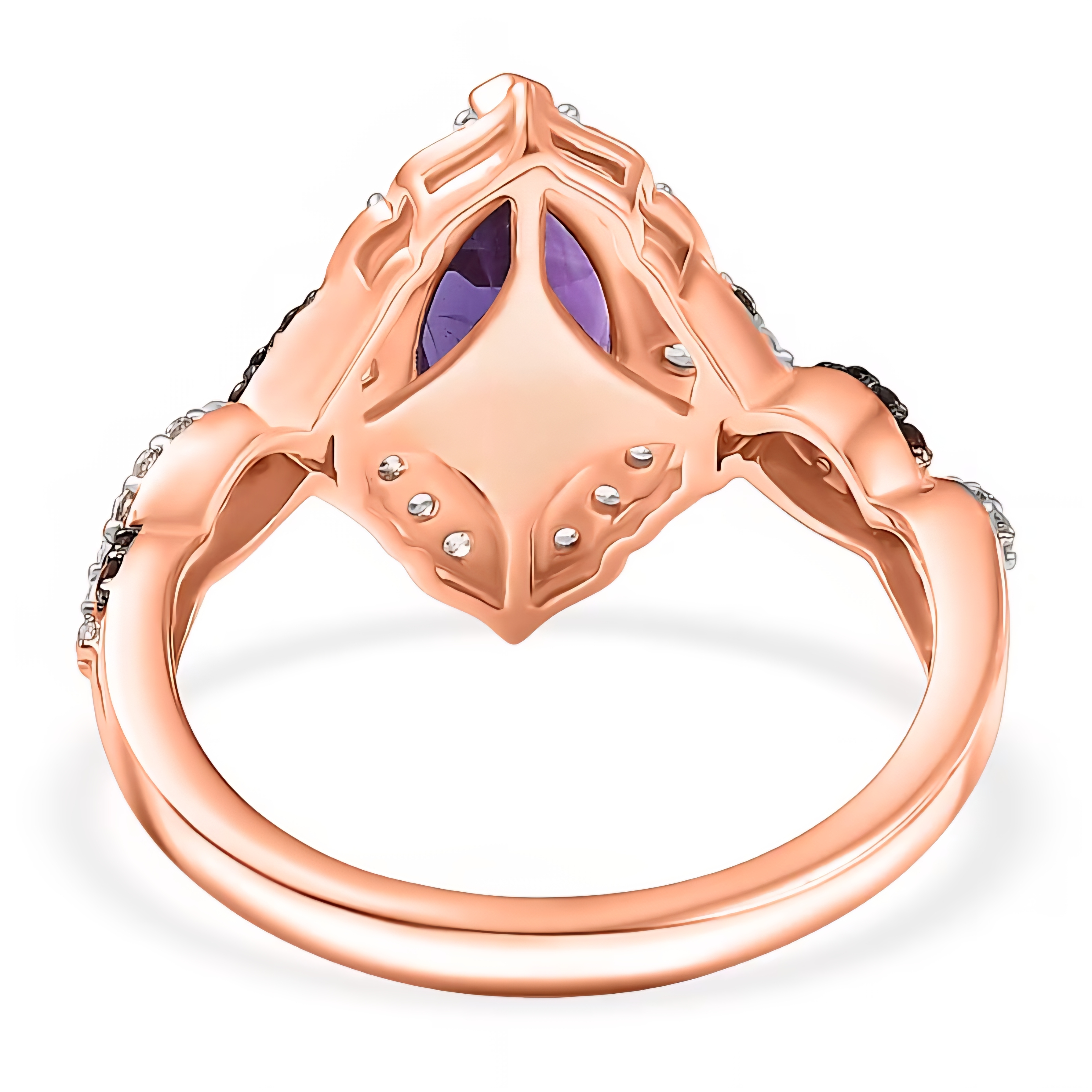 A 1.61ct marquise cut amethyst commands this design with rich purple saturation and sharp, elongated lines that naturally flatter the finger. The marquise shape dates back to French royalty and is known for its dramatic points and elegant silhouette.