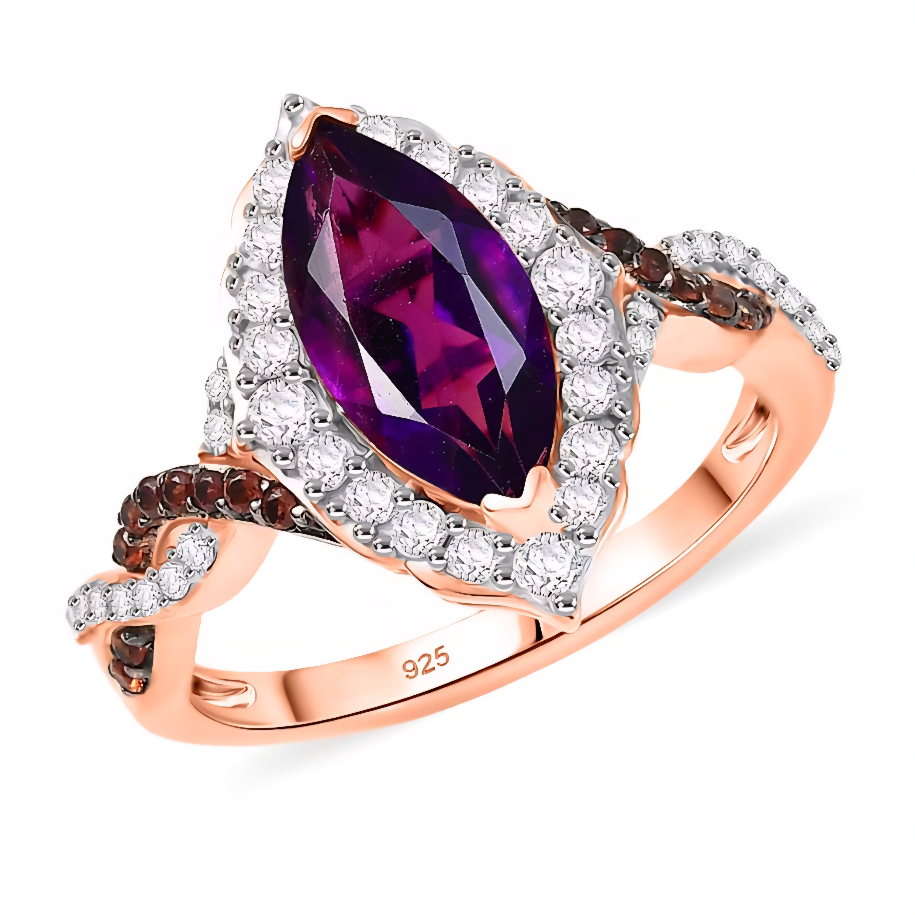 Finished in 18K rose gold over solid sterling silver with black and white rhodium detailing, this piece blends warmth, contrast, and structure into one bold 2.50 carat statement.