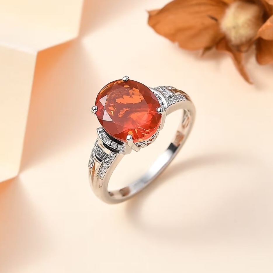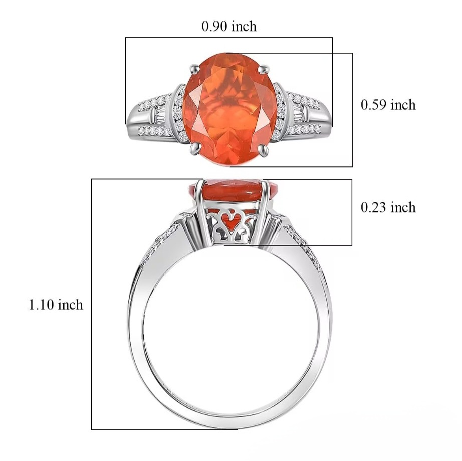 This design is the definition of refined fire. A 12x10mm Mexican Fire Opal commands attention with its glowing orange body color — pure, vibrant, and alive with light. On each shoulder, natural diamonds in both round and tapered baguette cuts trace the path toward the center, mirroring the opal’s flame with clean, icy precision.
