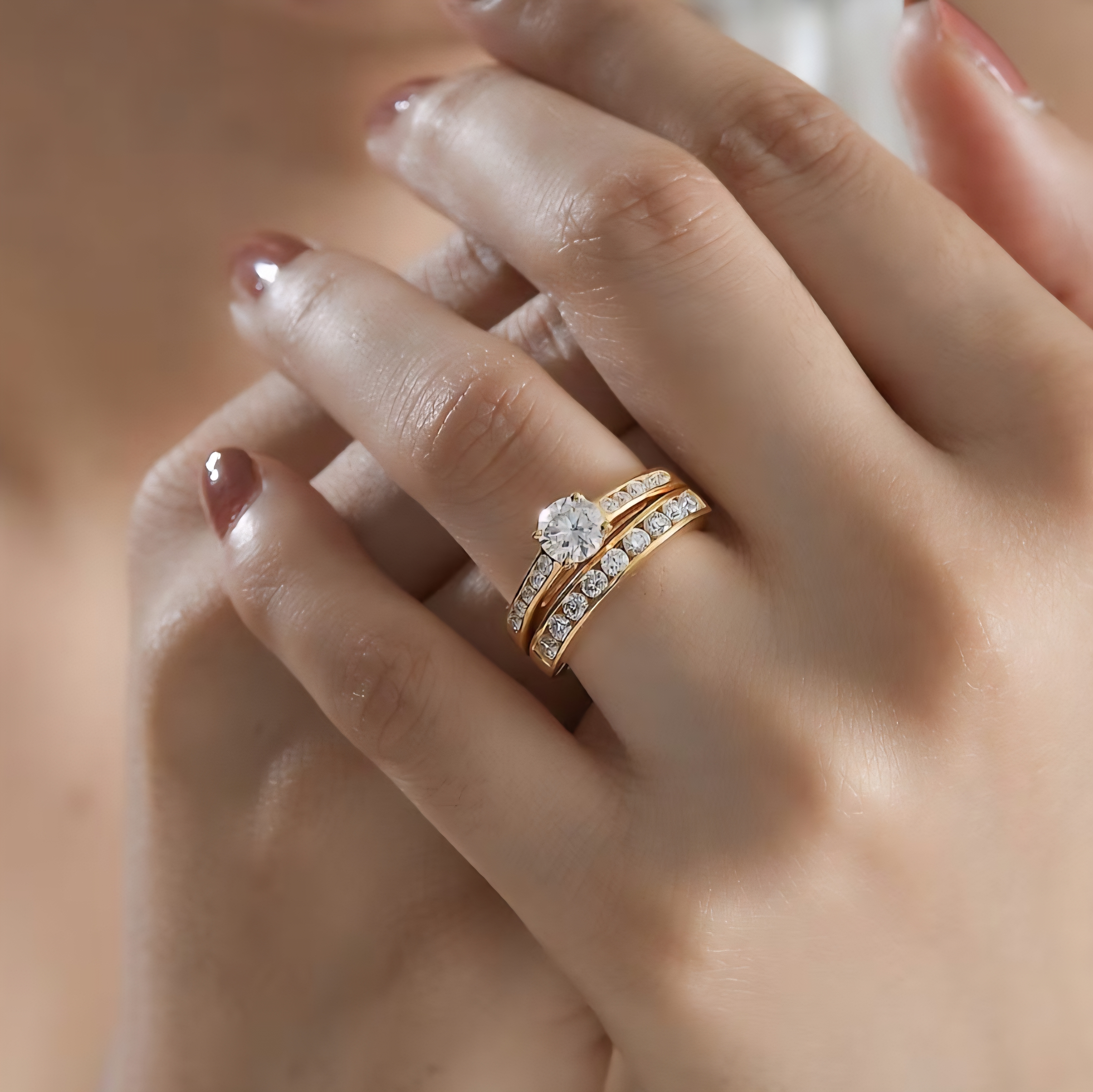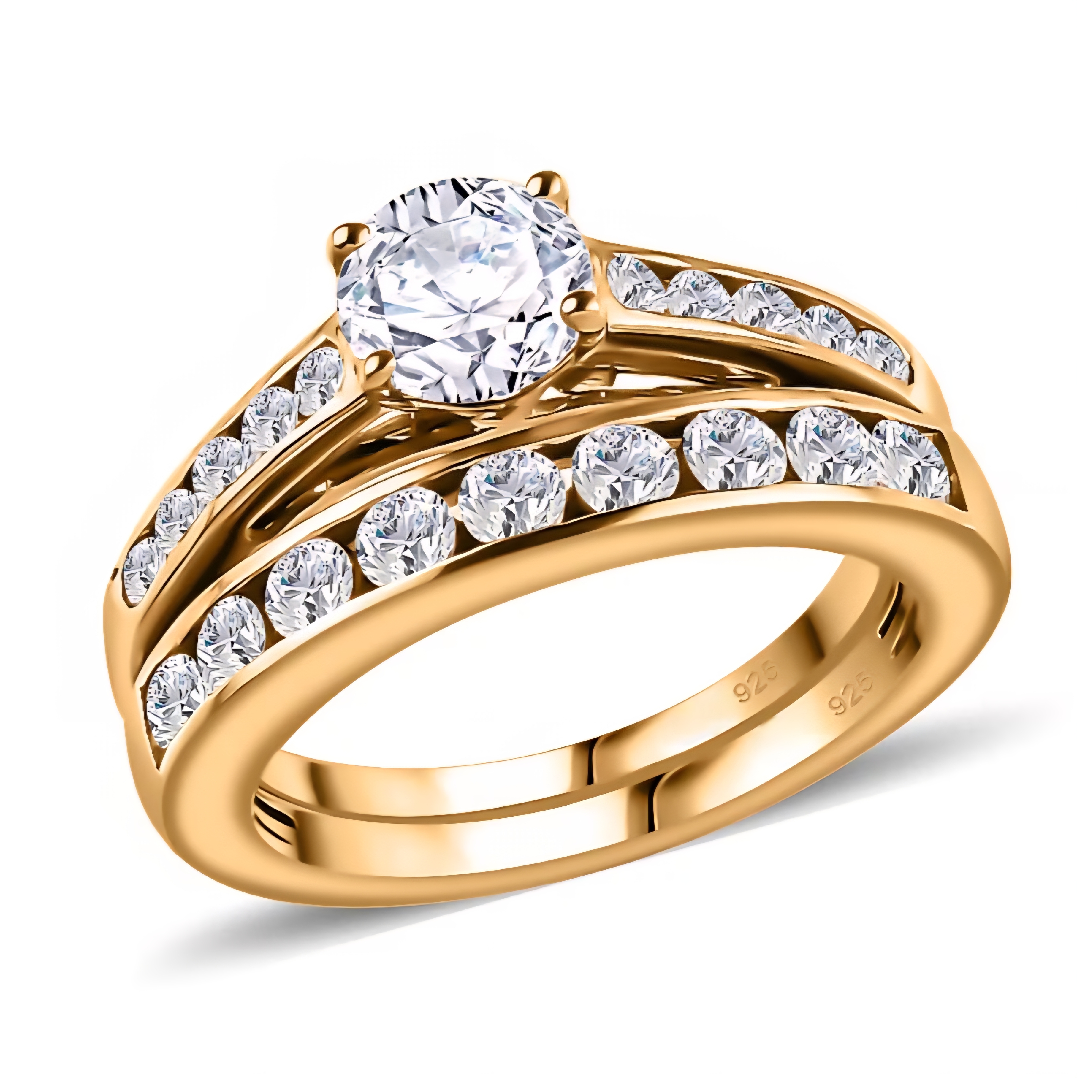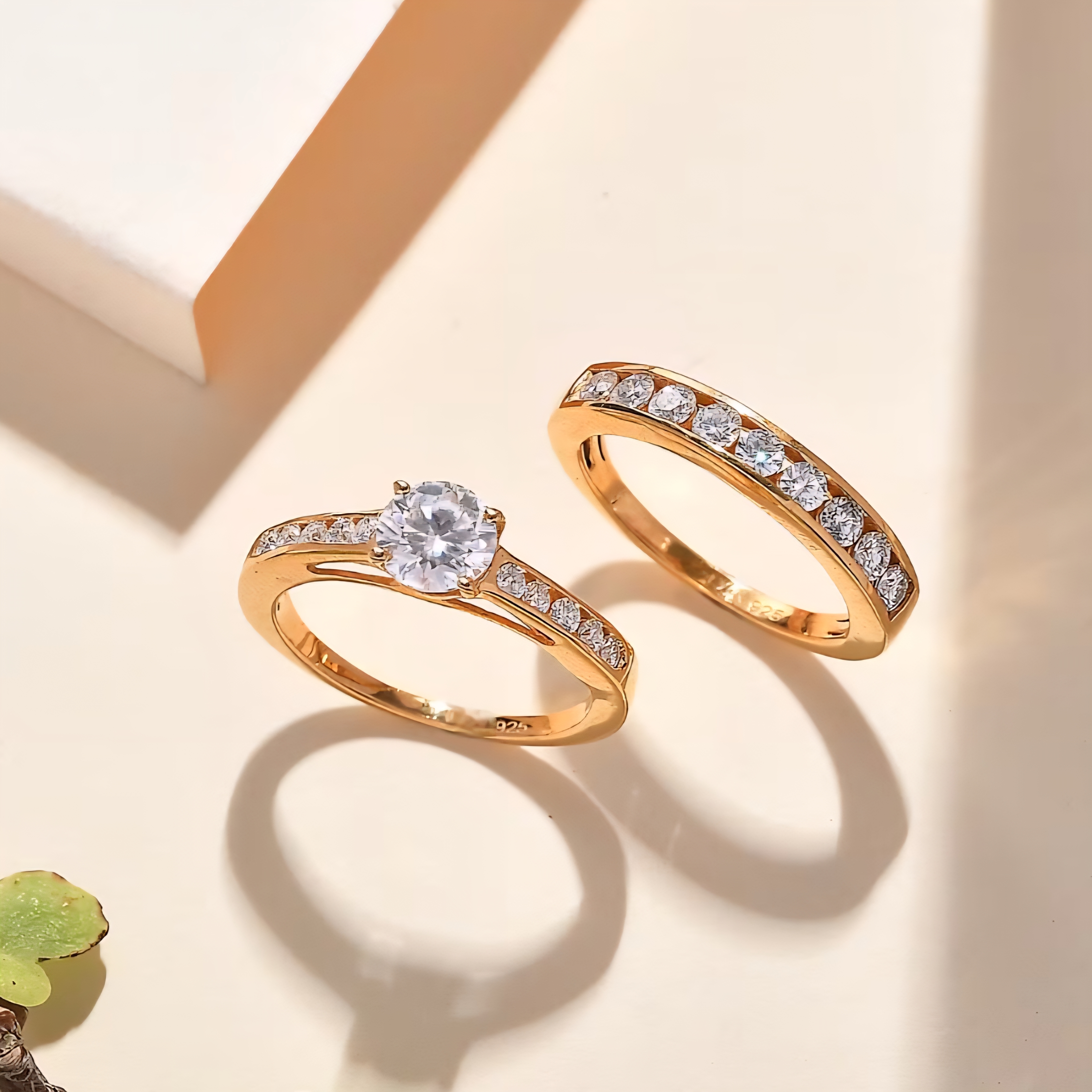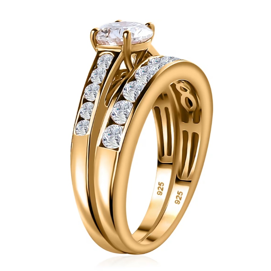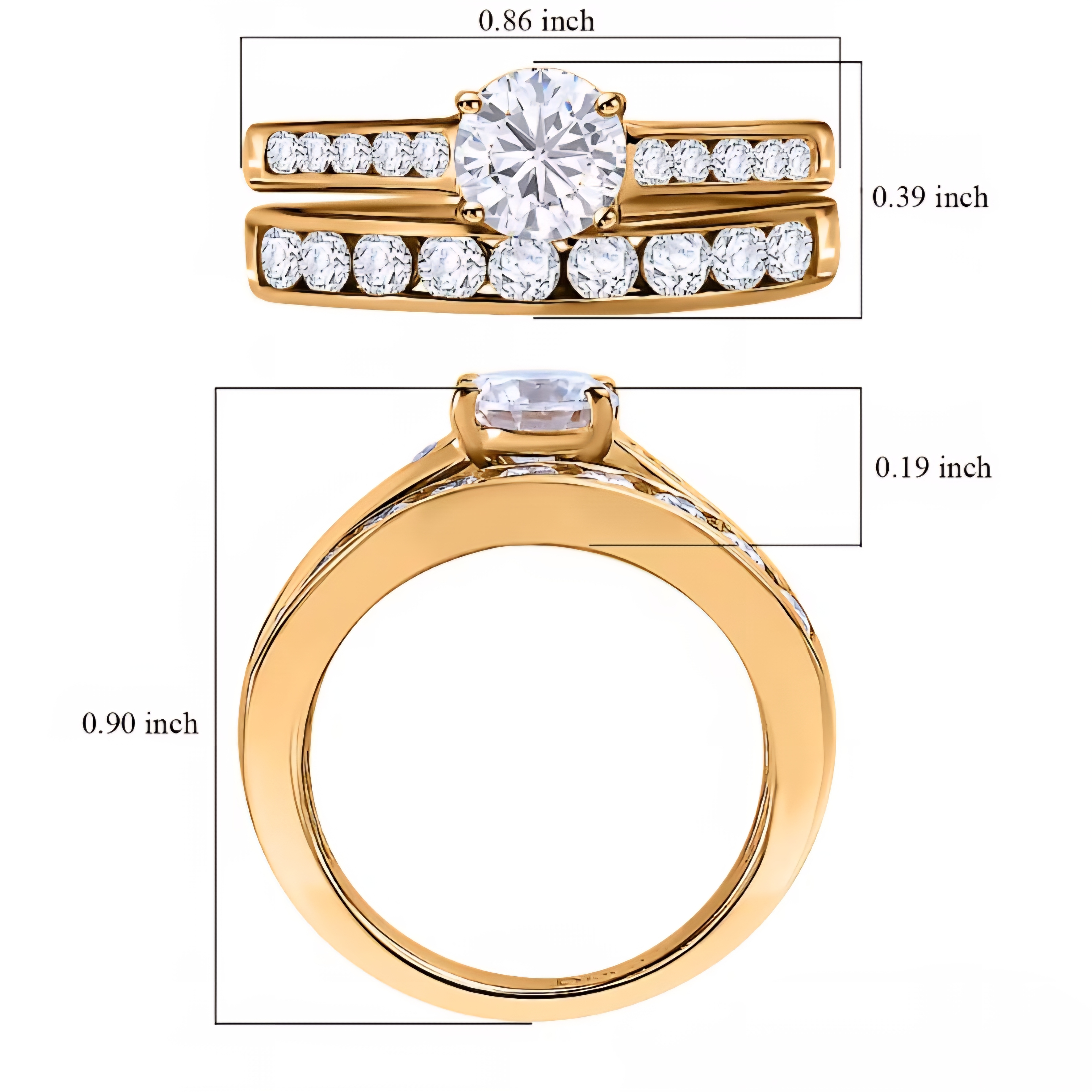 This classic bridal ring set features a brilliant round colorless moissanite center stone paired with a matching band designed to sit perfectly alongside it. Additional round moissanite accents add sparkle along the shoulders and across the coordinating band, creating a clean, timeless look with balanced brilliance from every angle. Crafted in solid 925 sterling silver and finished in 18K yellow gold plating, this two piece set delivers the warmth of yellow gold with the fire and sparkle moissanite is known for.