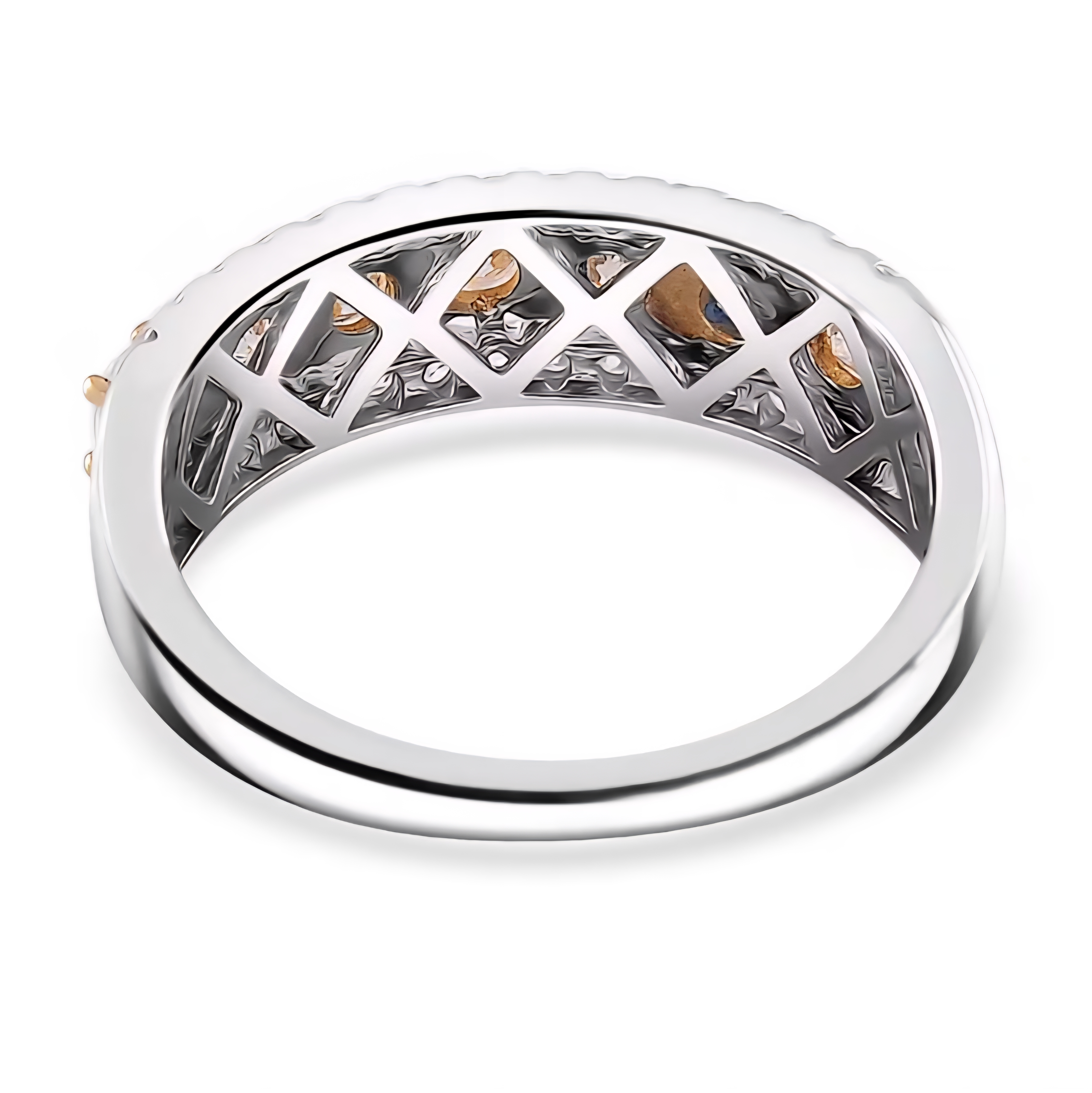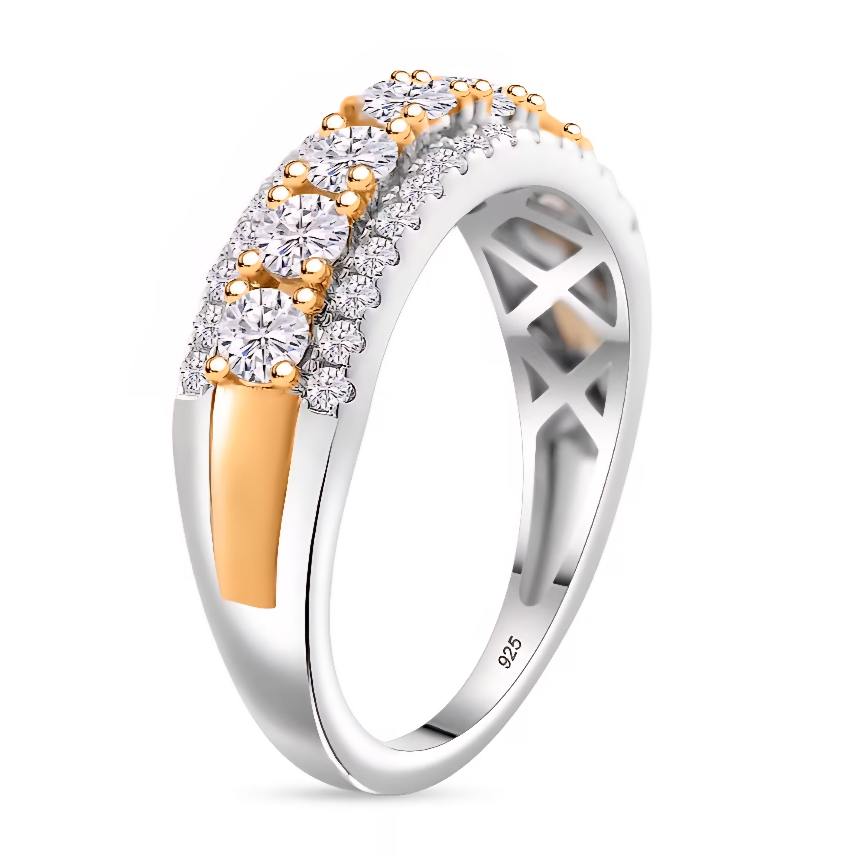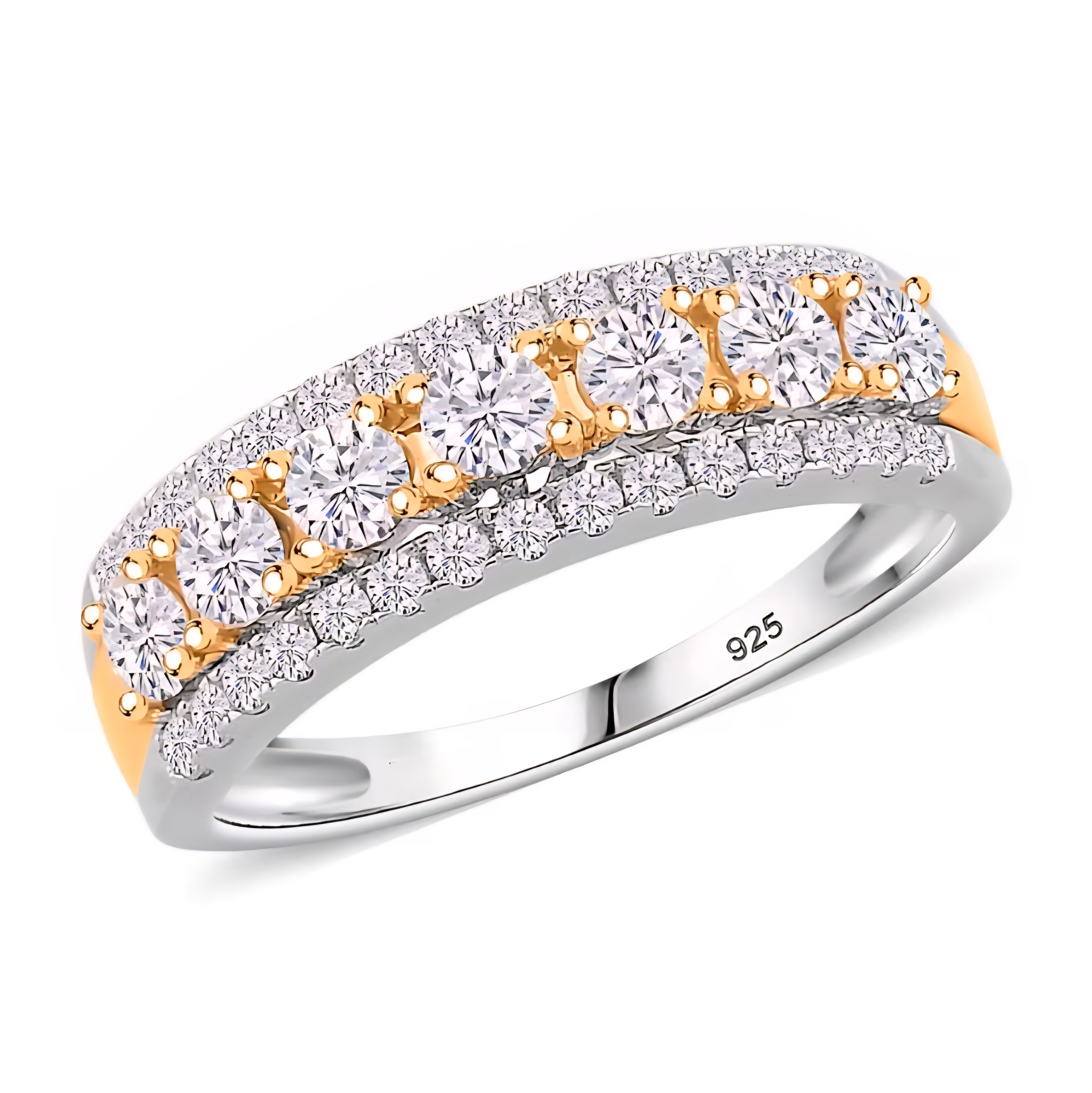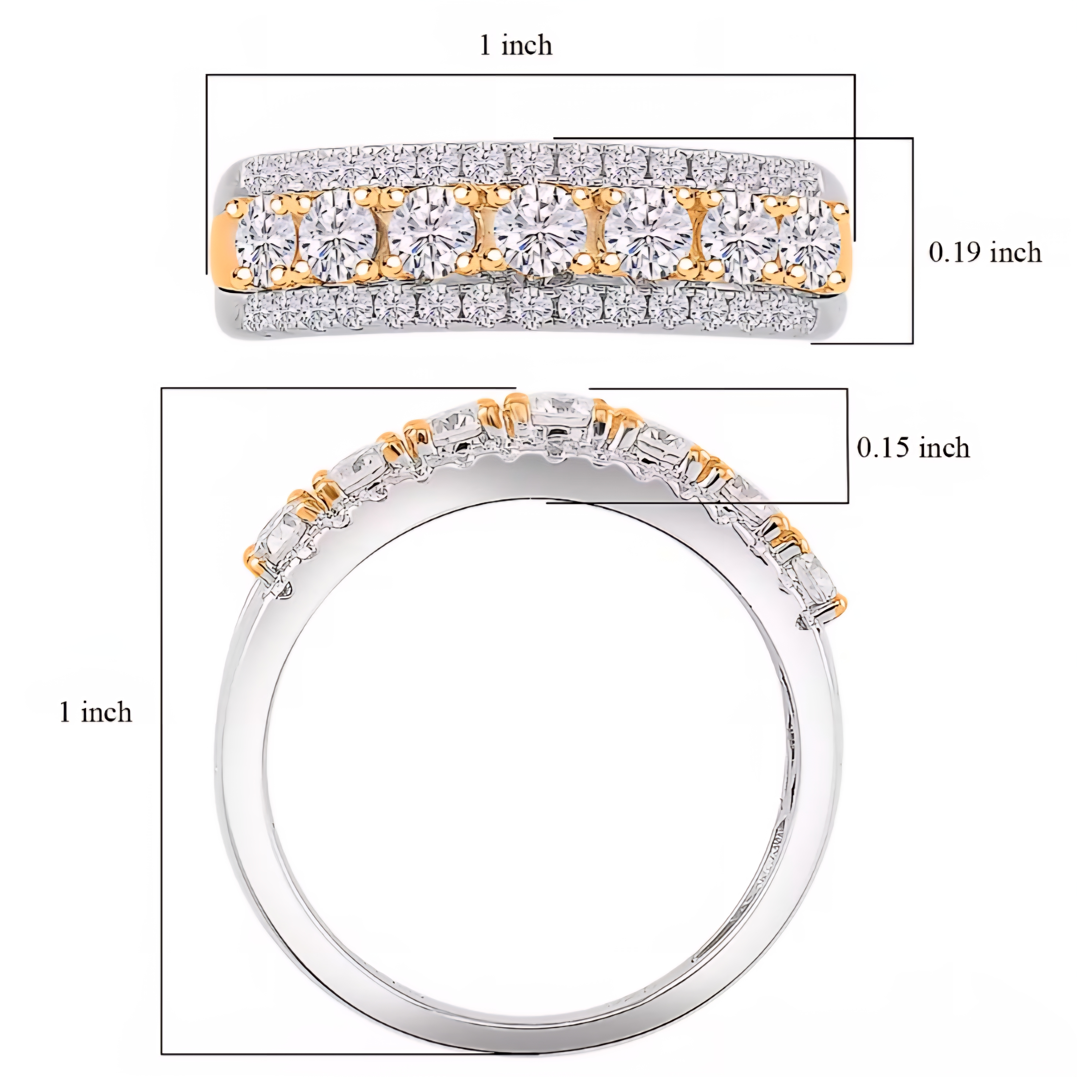 This moissanite band ring delivers a clean, elevated look with serious brilliance. A row of larger round colorless moissanite is framed by shimmering accent stones for a full, dimensional sparkle across the top of the band. Crafted in solid 925 sterling silver and finished in a two tone blend of 18K yellow gold and rhodium plating, it has the contrast of classic mixed metal with the fire moissanite is known for.